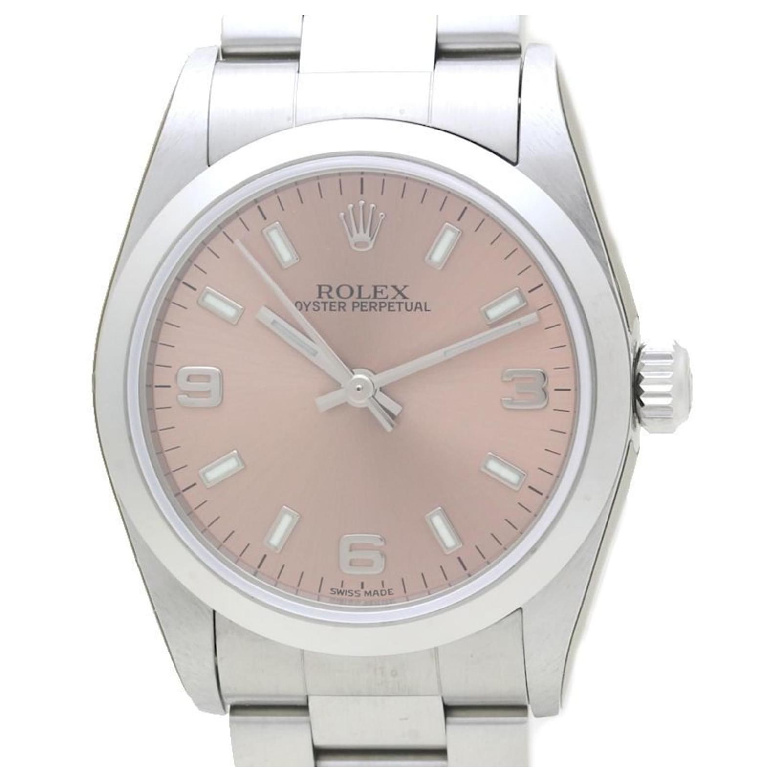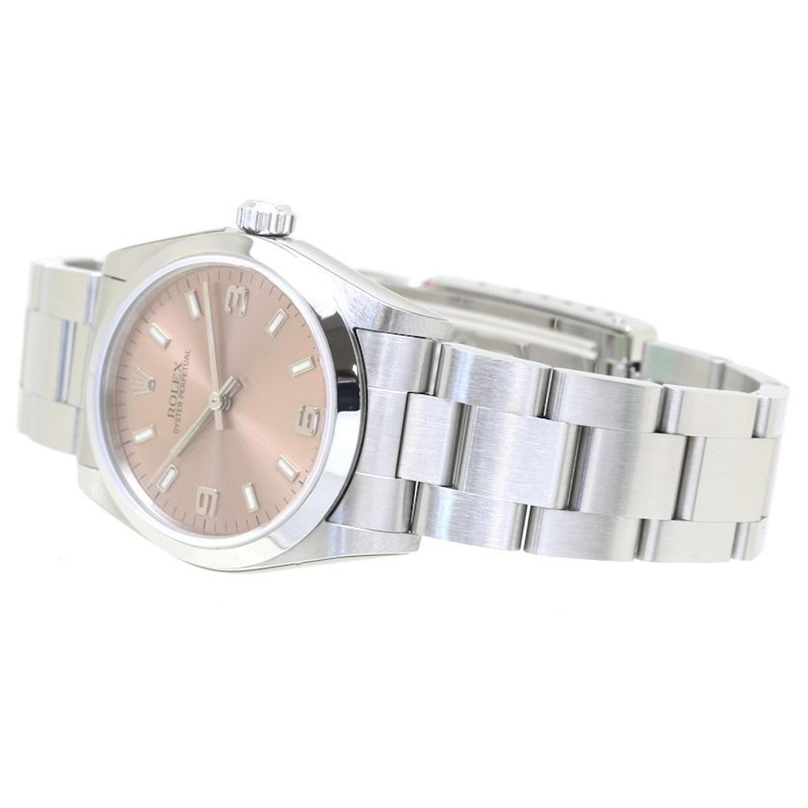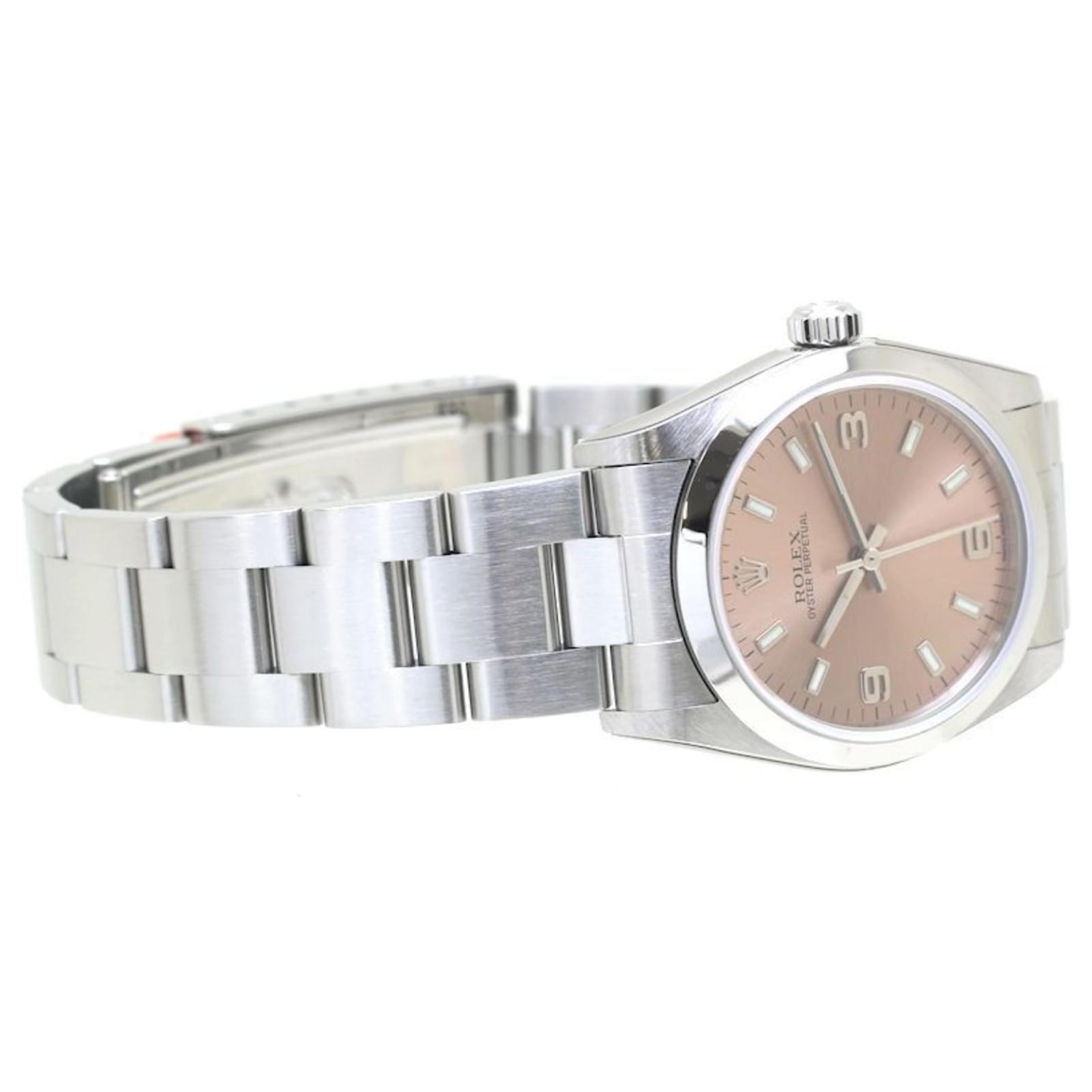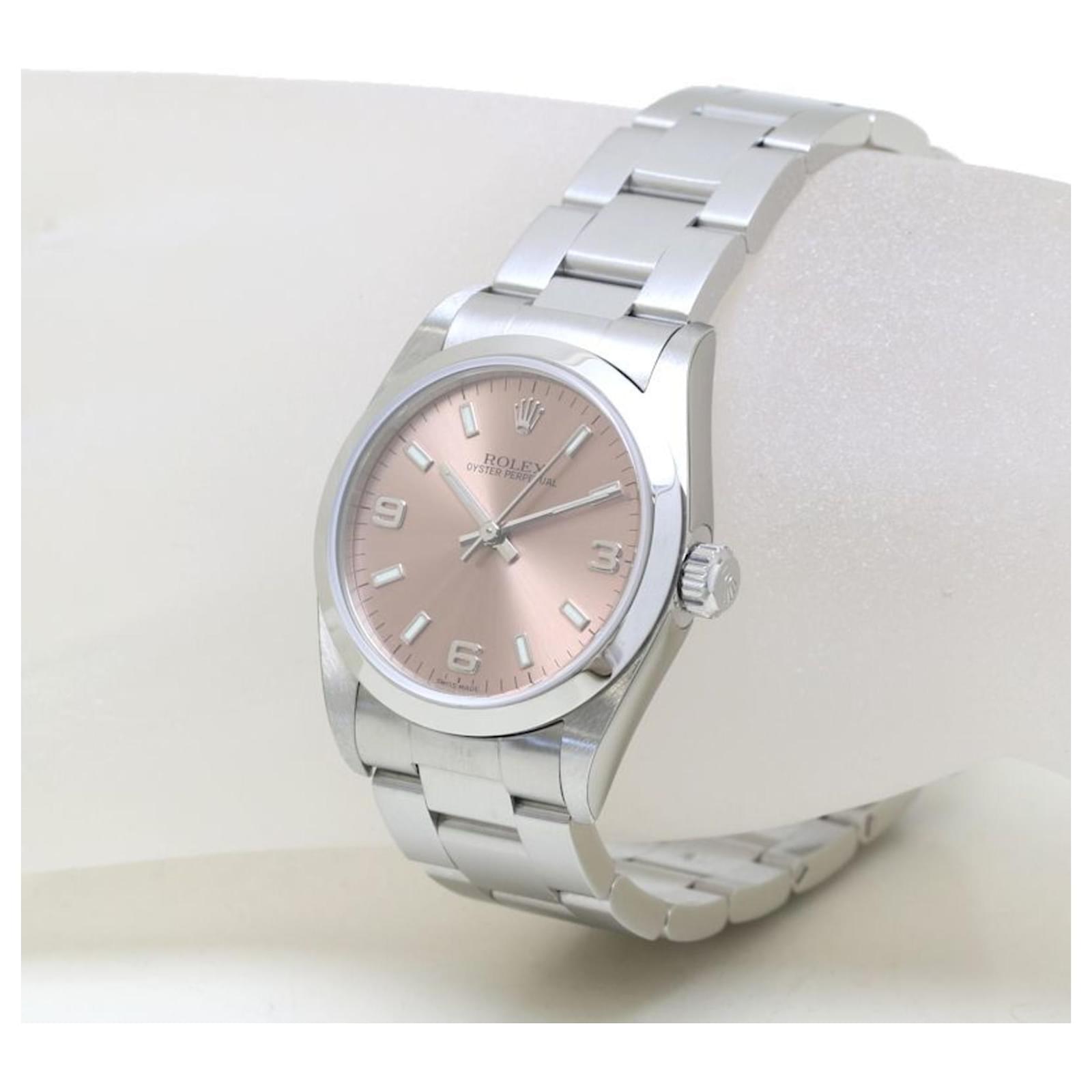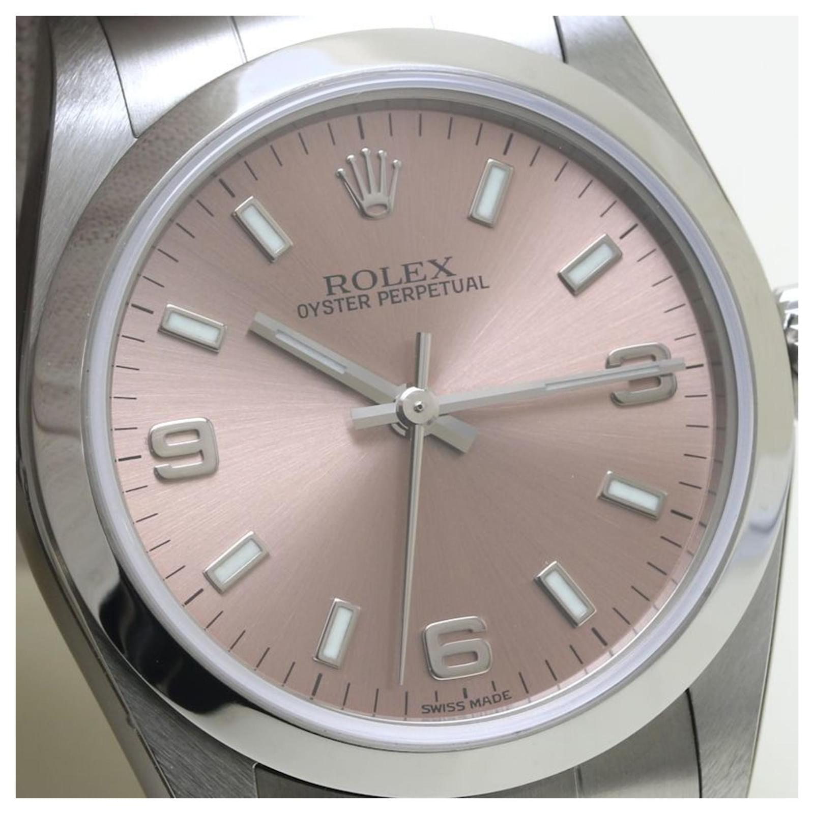 The Rolex Oyster Perpetual wristwatch features a pink dial and is crafted from stainless steel, both in the case and the band. This self-winding automatic timepiece has a case diameter of 31mm and is suitable for a wrist size of 18.5cm (7.28 inches). The watch is in opened but never used condition, with insignificant scratches on the bezel, case, and bracelet, while the dial and glass remain free from any scratches. Included with the watch are a certificate, inner box, manual, and outer box. Potential buyers are encouraged to review the images for a detailed view of the item's condition and included accessories.