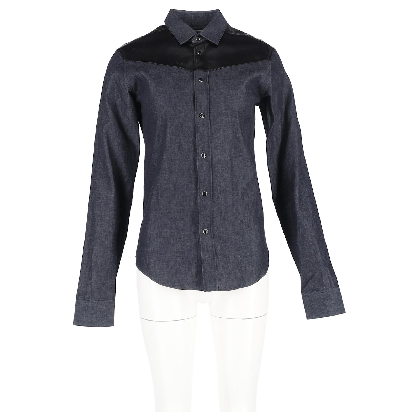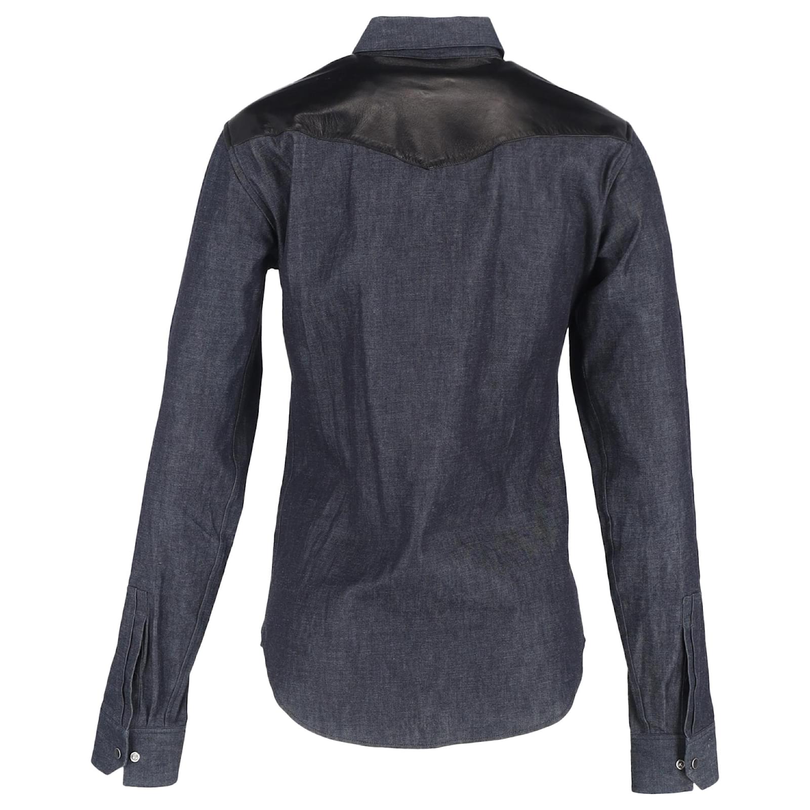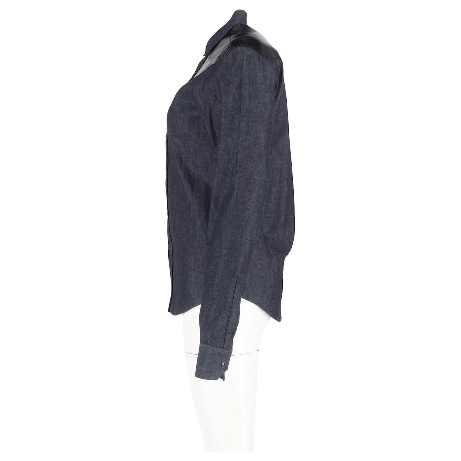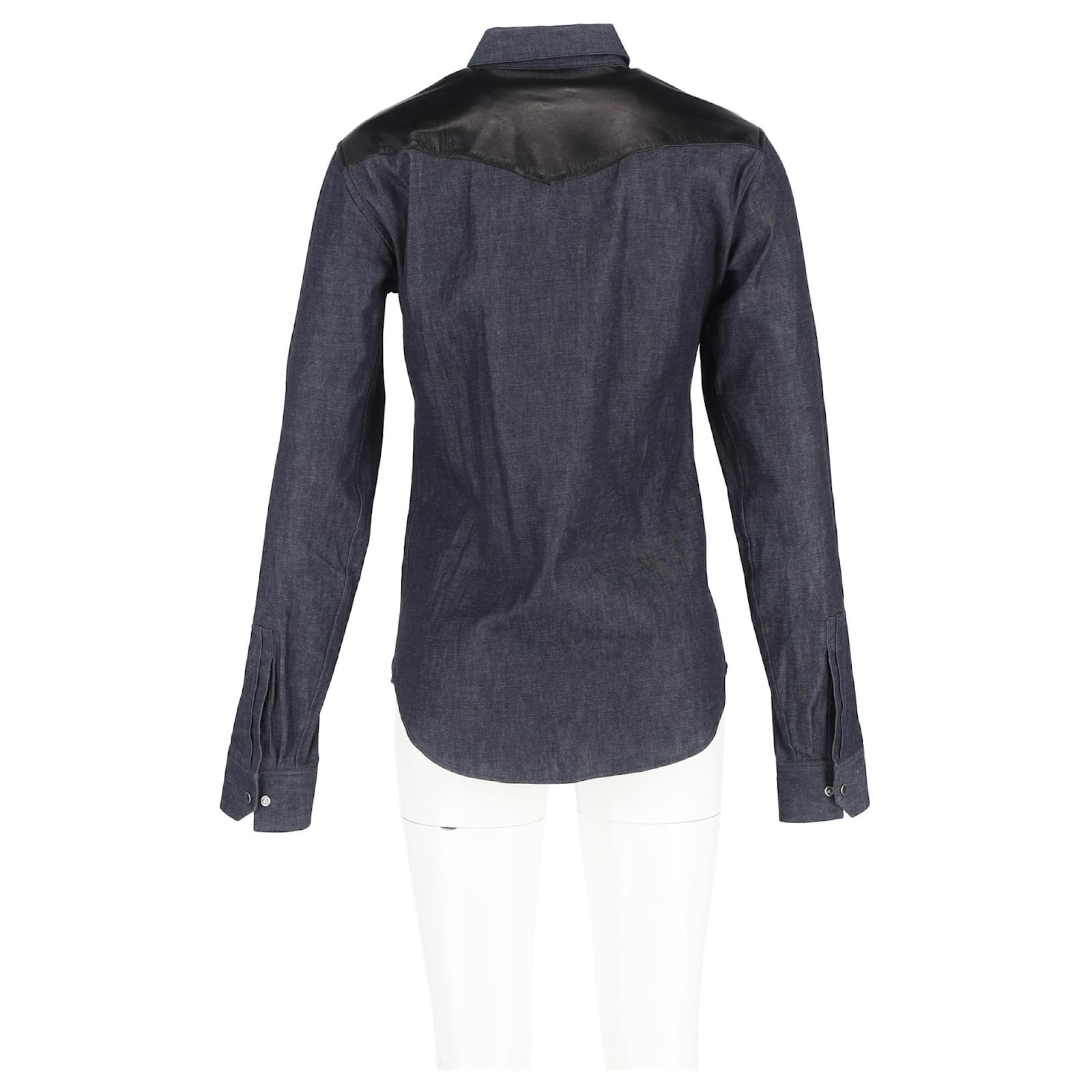Saint Laurent Leather Trim Long Sleeve Shirt in Grey Cotton Denim