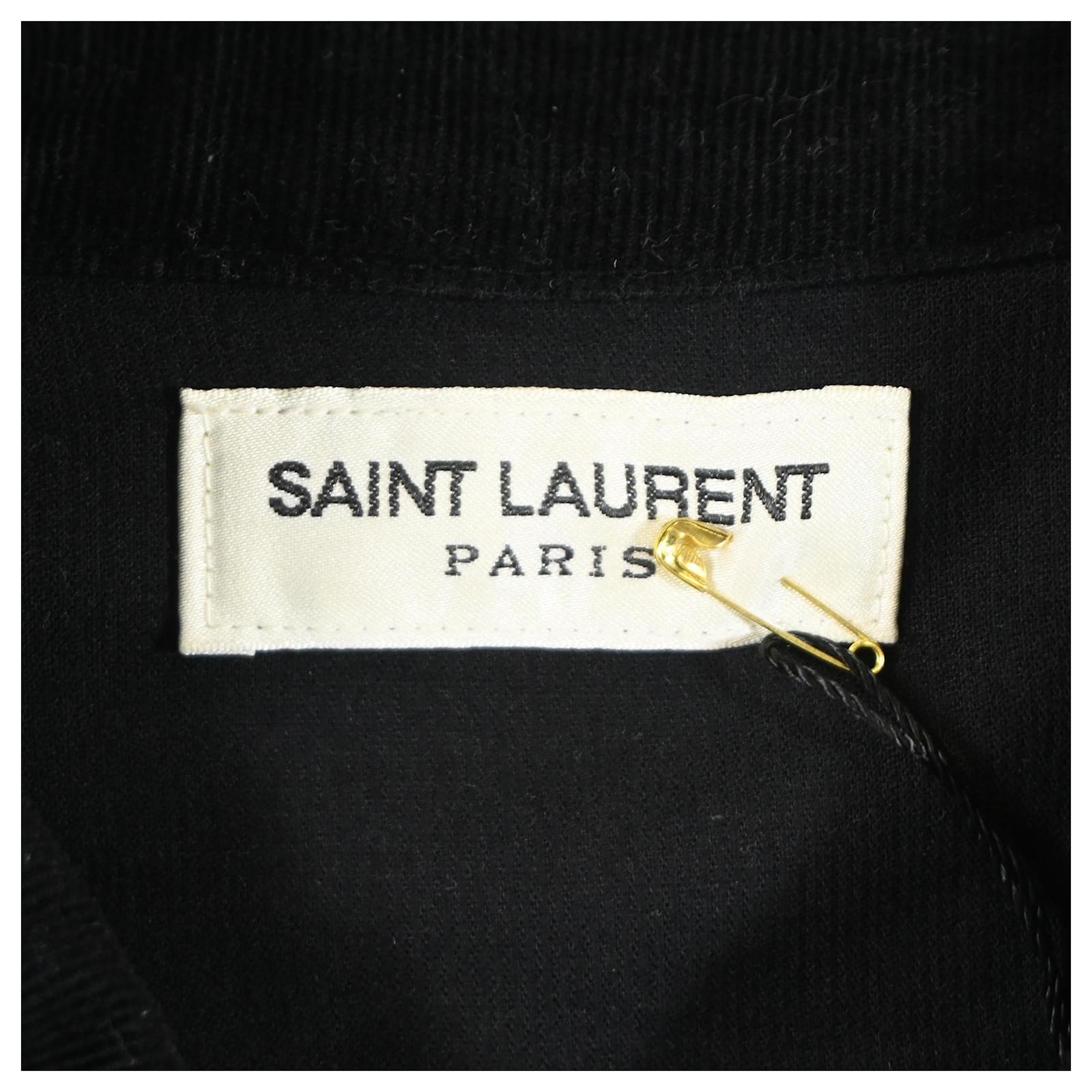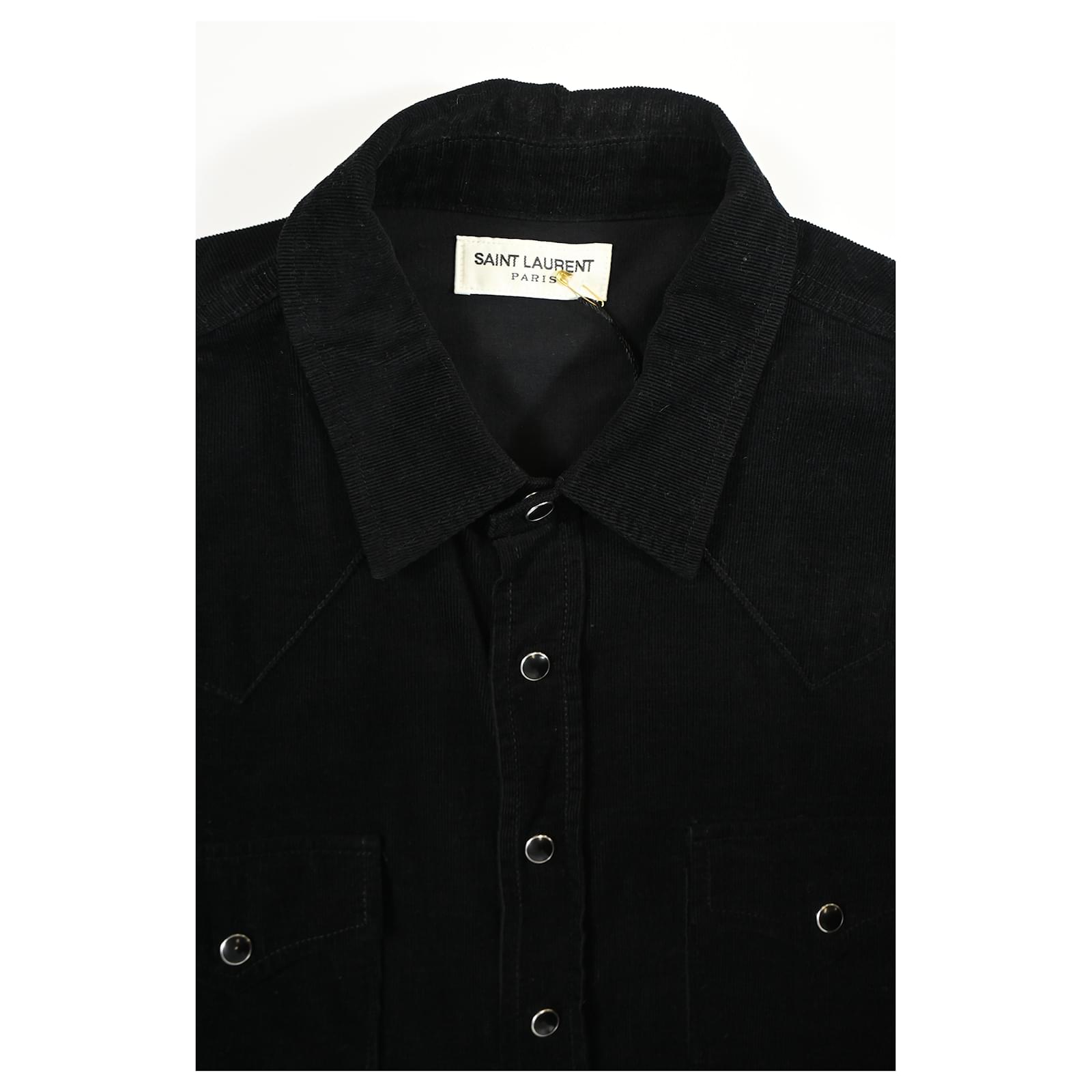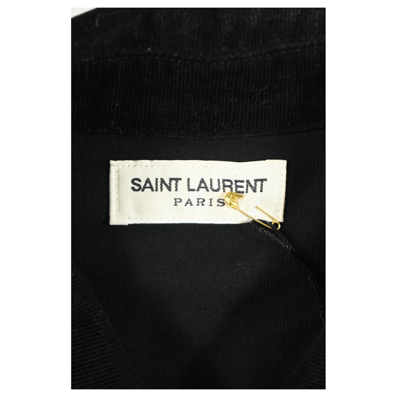 Saint Laurent’s Overshirt in Black Corduroy redefines modern outerwear with its sleek design and textured fabric. The pointed collar and two-button cuffs offer classic detailing, while the buttoned flap pockets provide a utilitarian edge. The curved hem adds a touch of modernity, creating a versatile overshirt that pairs effortlessly with jeans, chinos, or layered over a tee.