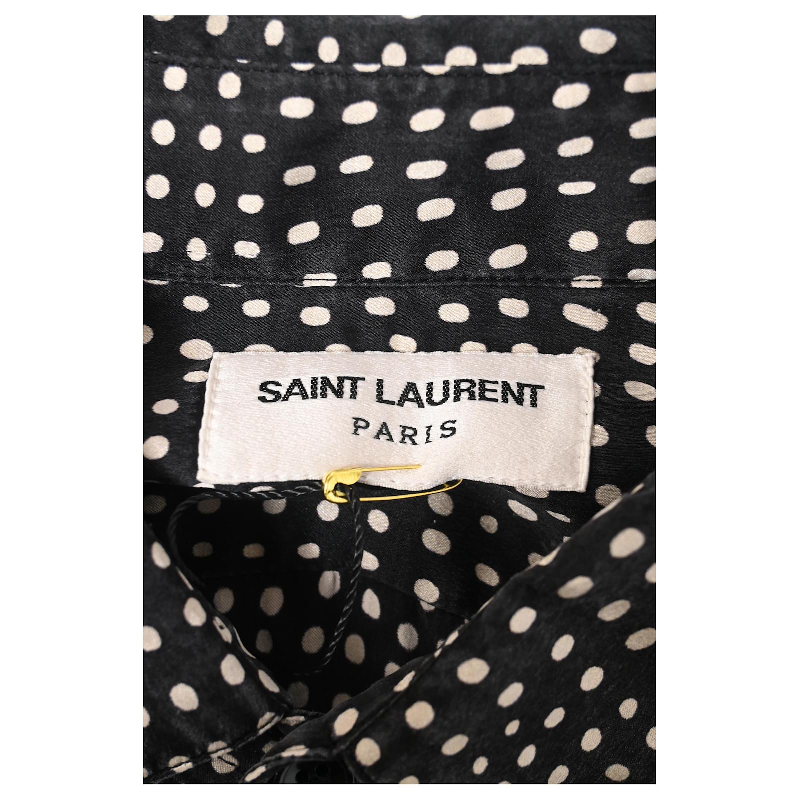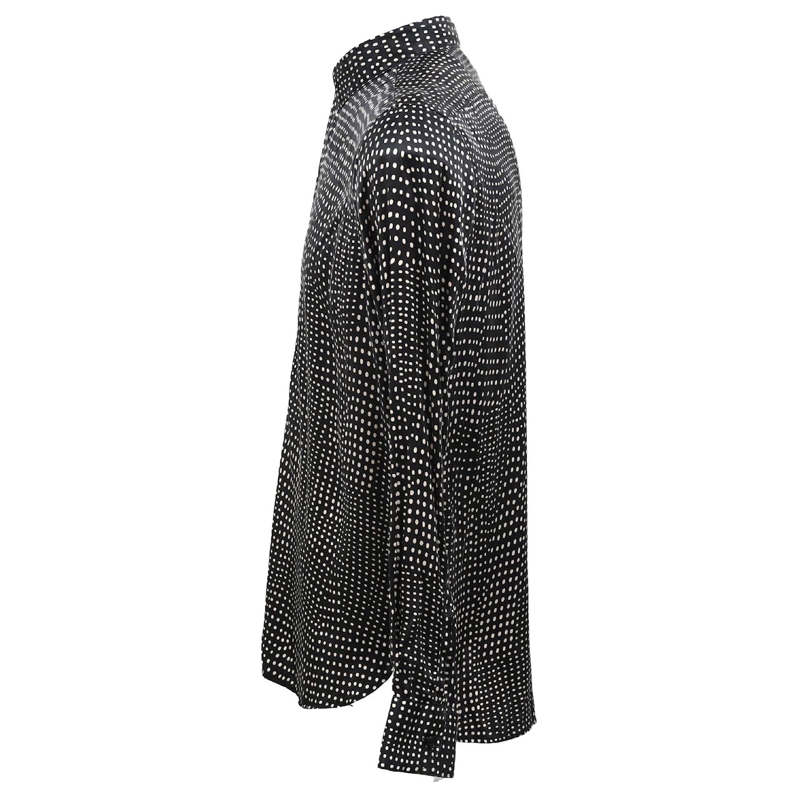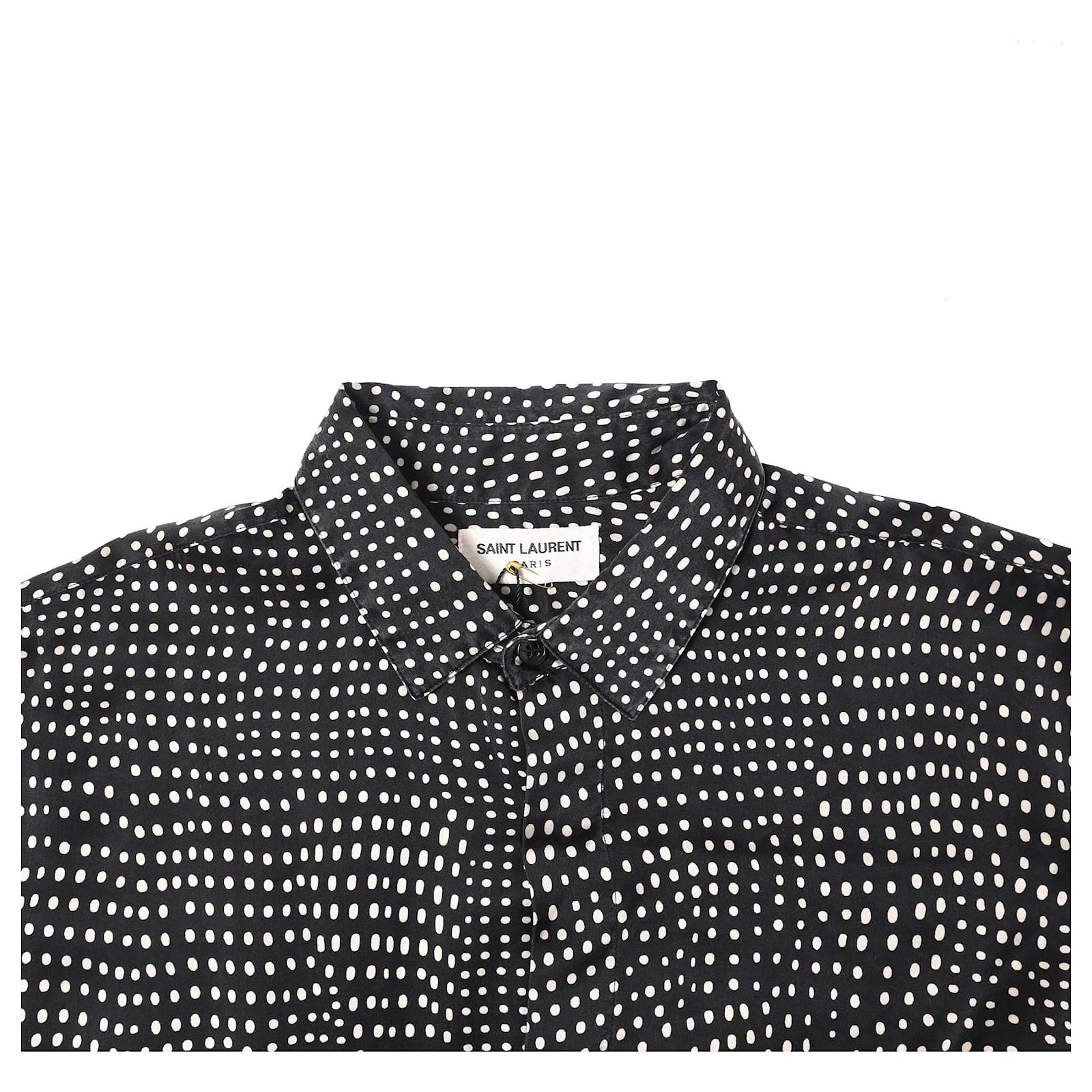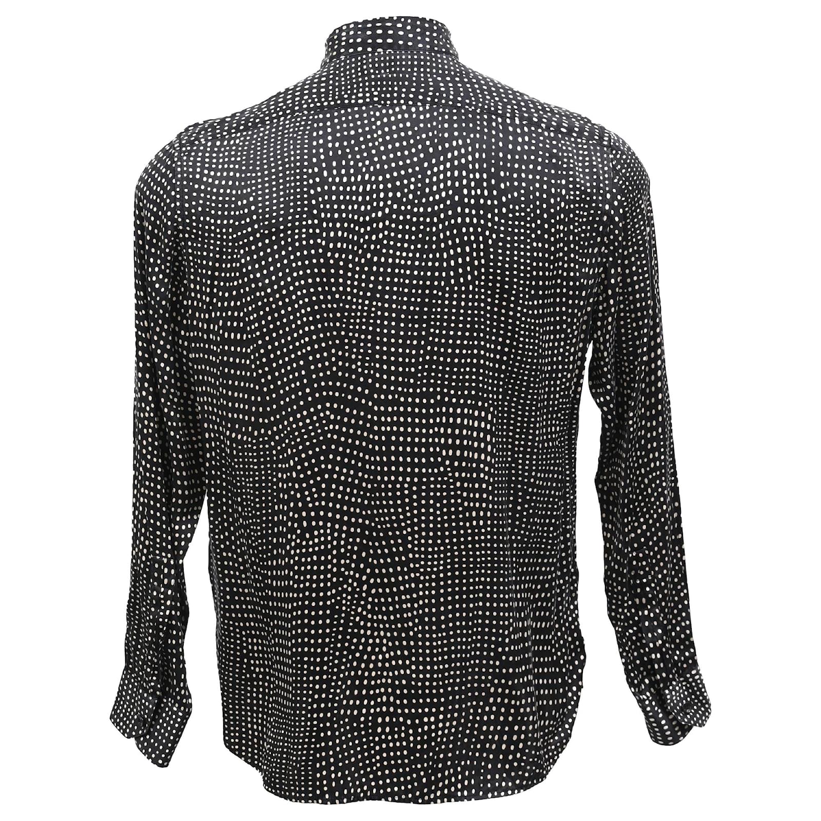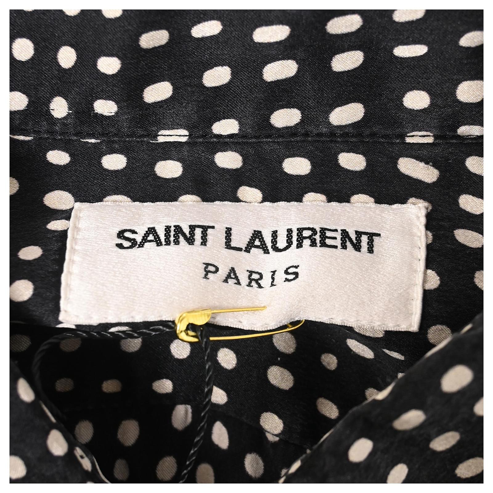 The Saint Laurent Pointillism Shirt in black silk exudes effortless sophistication, a testament to Mr. Anthony Vaccarello's commitment to a perennial wardrobe. Crafted from lustrous silk-satin, this shirt features a striking polka-dot pattern in varying sizes, adding a playful yet refined element to its classic design. The concealed placket ensures a sleek, streamlined appearance, making this shirt versatile enough for both casual outings and evening events. Elevate your wardrobe with this timeless piece that blends modern edge with luxurious craftsmanship.