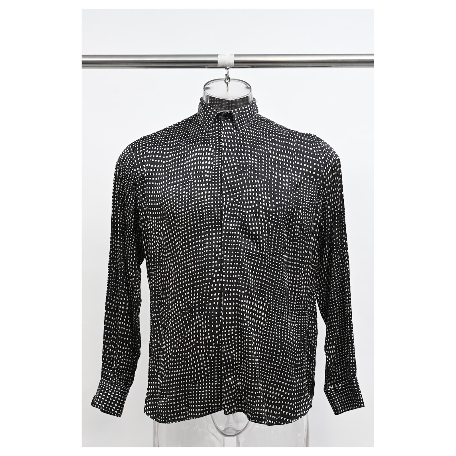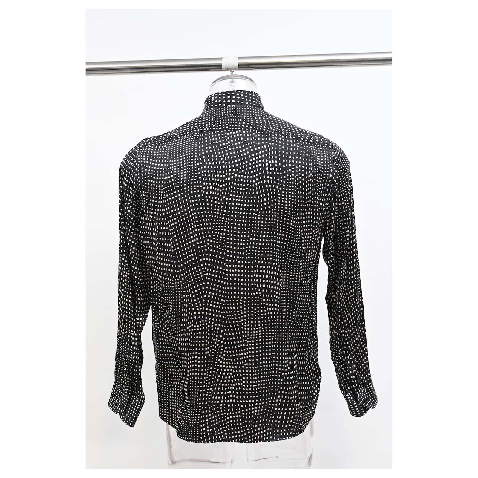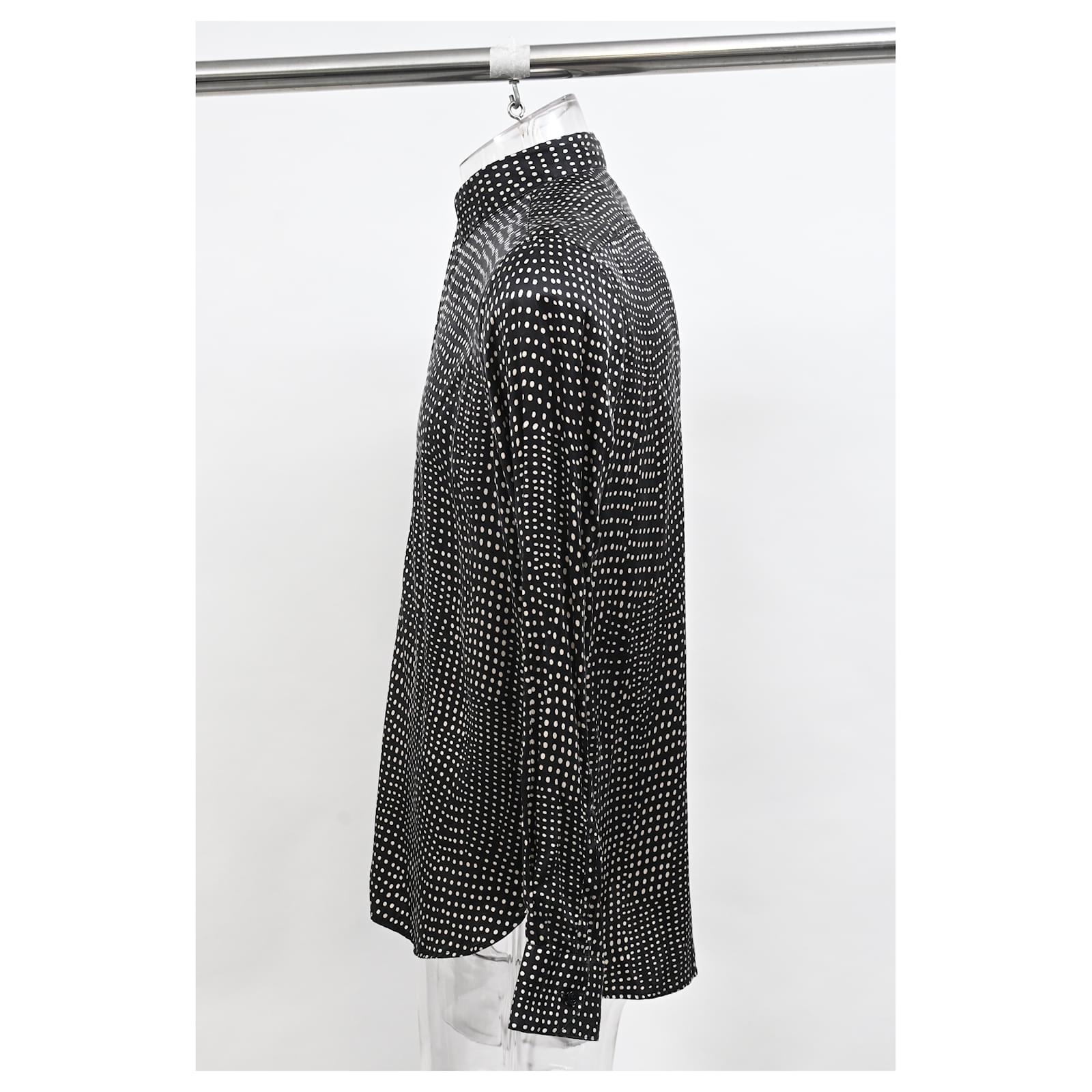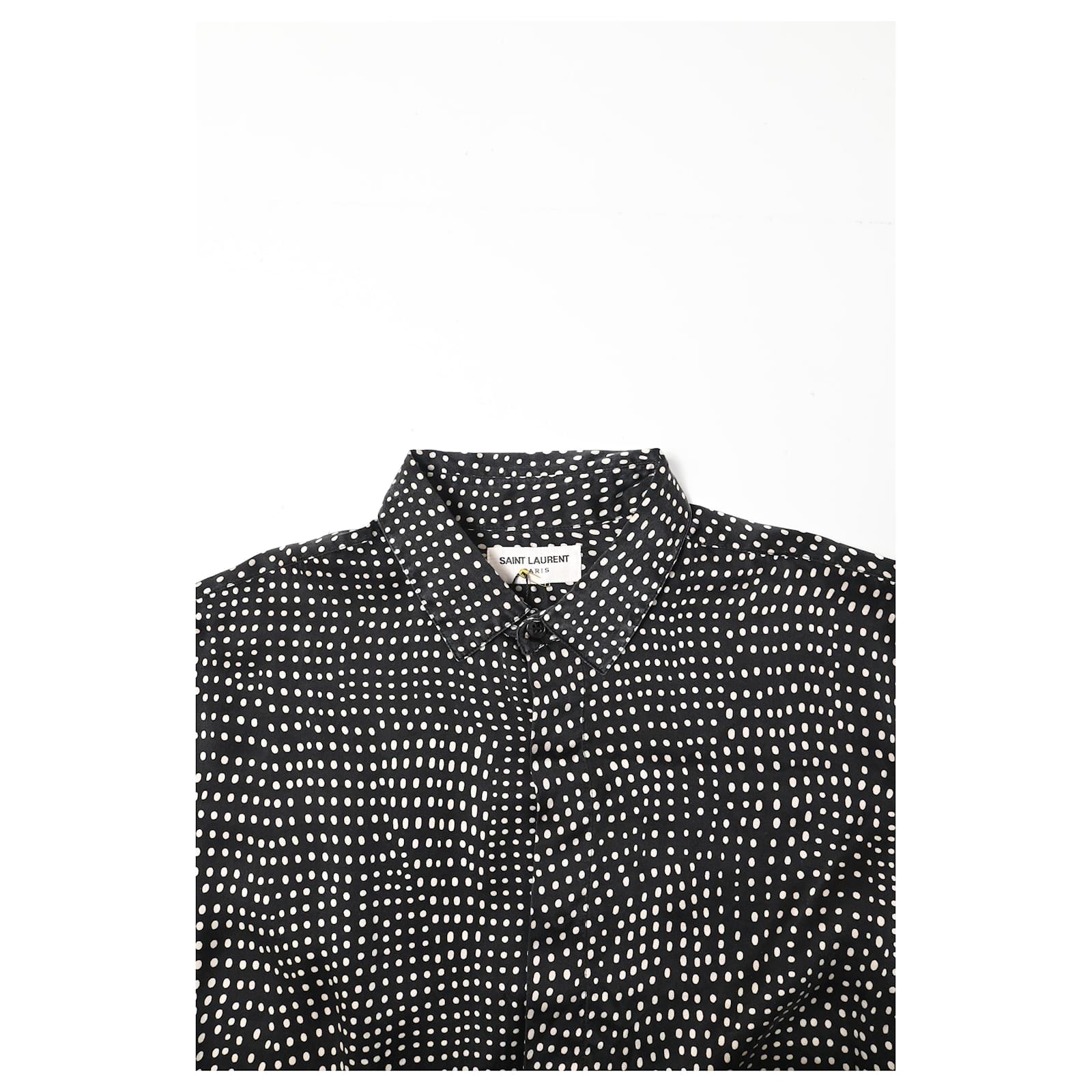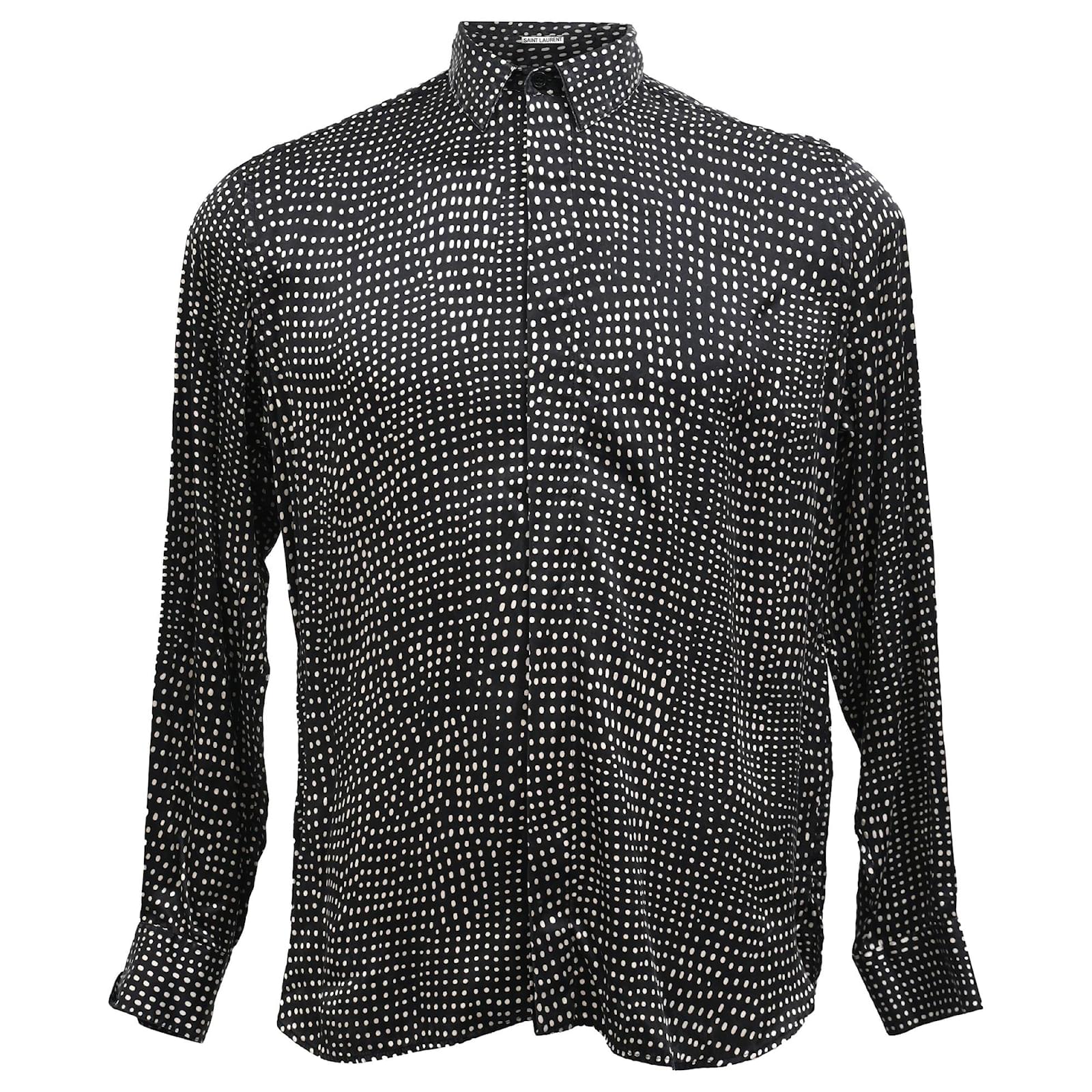 The Saint Laurent Pointillism Shirt in black silk exudes effortless sophistication, a testament to Mr. Anthony Vaccarello's commitment to a perennial wardrobe. Crafted from lustrous silk-satin, this shirt features a striking polka-dot pattern in varying sizes, adding a playful yet refined element to its classic design. The concealed placket ensures a sleek, streamlined appearance, making this shirt versatile enough for both casual outings and evening events. Elevate your wardrobe with this timeless piece that blends modern edge with luxurious craftsmanship.