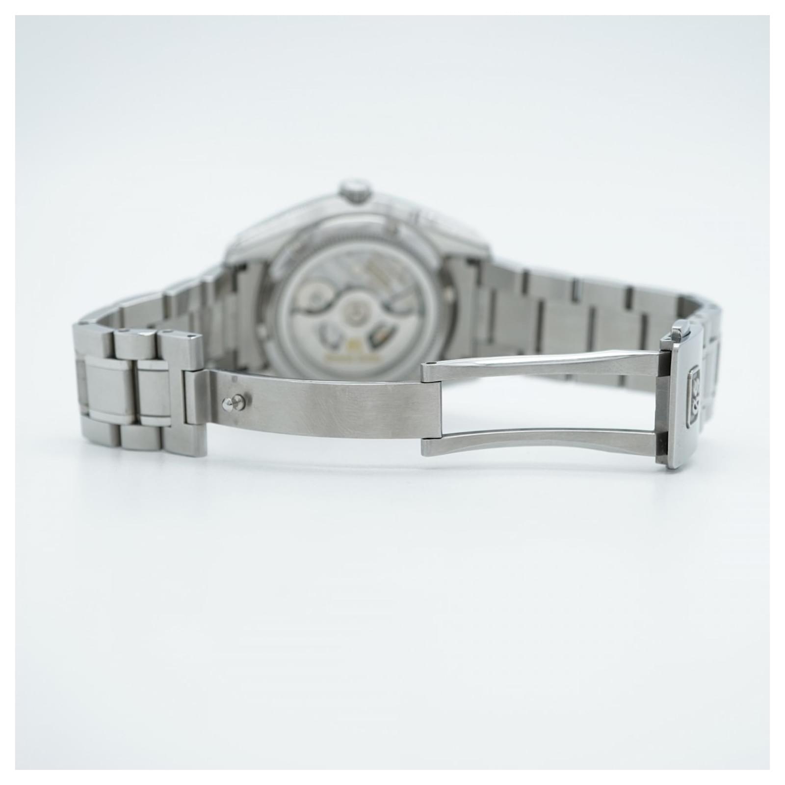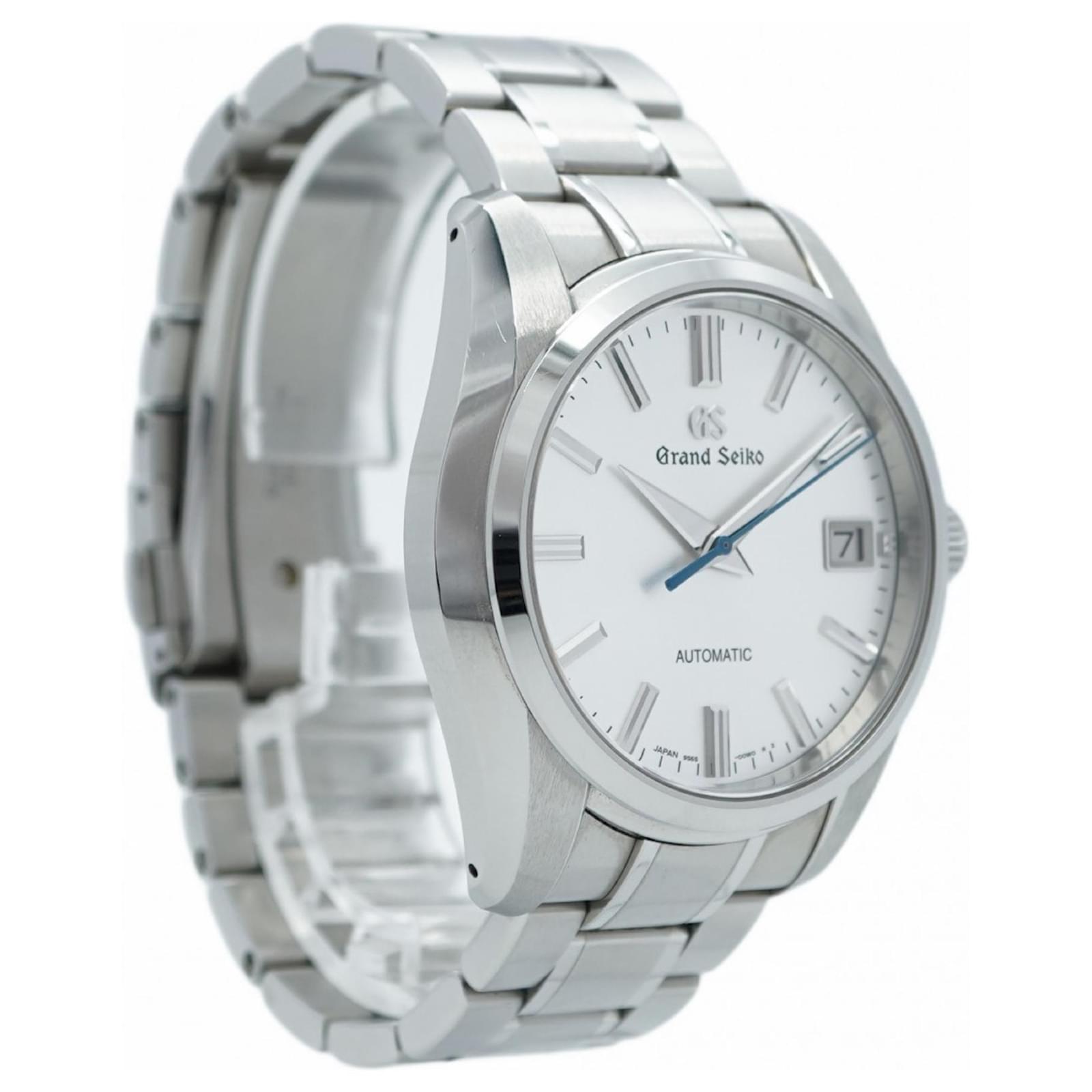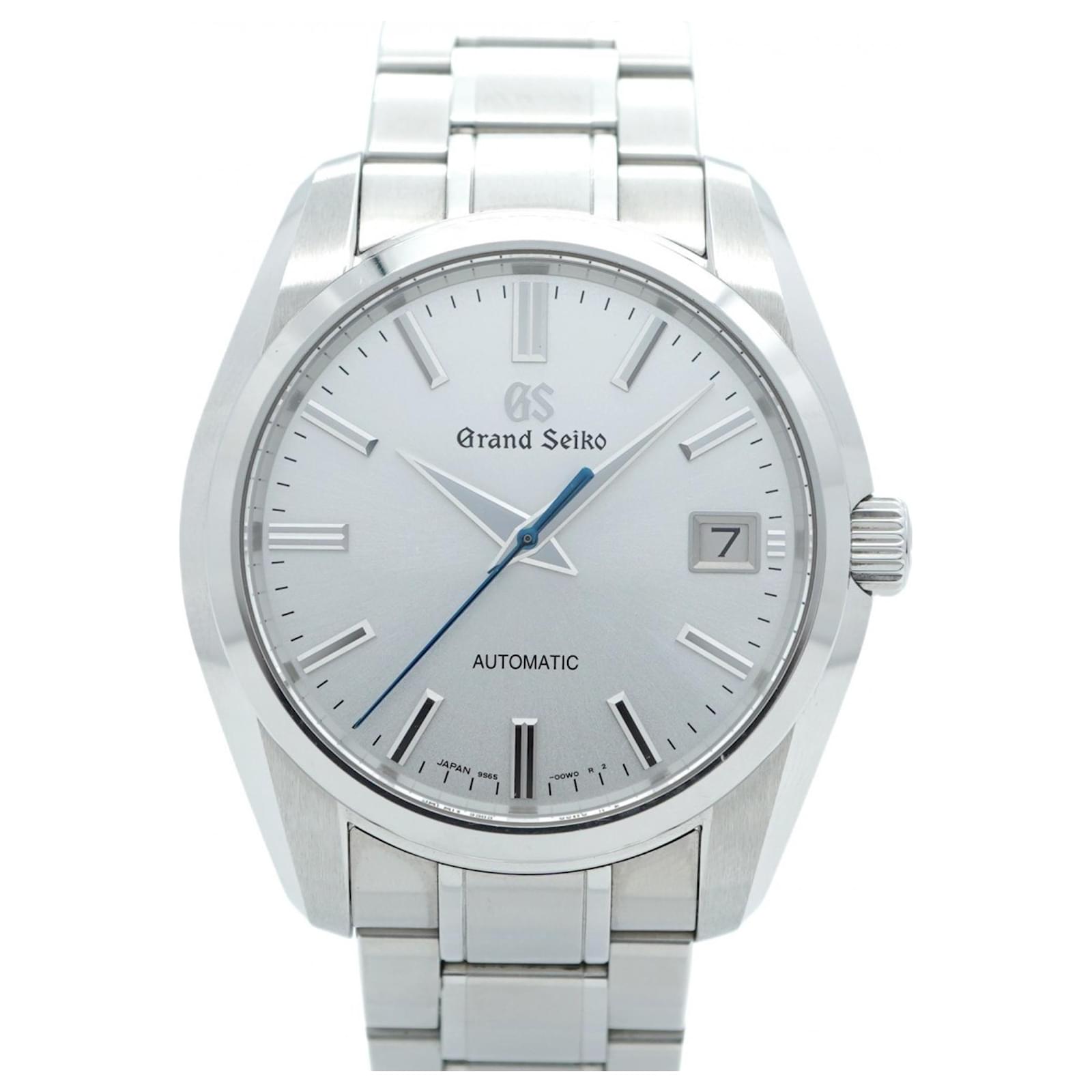 The Seiko Grand 9S65-00T0 is a men's wristwatch featuring a silver dial and a stainless steel band. This self-winding automatic timepiece has a case diameter of 40mm and is suitable for a wrist size of 16.5cm (6.49 inches). The watch is classified as used but remains in good condition, with slight scratches on the bezel, case back, dial, glass, and crown. It comes with a guarantee card and both inner and outer boxes. Potential buyers are encouraged to review the images for a detailed view of the watch's condition and included accessories.