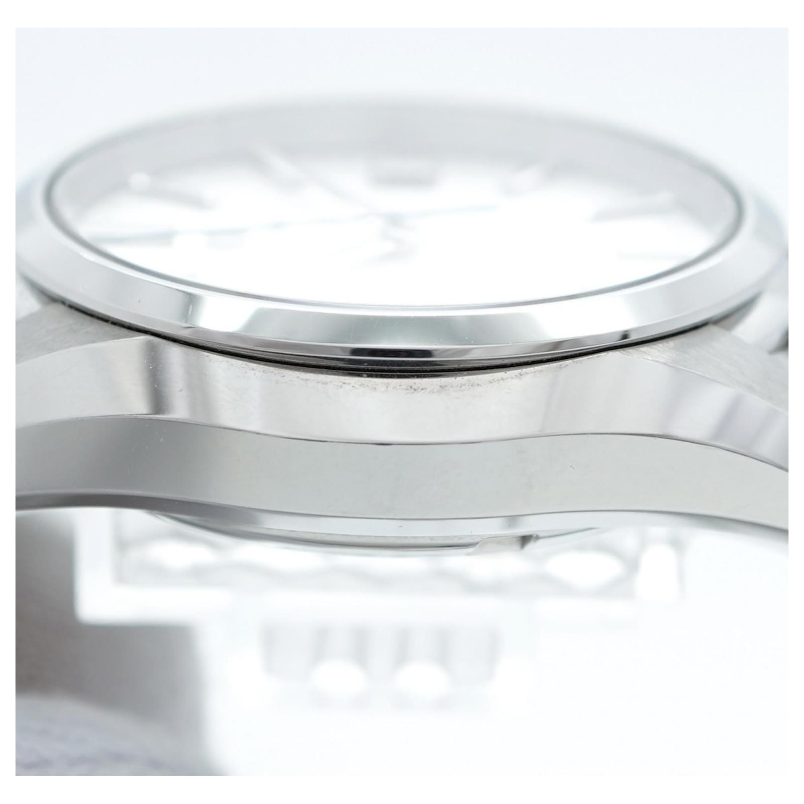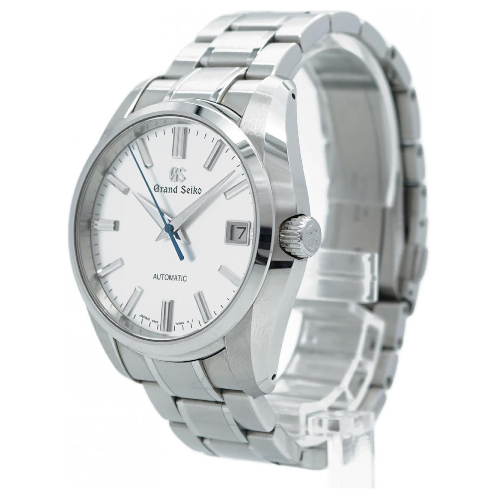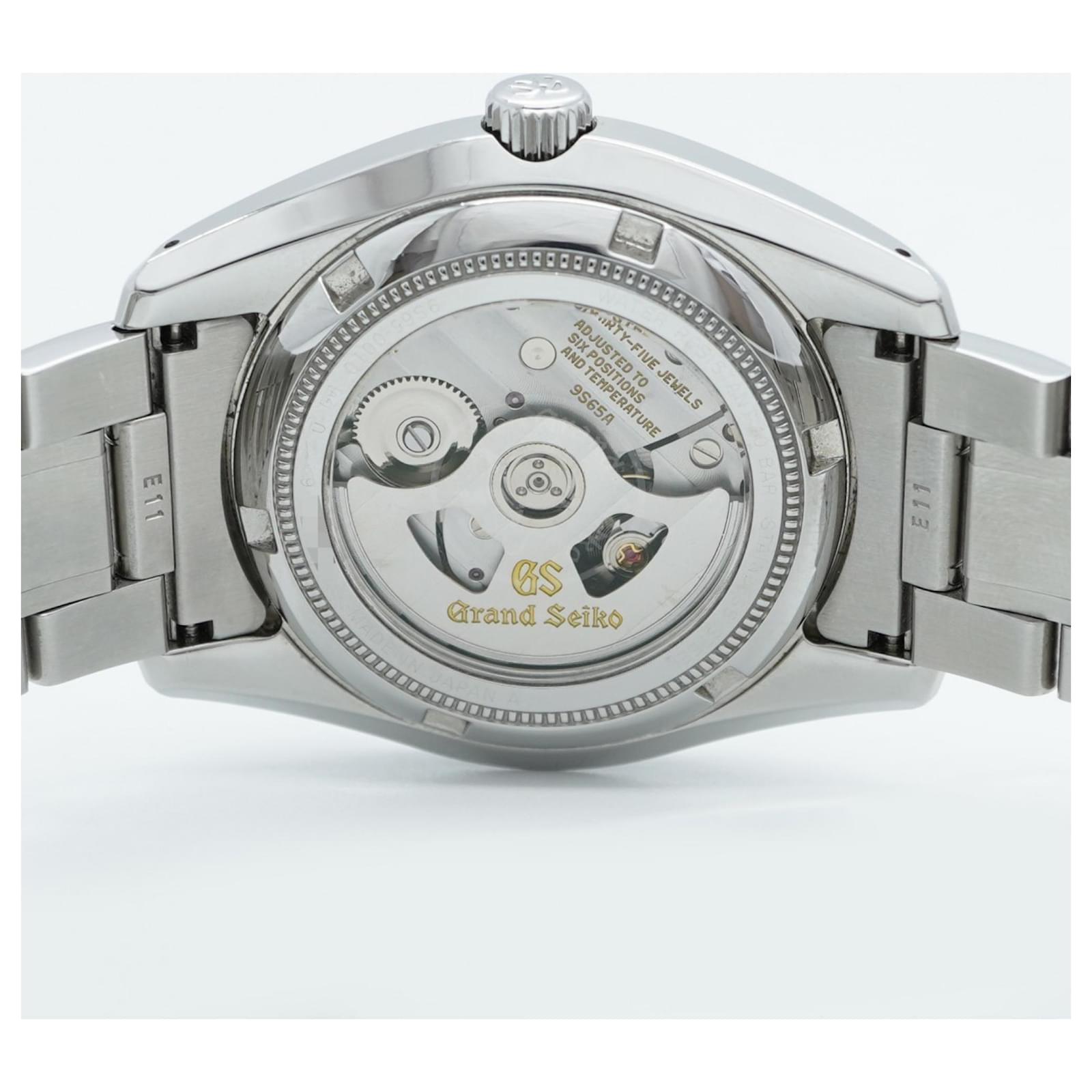 The Seiko Grand 9S65-00T0 is a men's wristwatch featuring a silver dial and a stainless steel band. This self-winding automatic timepiece has a case diameter of 40mm and is suitable for a wrist size of 16.5cm (6.49 inches). The watch is classified as used but remains in good condition, with slight scratches on the bezel, case back, dial, glass, and crown. It comes with a guarantee card and both inner and outer boxes. Potential buyers are encouraged to review the images for a detailed view of the watch's condition and included accessories.