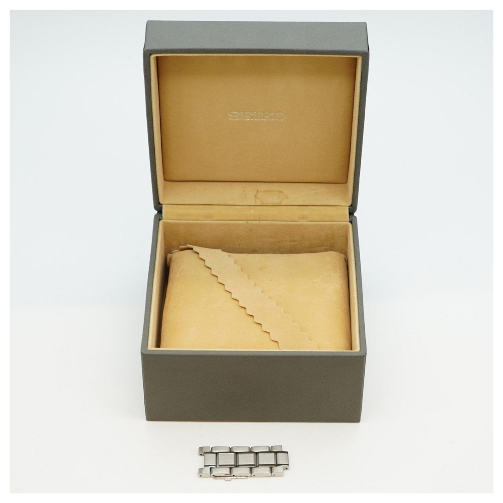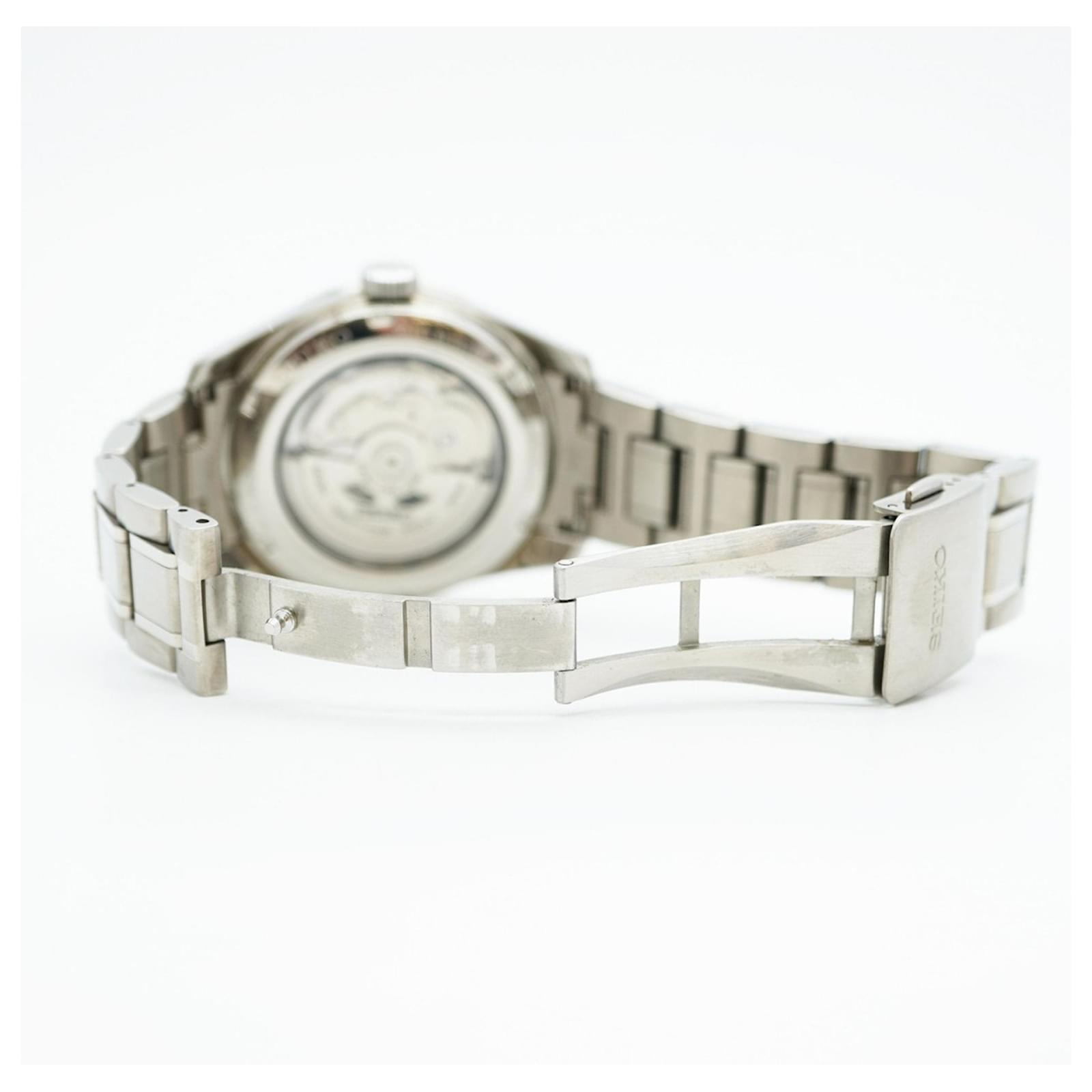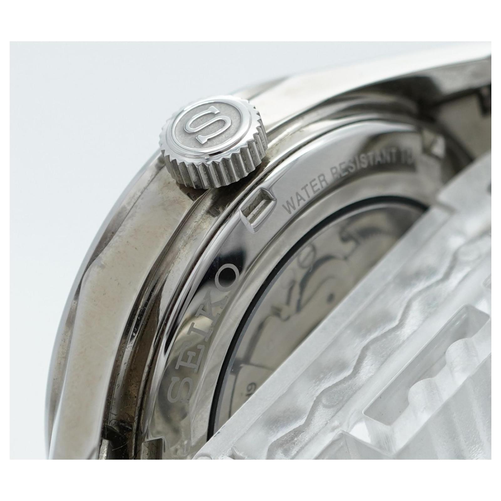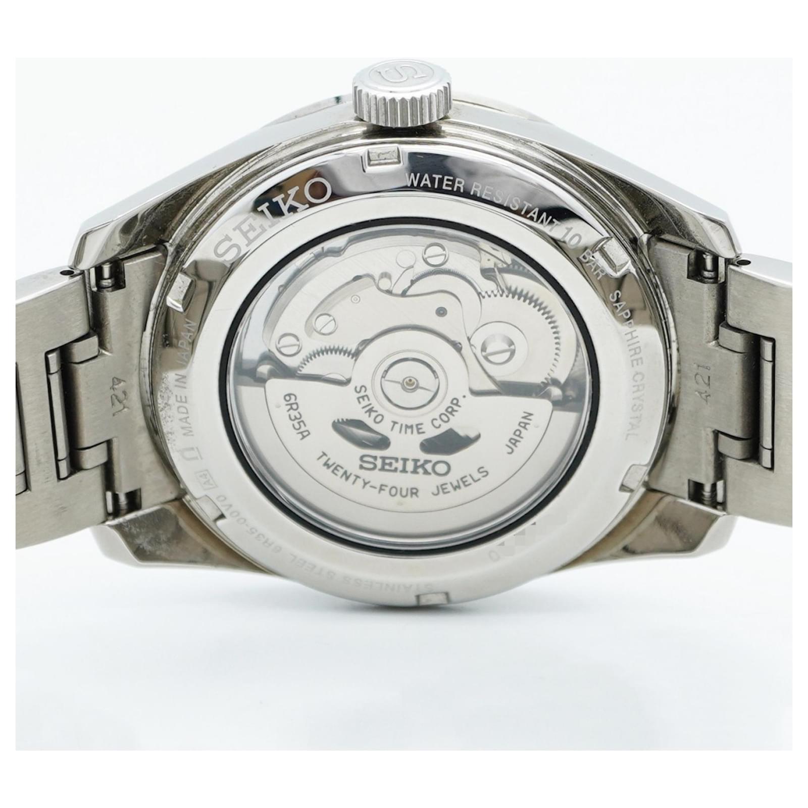 This watch is in good used condition, with slight scratches on the bezel, case back, dial, glass, and crown, as well as minor signs of wear on the band. It comes with an inner box, and potential buyers are encouraged to review the images for a detailed view of its condition. The model is identified by the MPN 6R35-00V0 and is part of Seiko's reputable collection.