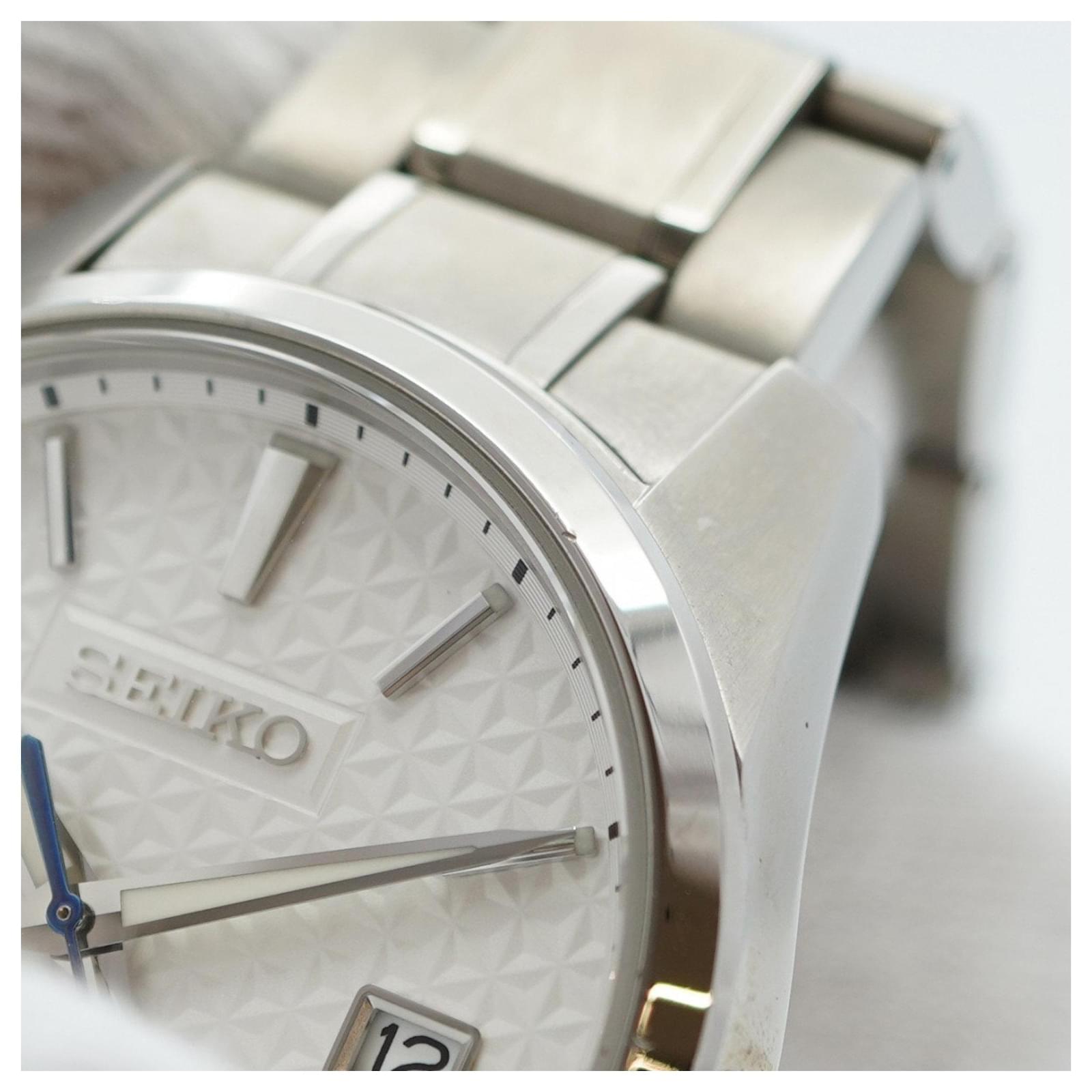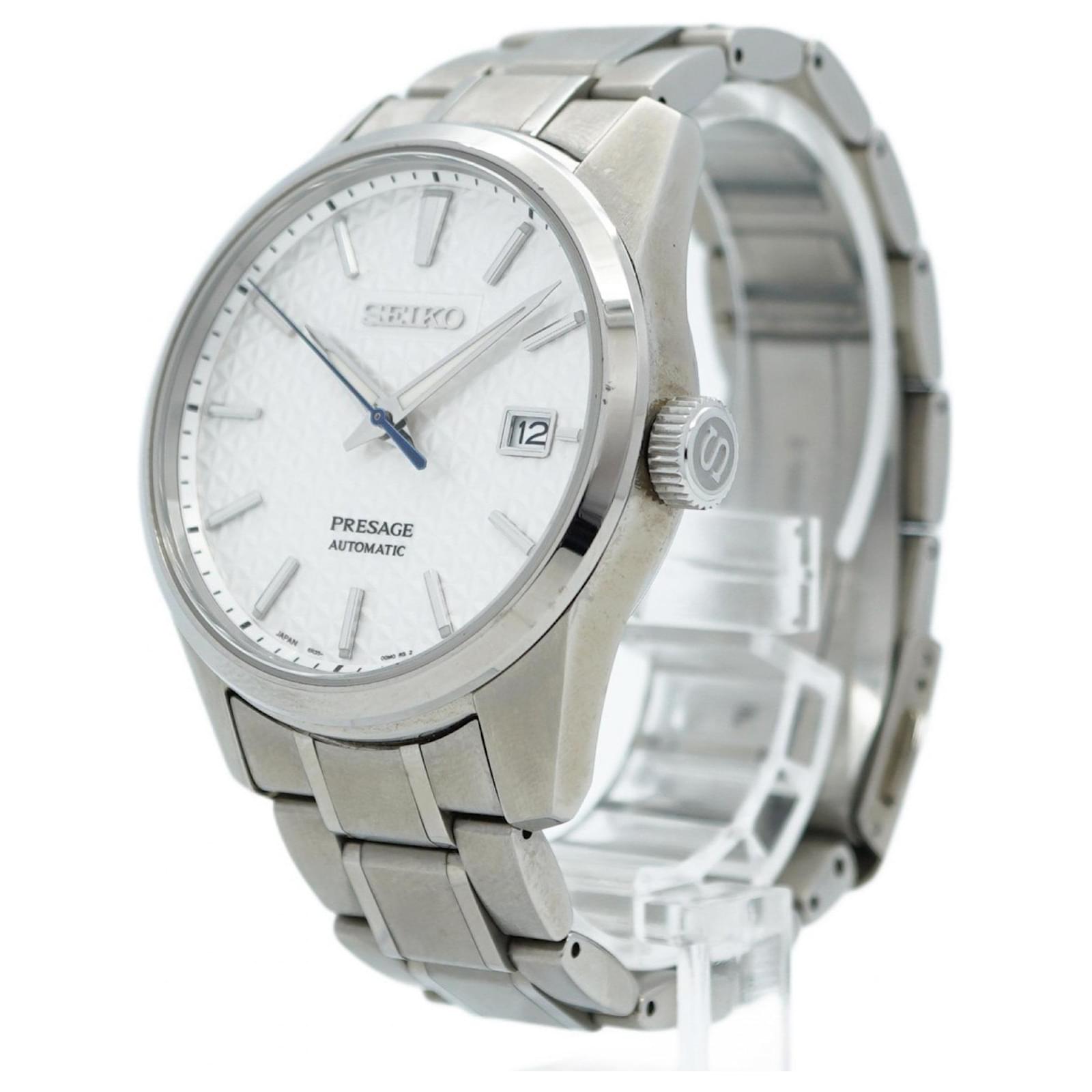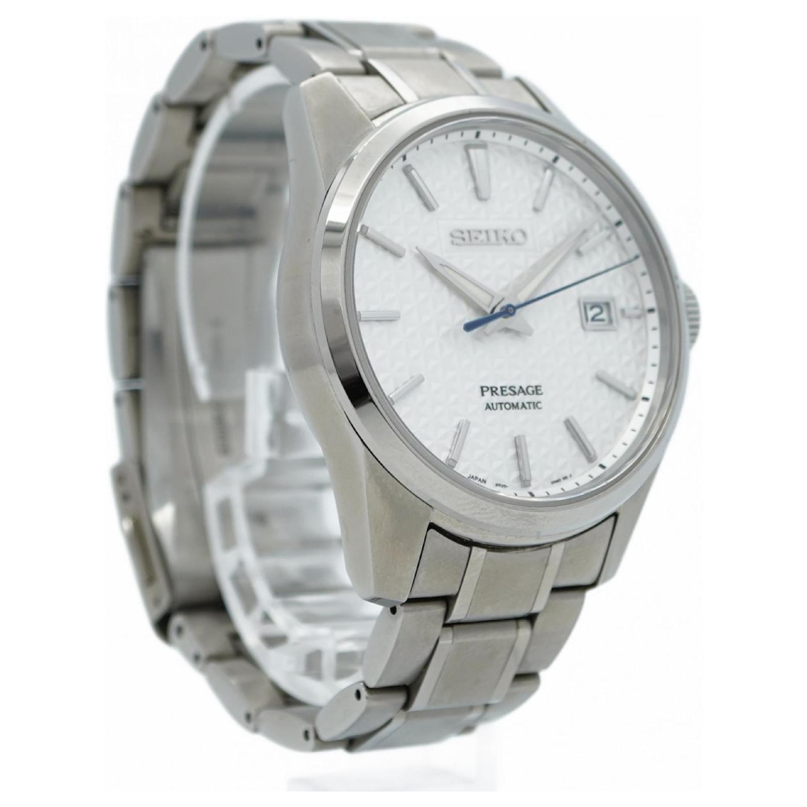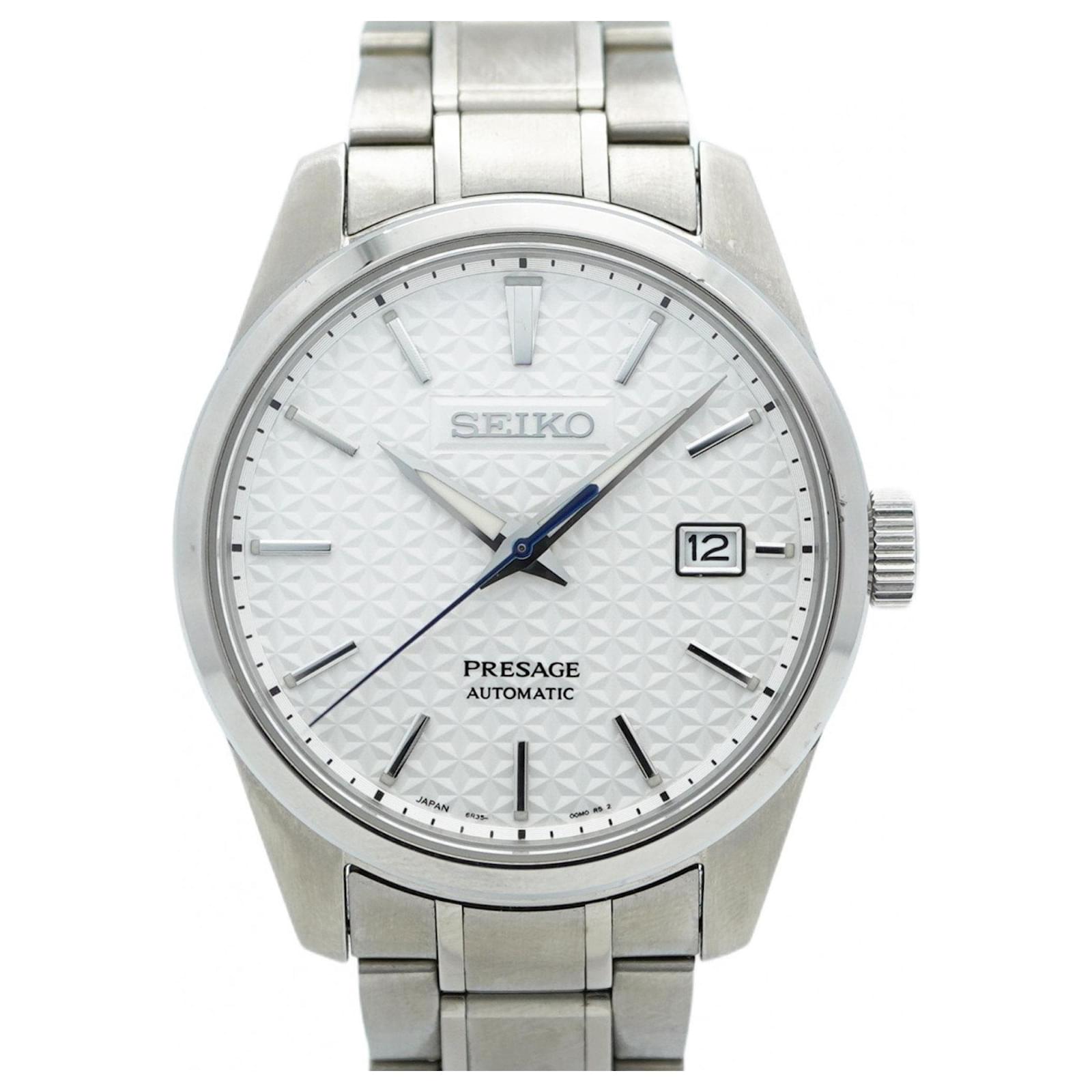 The Seiko Presage 6R35-00V0 is a men's wristwatch featuring a classic white dial and a durable stainless steel band. This self-winding automatic timepiece has a case diameter of 39mm, suitable for a wrist size of 15cm (5.9 inches).