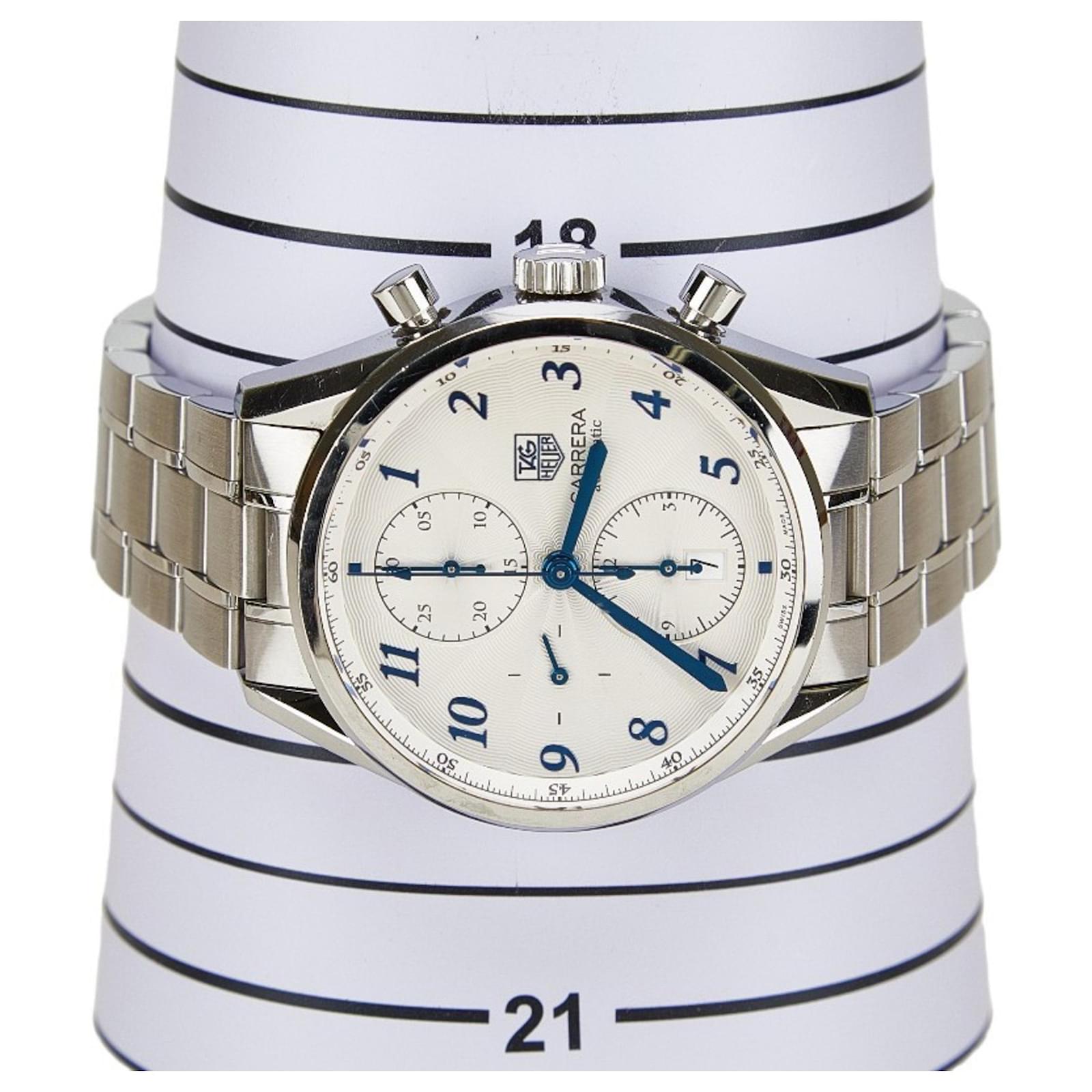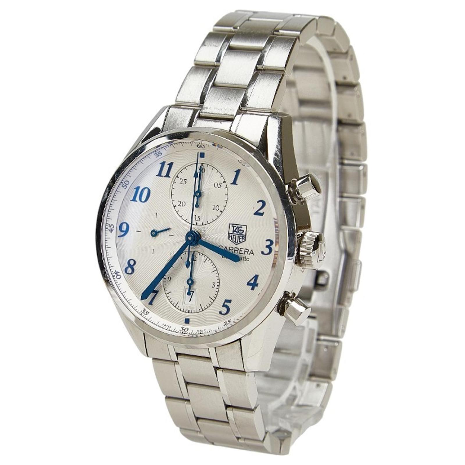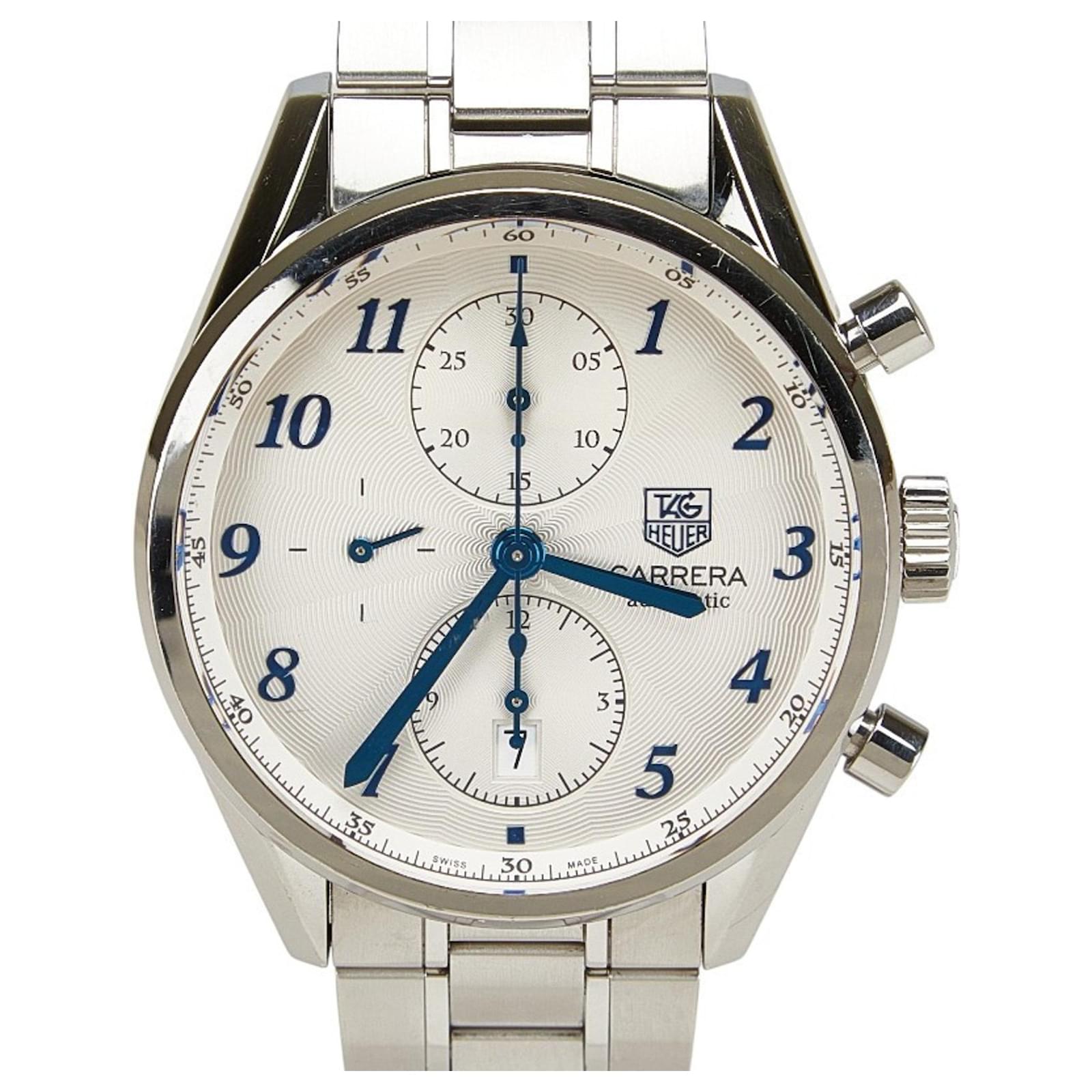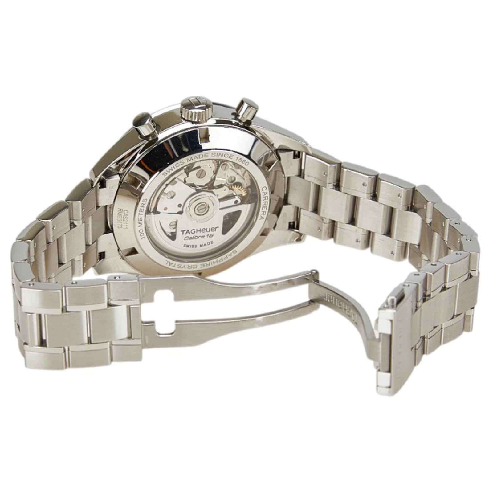 The TAG Heuer Carrera Heritage Watch CAS2111.BA0730 is a men's wristwatch featuring a silver dial and crafted from stainless steel for both the case and band. This self-winding automatic timepiece has a case diameter of 40.9mm and a thickness of 15.9mm, making it a substantial yet elegant accessory. It is designed to fit a wrist size of 20cm (7.87 inches) and has a band width of 19mm. Weighing 178.2g (6.28oz), it offers a solid feel on the wrist.