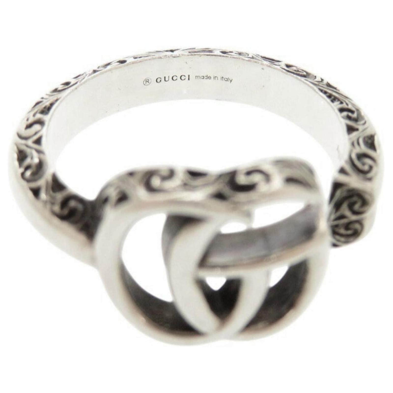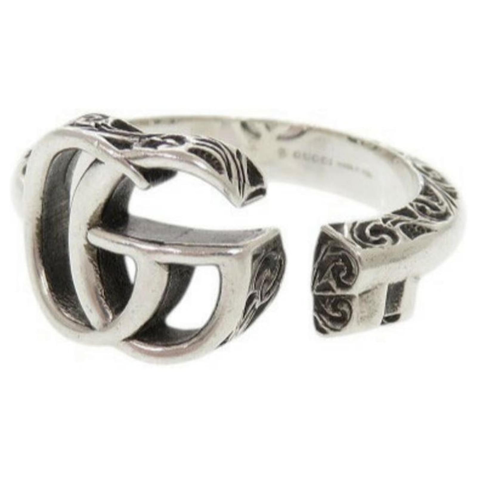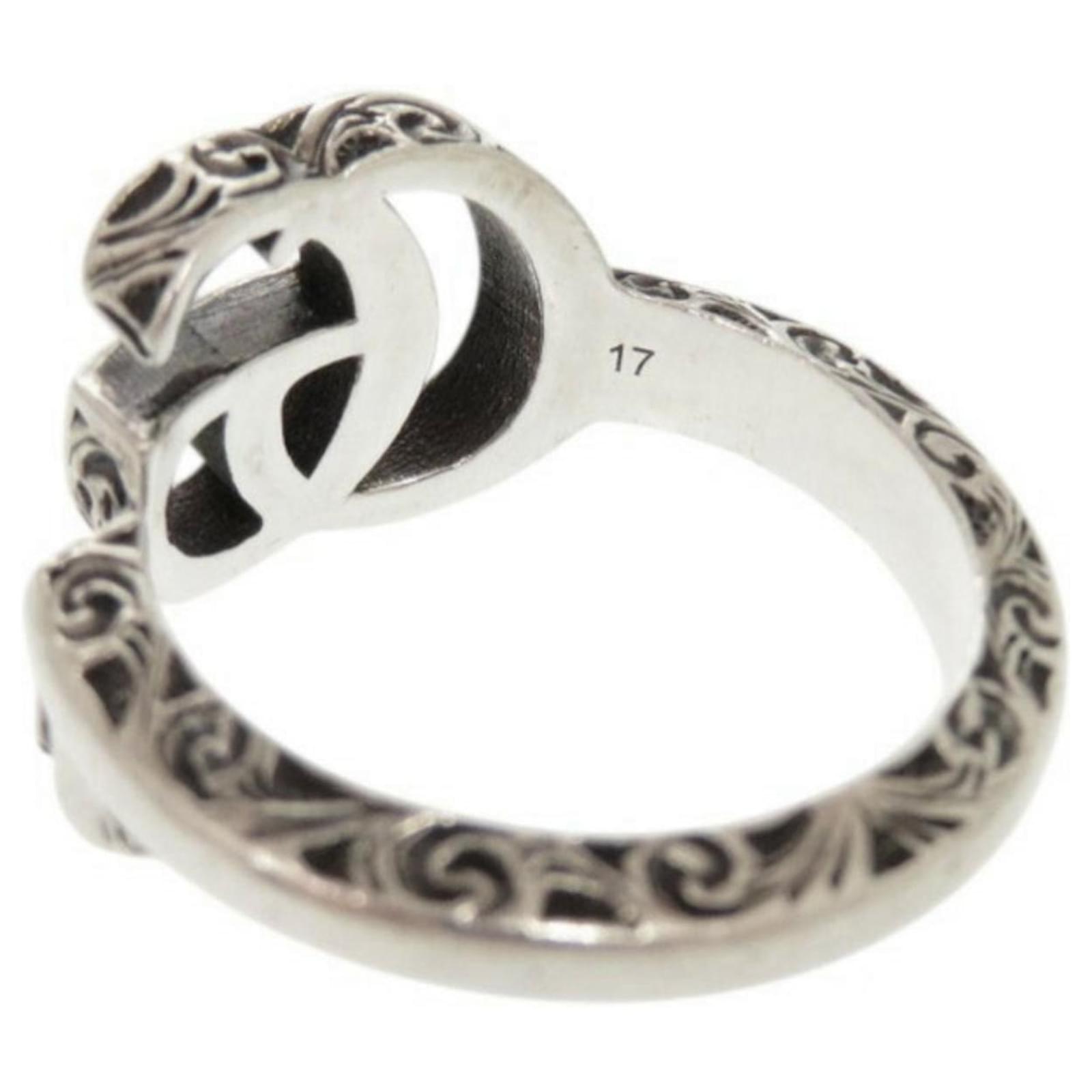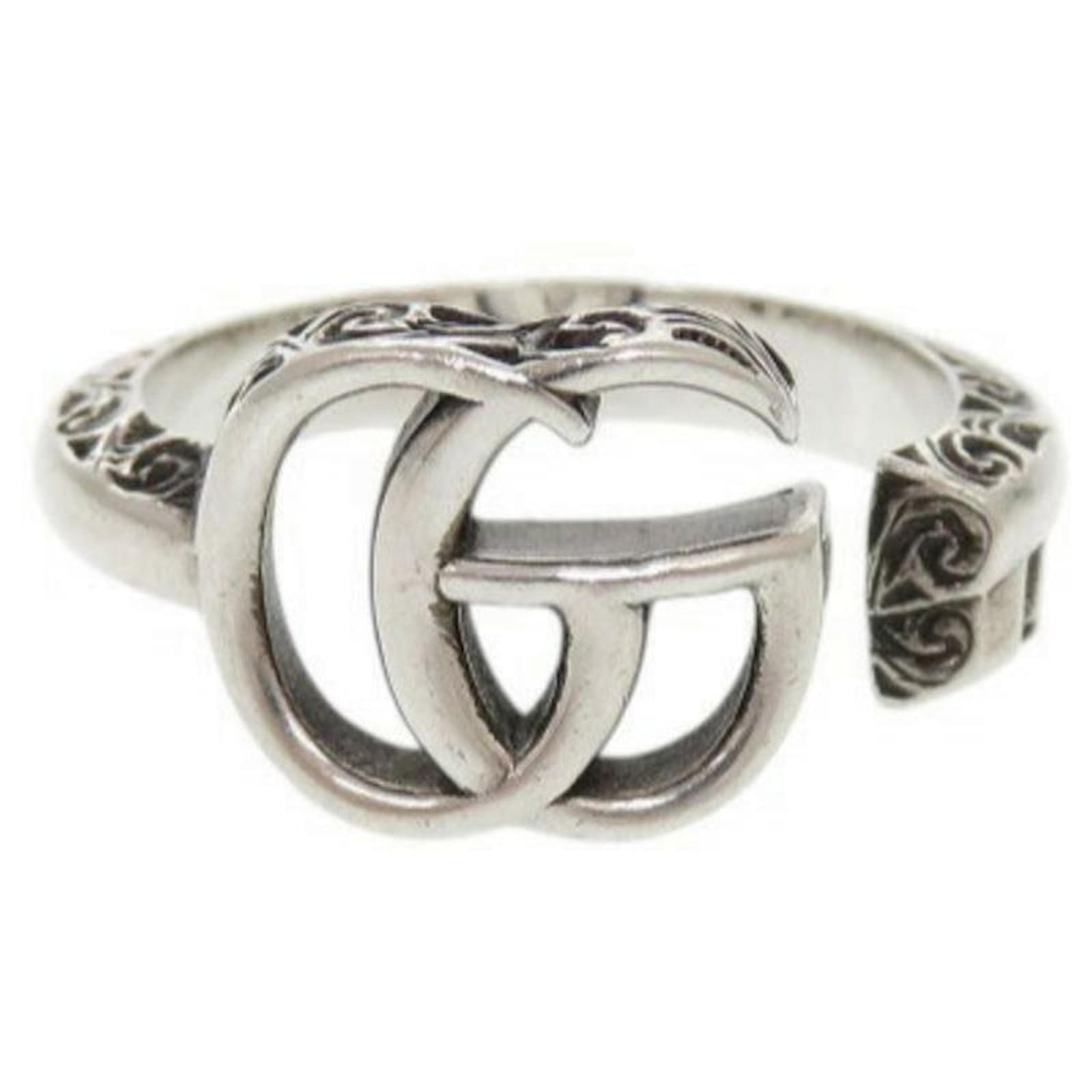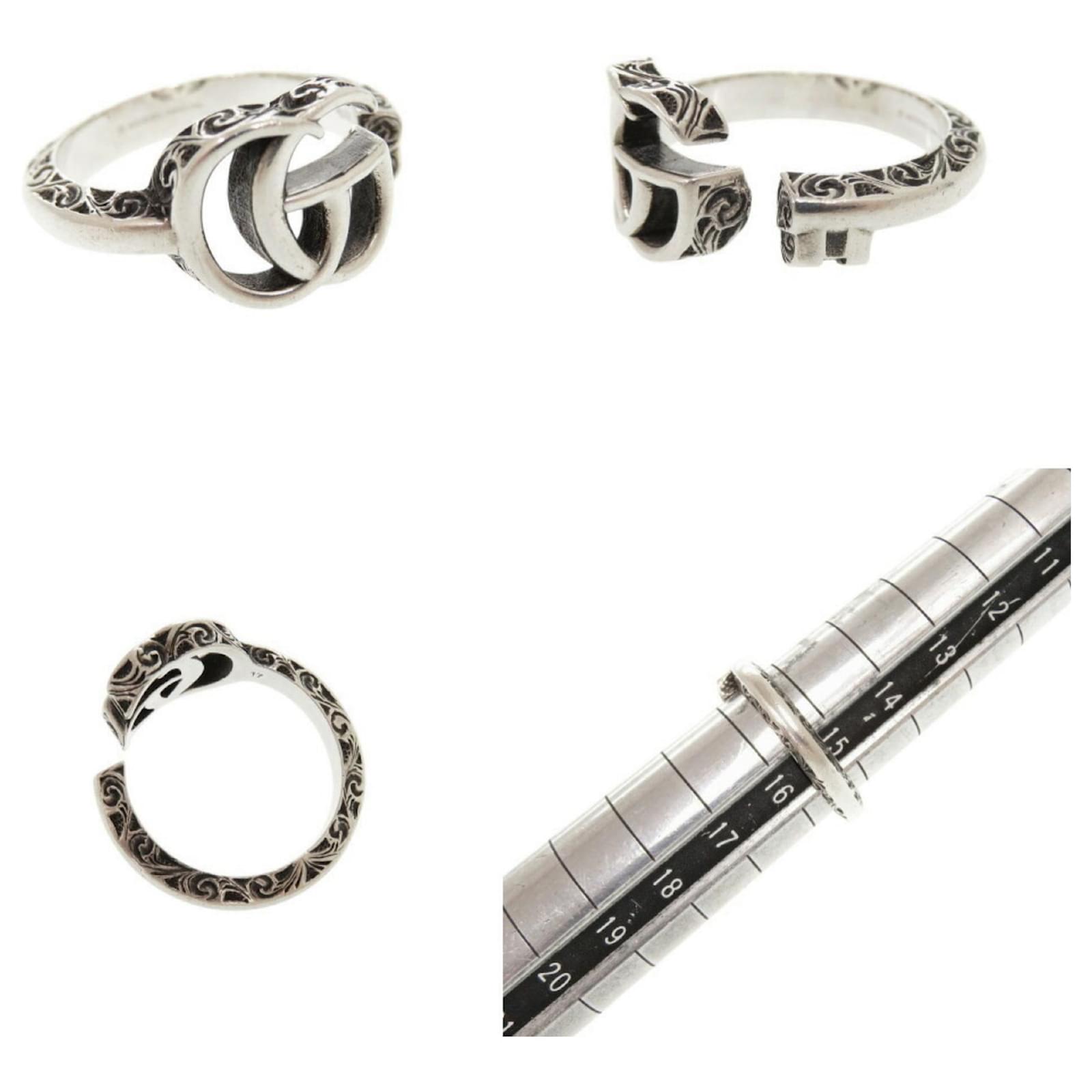 This Gucci Double G Band Ring is crafted from Silver 925 and features a sleek silver color. It is available in a Japanese size 16, which corresponds to a US size 8. The ring is classified as used but remains in very good condition, showing only slight traces of use, including minor scratches and dirt. It is important to review the provided images for a clear understanding of the item's condition. This piece is made in Italy and does not come with any additional accessories.