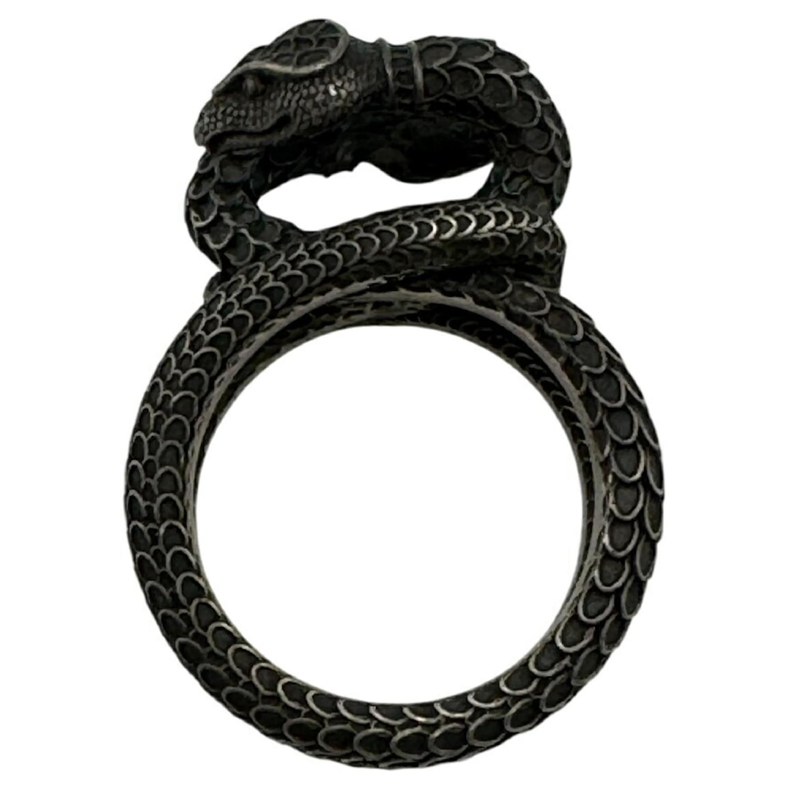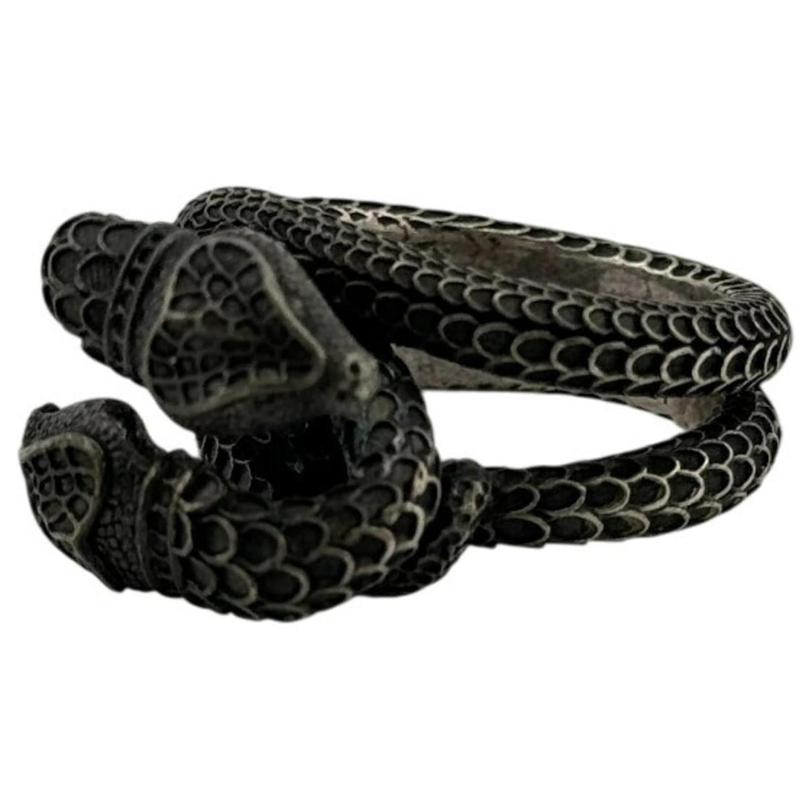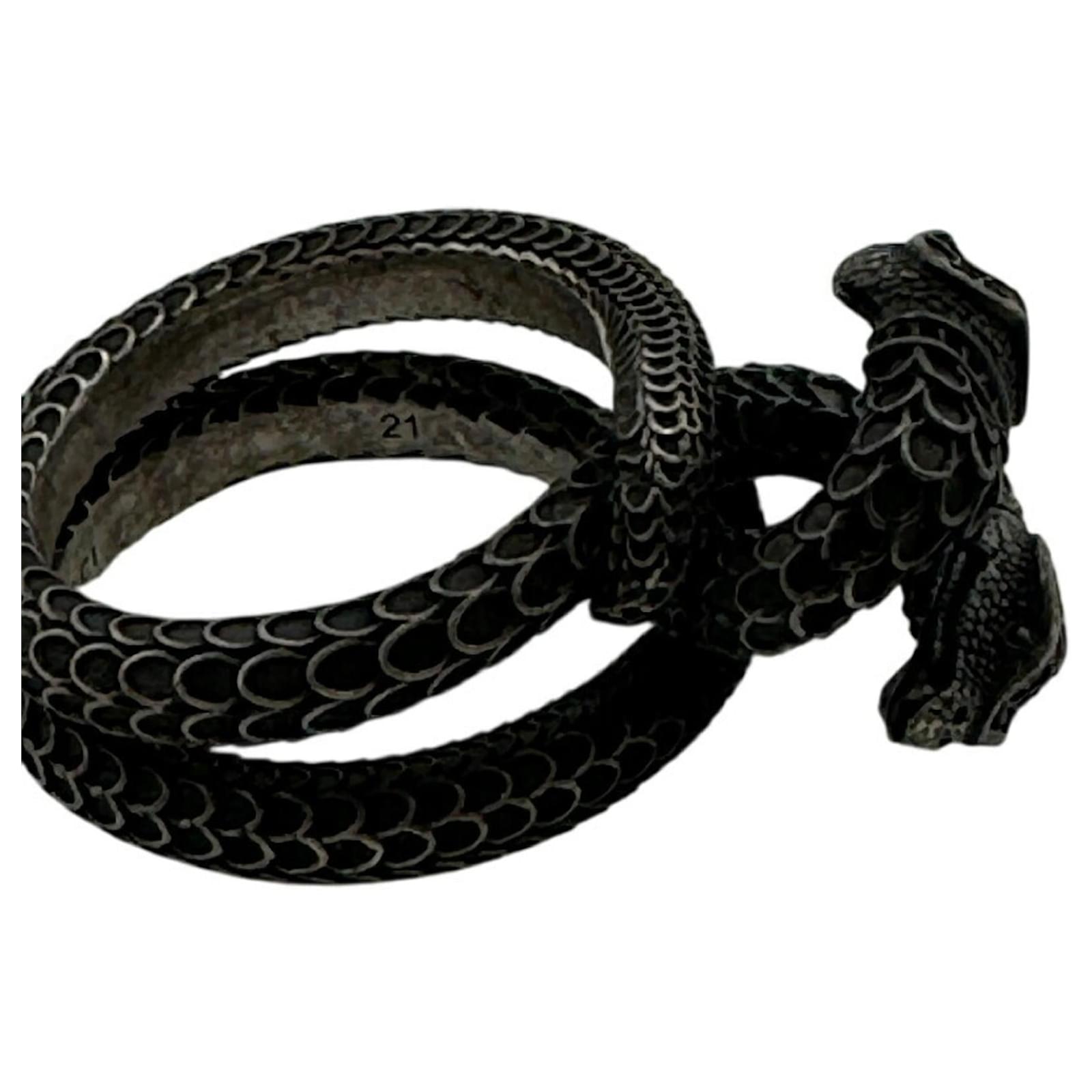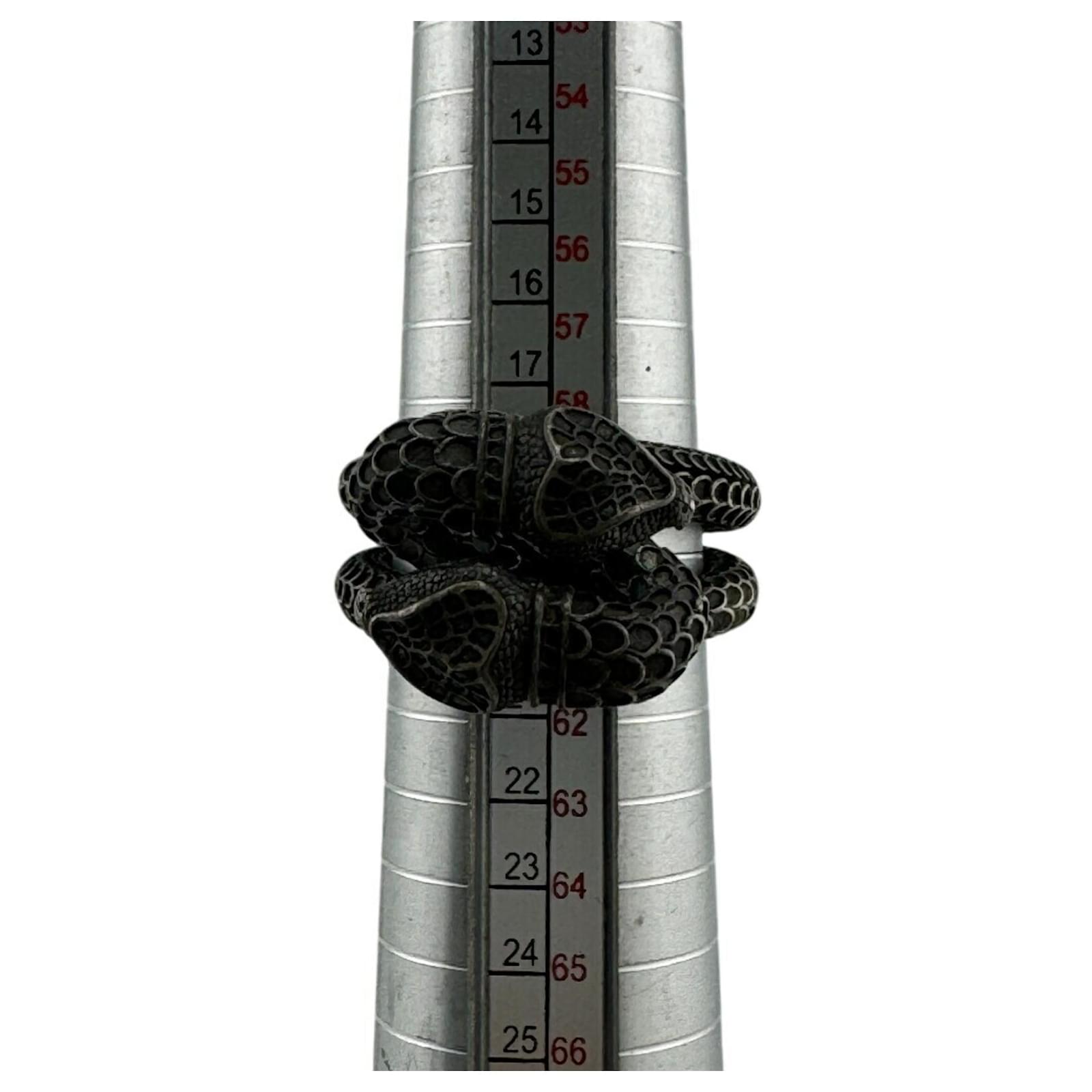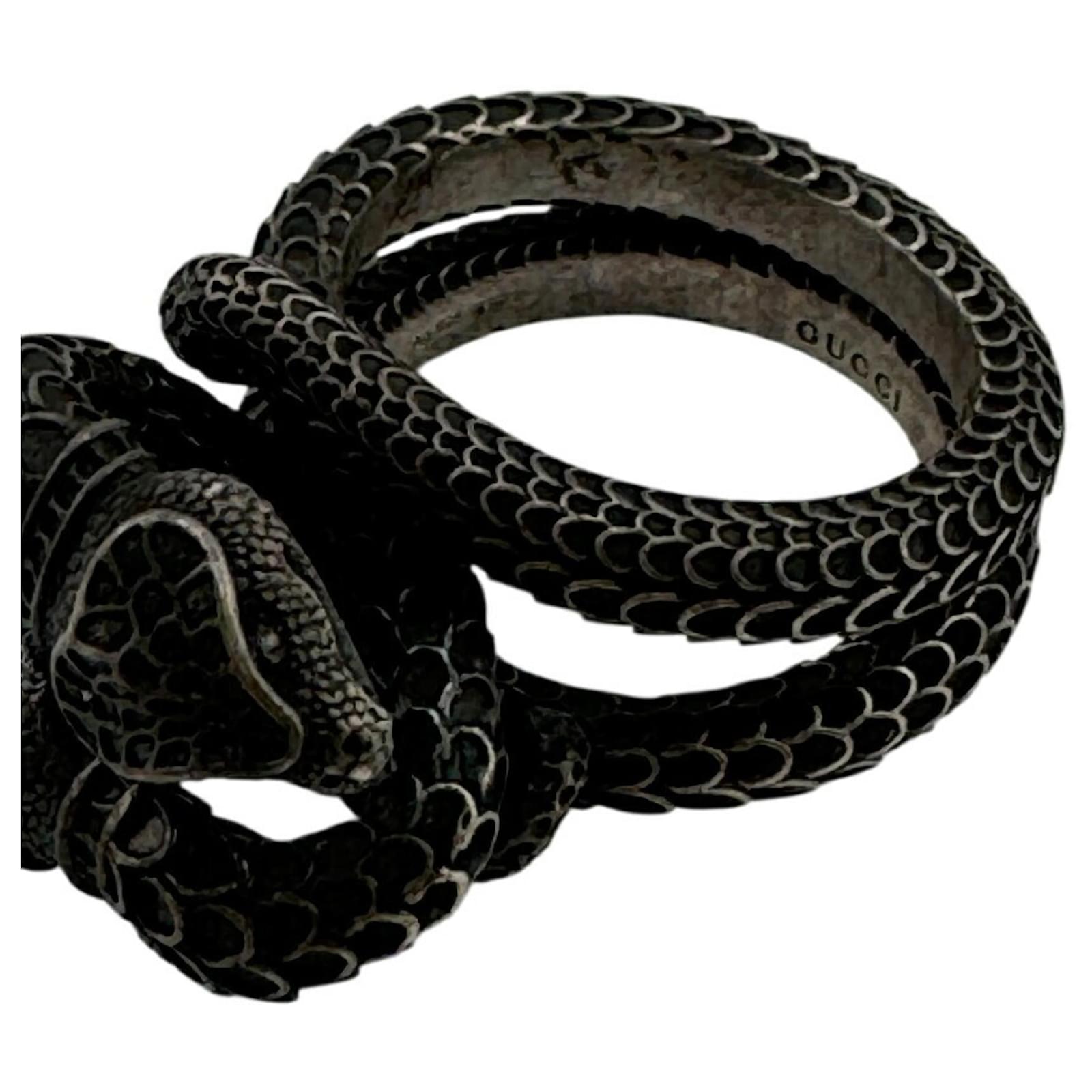 This GUCCI Garden Snake Ring is a silver band ring made from Silver 925. It features a JP size of 20 and a US size of 10, with an inner diameter of 20.00mm and a width of 2.5mm. The ring is classified as used but is in good condition, showing slight traces of use, scratches, and dirt. It comes with a box and a dust bag for storage. Potential buyers are encouraged to review the images for a detailed view of the item's condition and included accessories.
