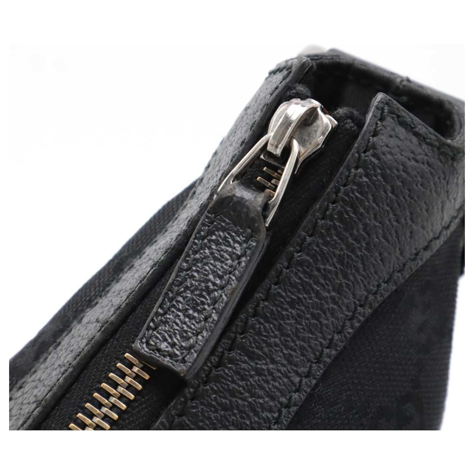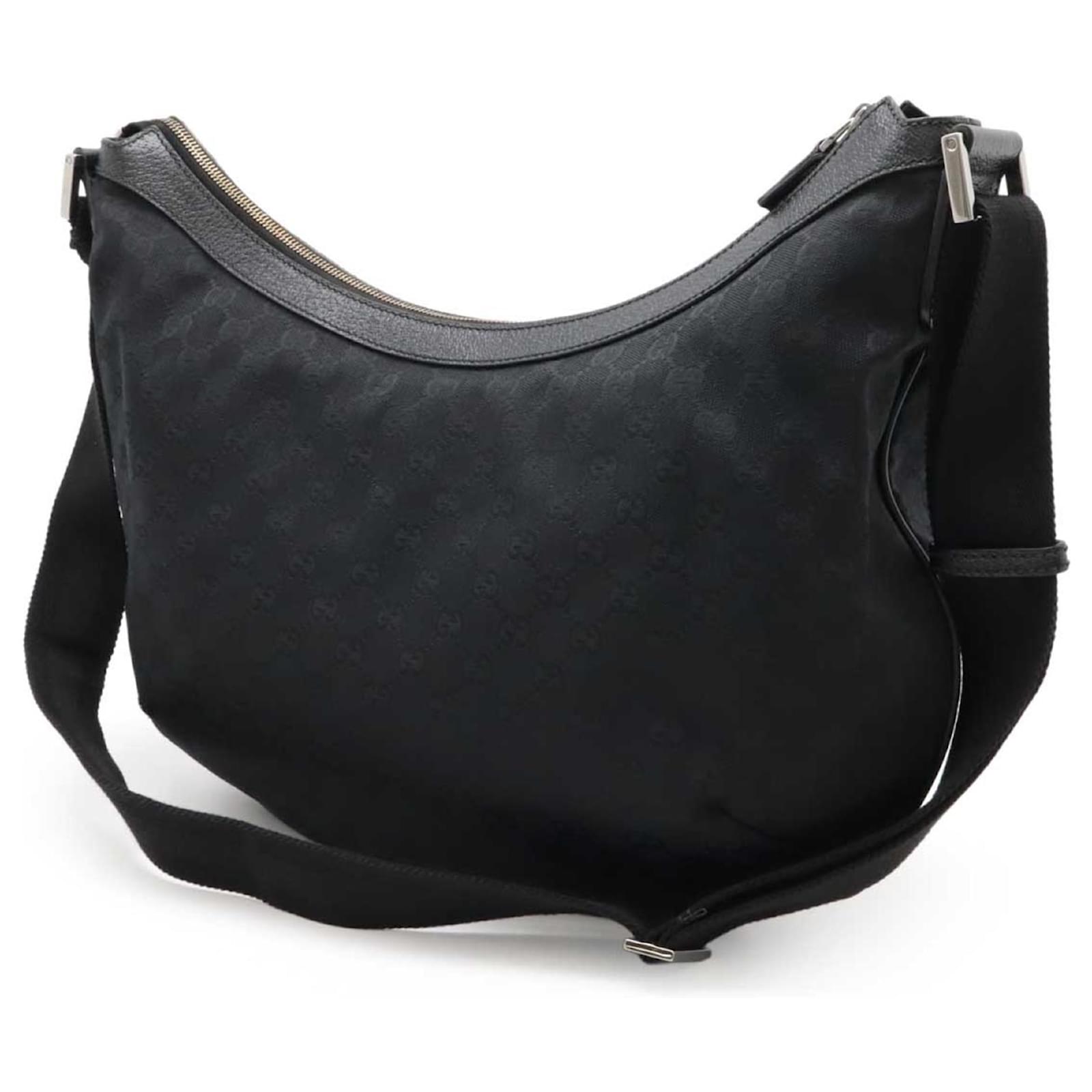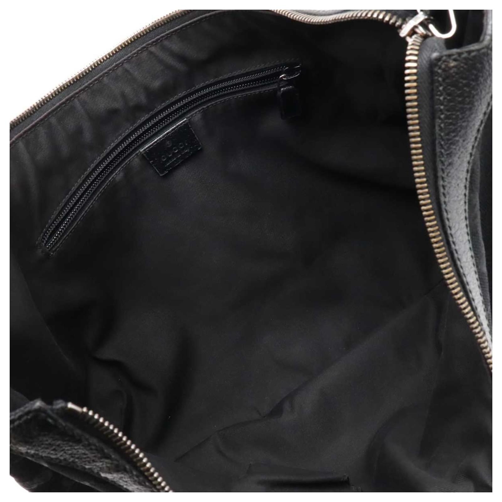 This Gucci shoulder bag is crafted from GG canvas and leather, featuring a sleek black color and silver hardware. It has a zipper closure and includes an inner zipper pocket along with a phone holder for added convenience. The bag measures 28cm in height, 43.5cm in width, and has a strap length of 124cm, making it adjustable for comfort.