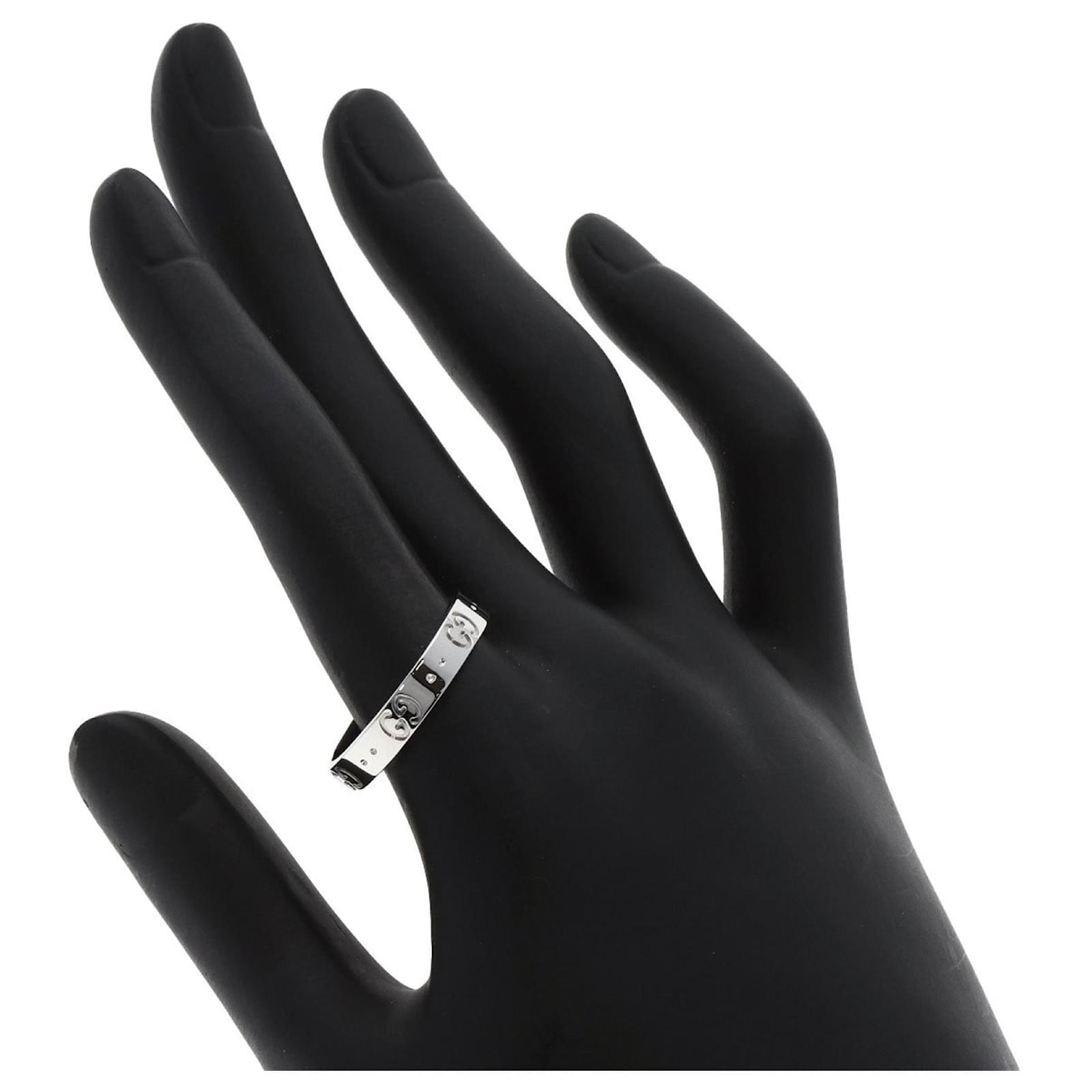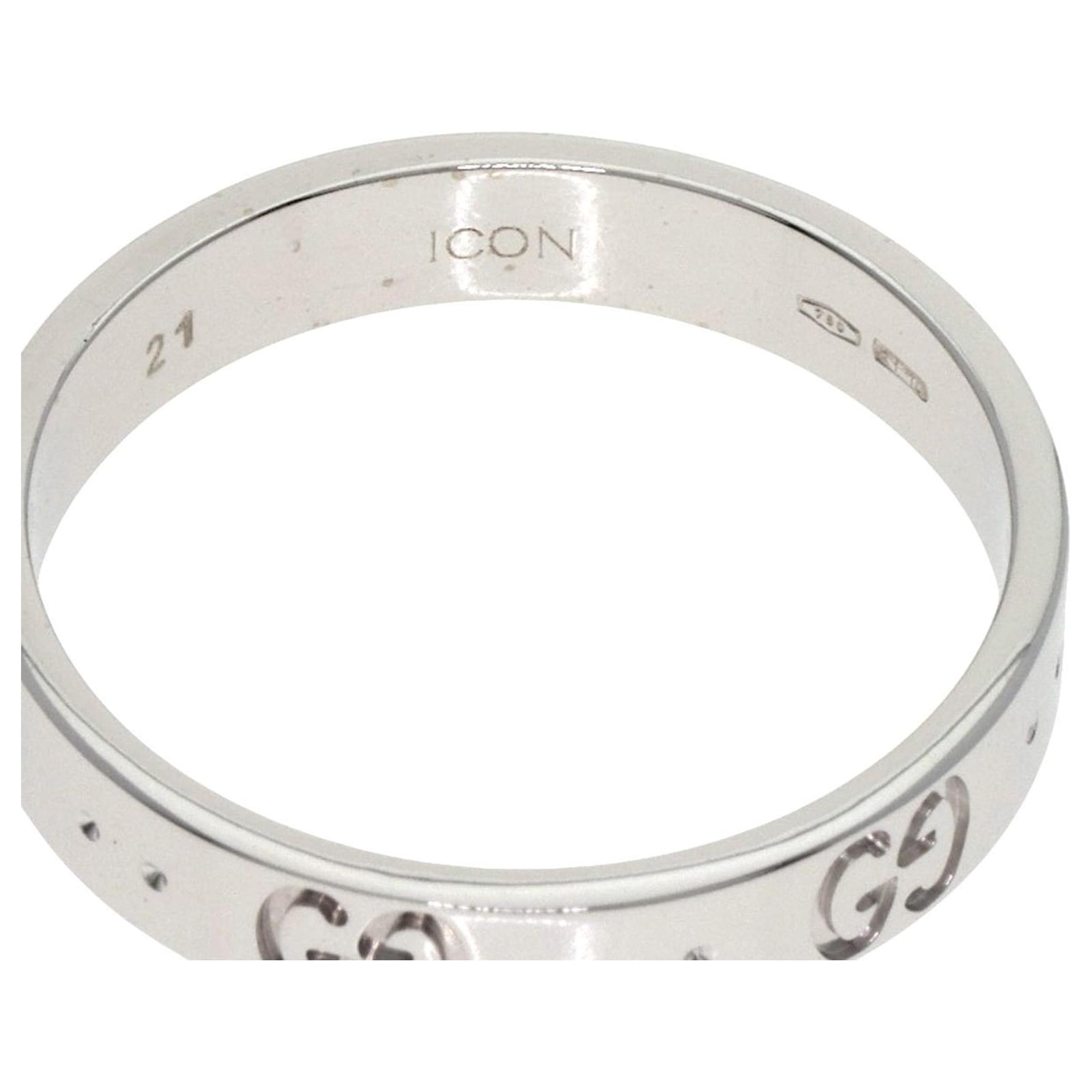 This Gucci Icon band ring is crafted from 18K white gold, featuring a width of 3.9mm and a total weight of 4.4g. Designed for men, it is available in size 21 JP or size 10 US. The ring is pre-owned and classified as being in very good condition, with minor traces of use including some scratches and dirt. It has been polished for maintenance. Please refer to the accompanying images for a detailed view of the item’s condition, as it does not come with additional accessories.