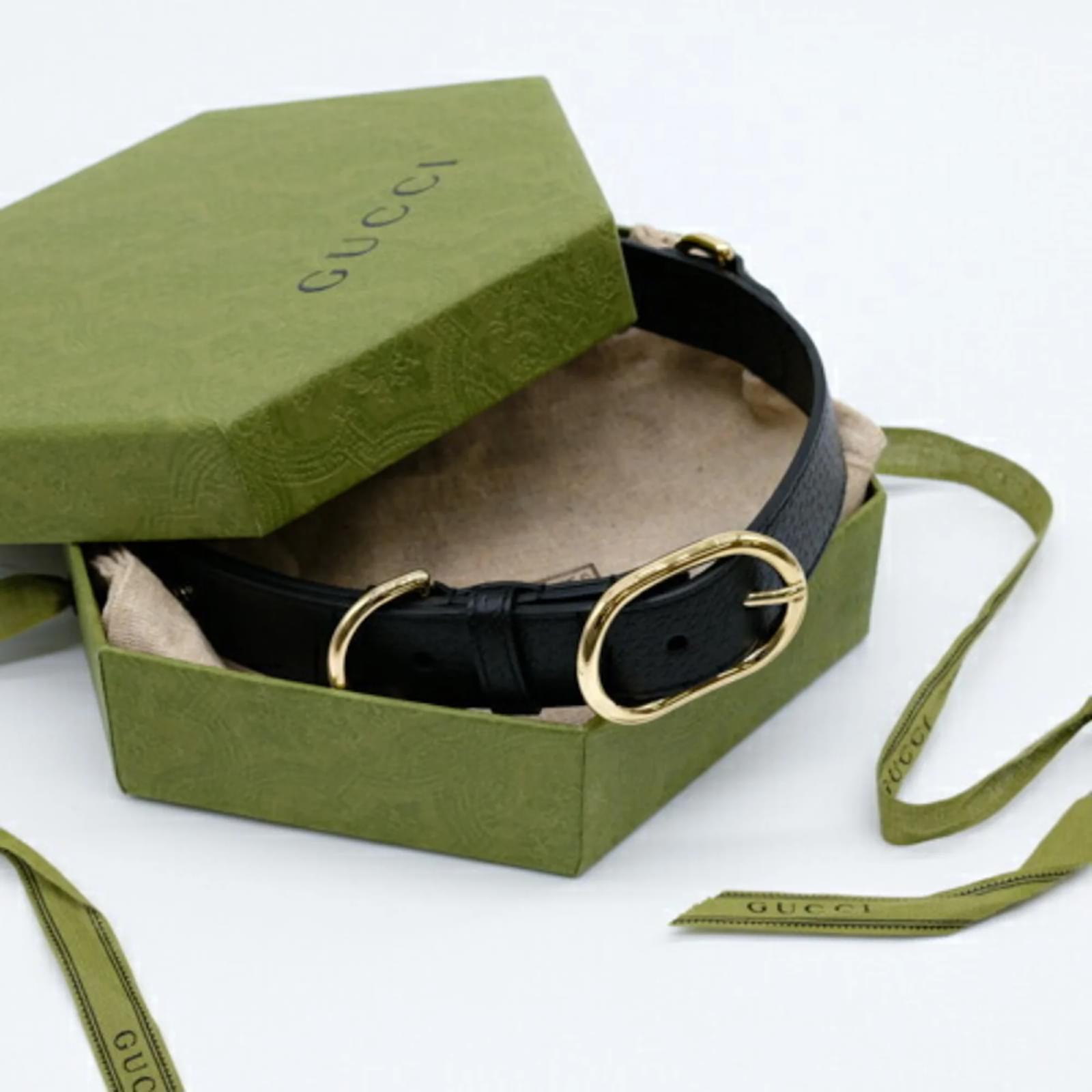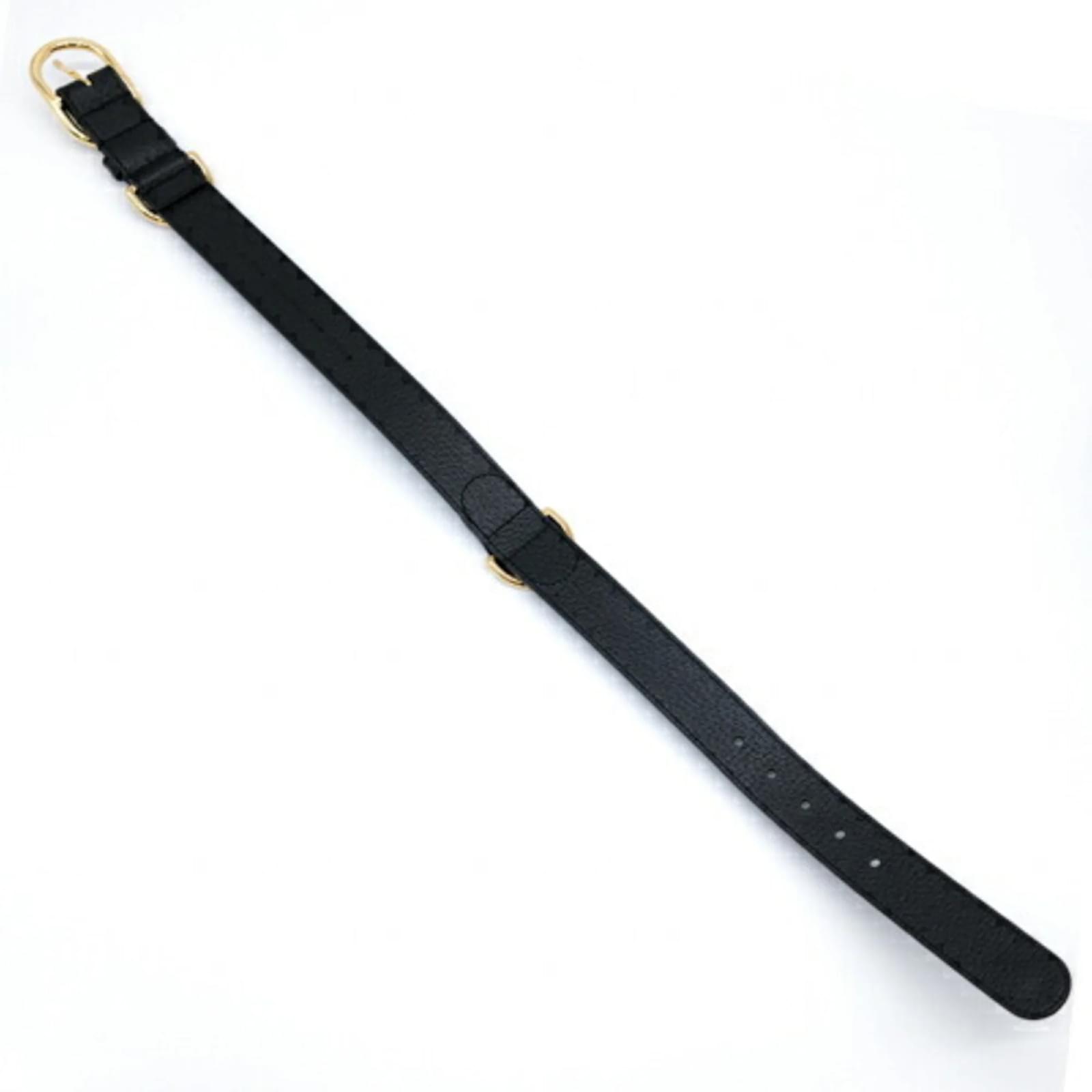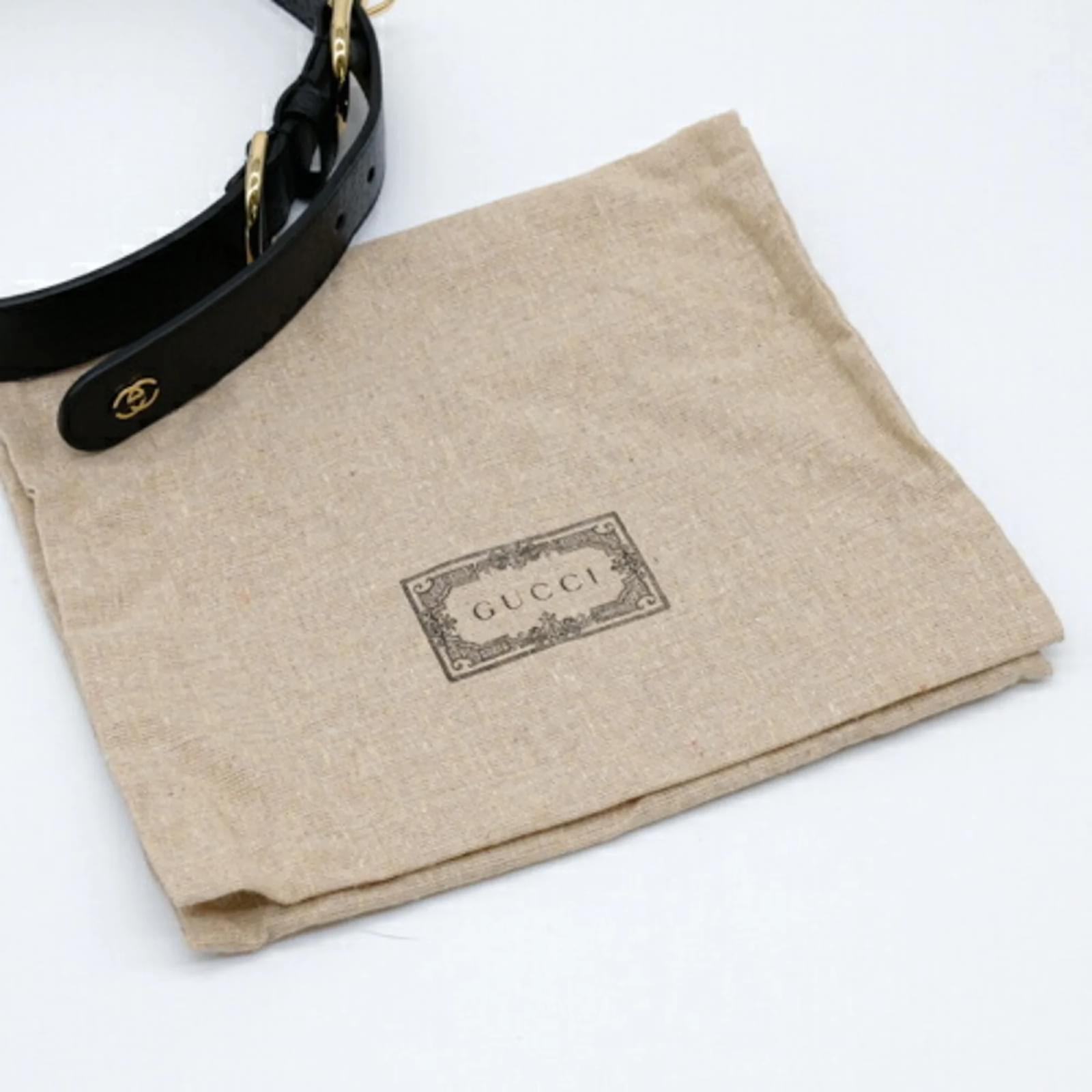 This Gucci Interlocking G Large Pet Dog Collar is designed for dogs and features a stylish black and gold color scheme. Made from leather, the collar measures between 48cm and 56cm (18.89'' - 22.04'') in length, making it suitable for various dog sizes. The item is in opened but never used condition, with insignificant traces of use, scratches, and dirt. It comes with a box and dust bag for storage. Before purchasing, it is recommended to refer to the images for the exact condition and included accessories.