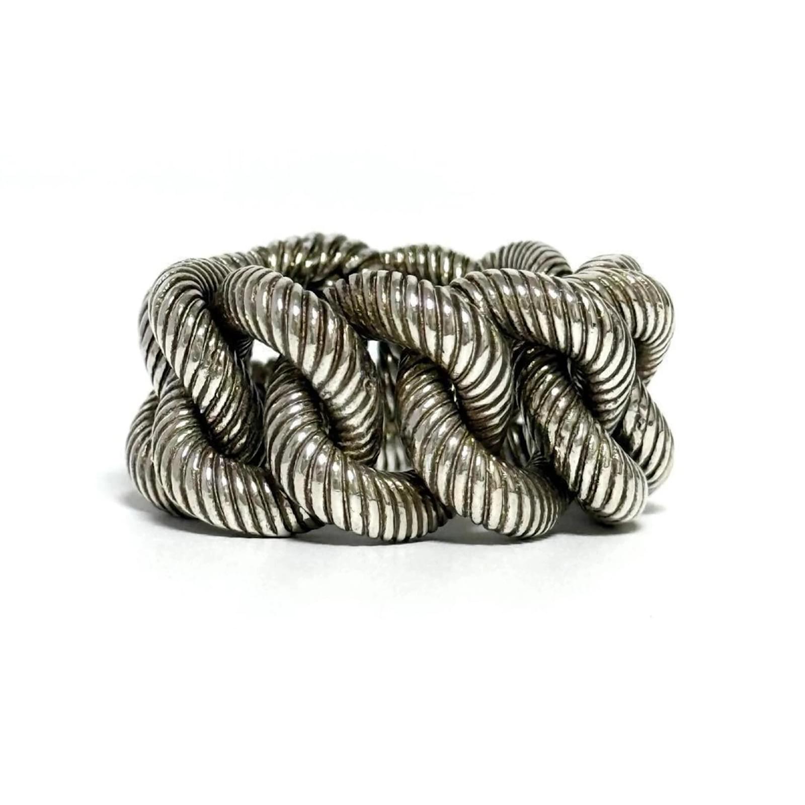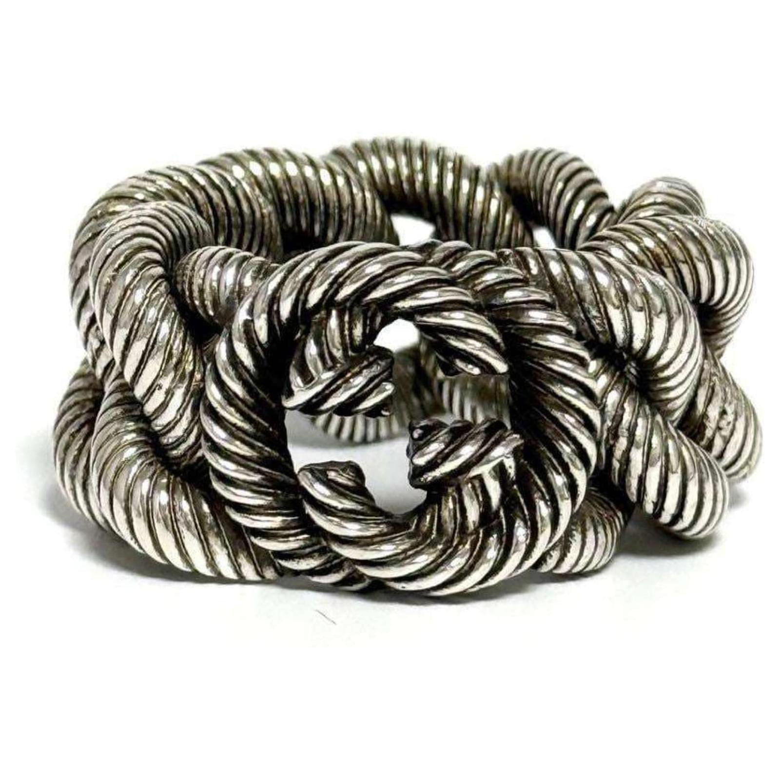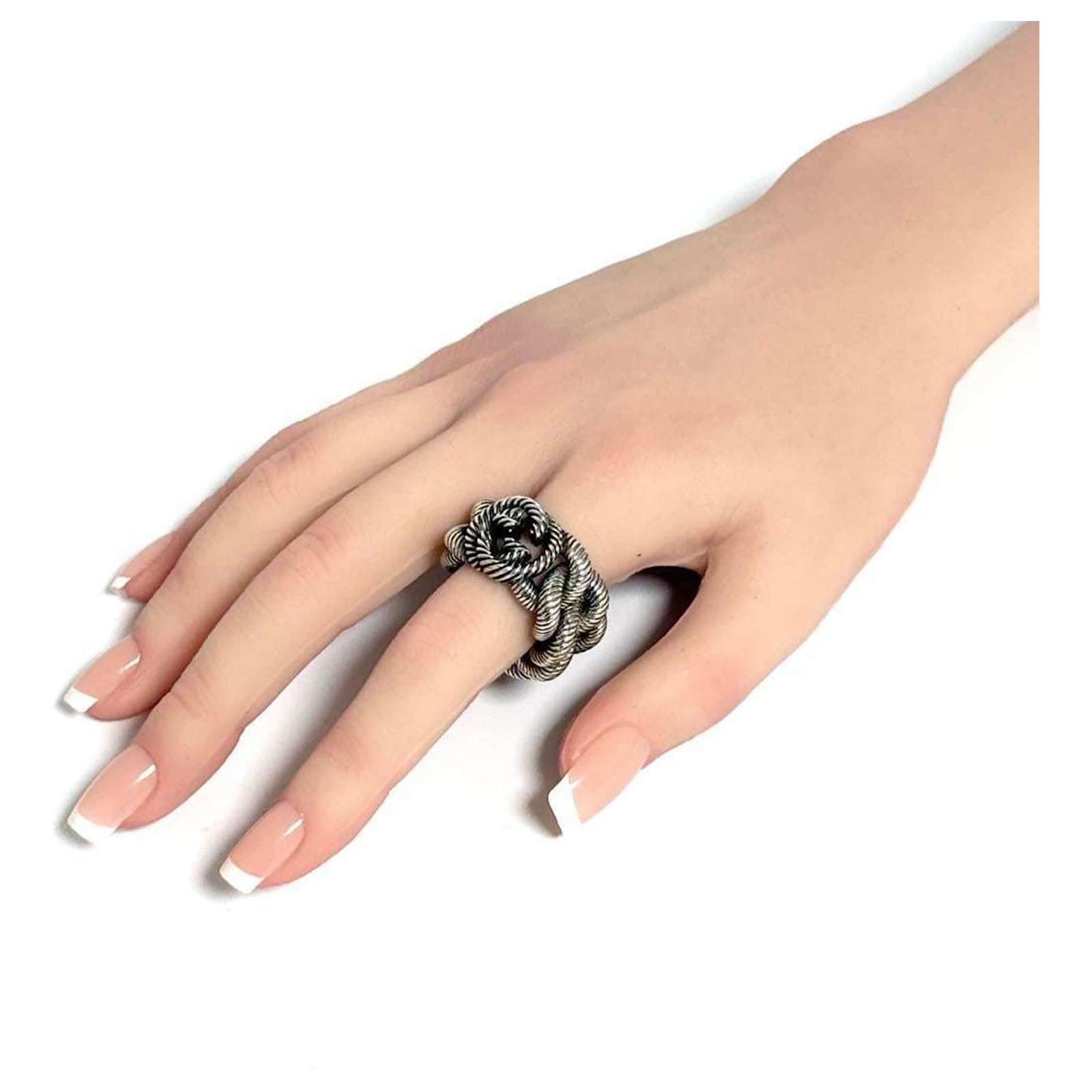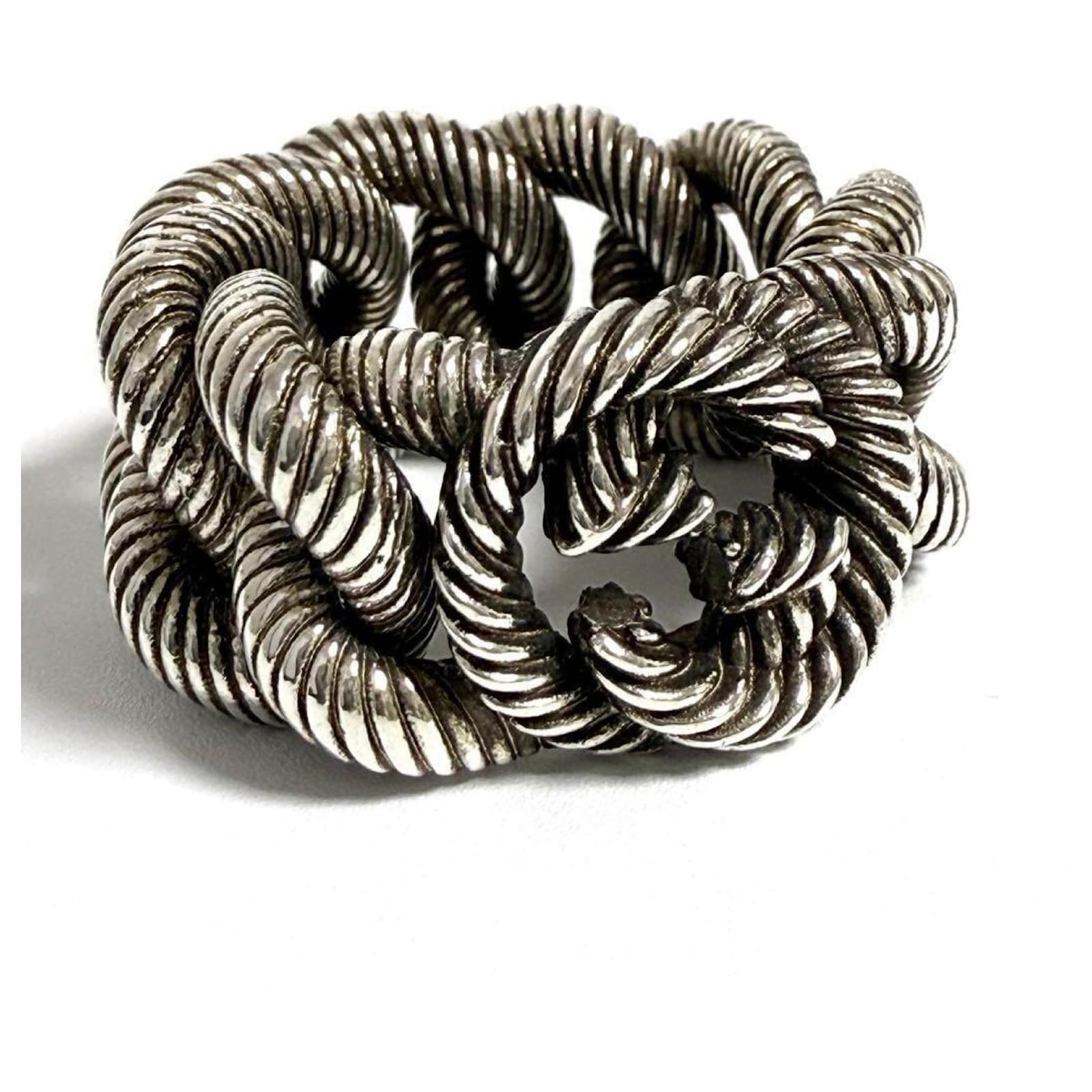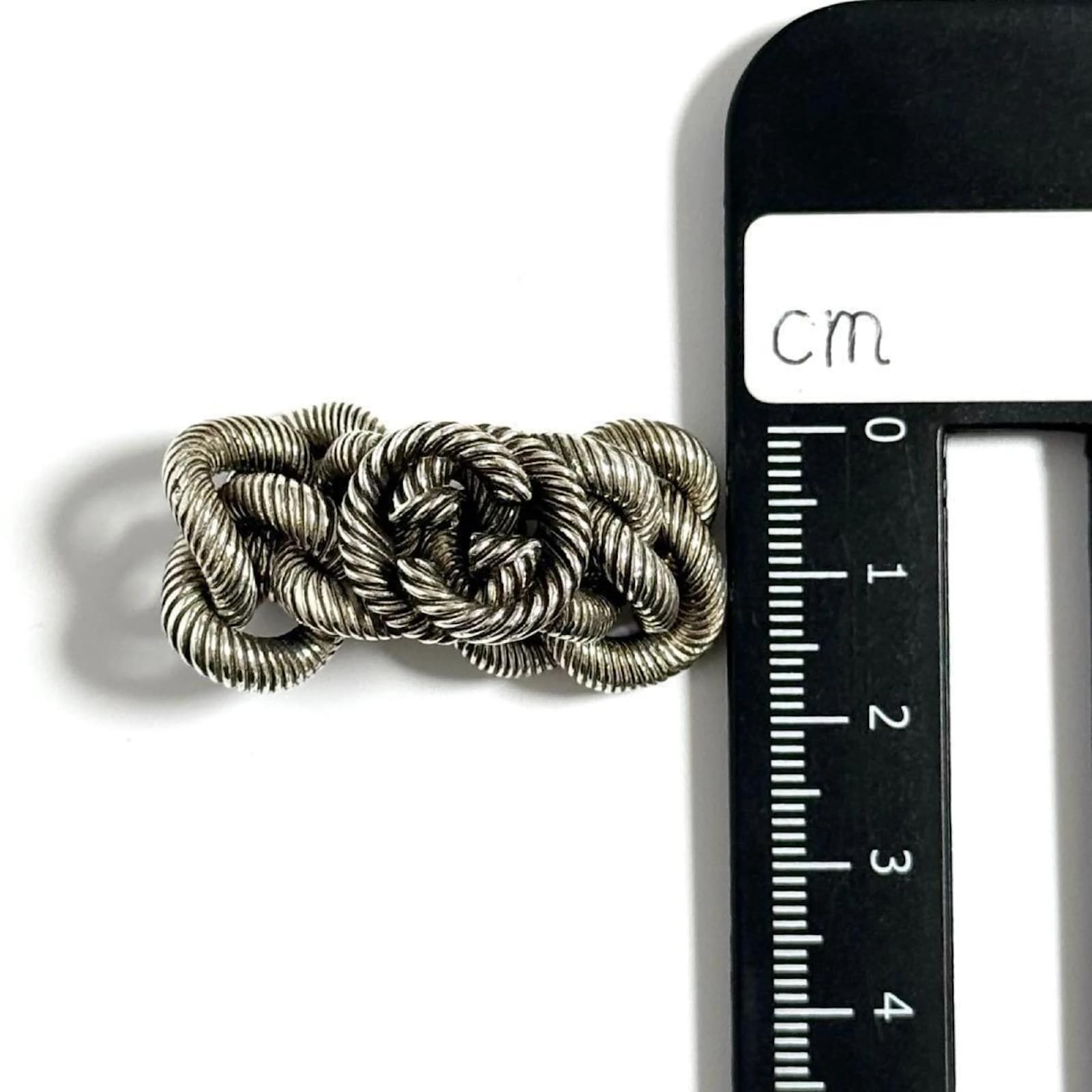This Gucci Men's Gourmet Chain Ring is crafted from Silver 925 and features a band design. It is available in a Japanese size 19, which corresponds to a US size 9.5. The ring is classified as used but is in very good condition, with only slight traces of use, including minor scratches and dirt. It is important to review the provided images for a clear understanding of the item's condition. No additional accessories are included with the purchase.