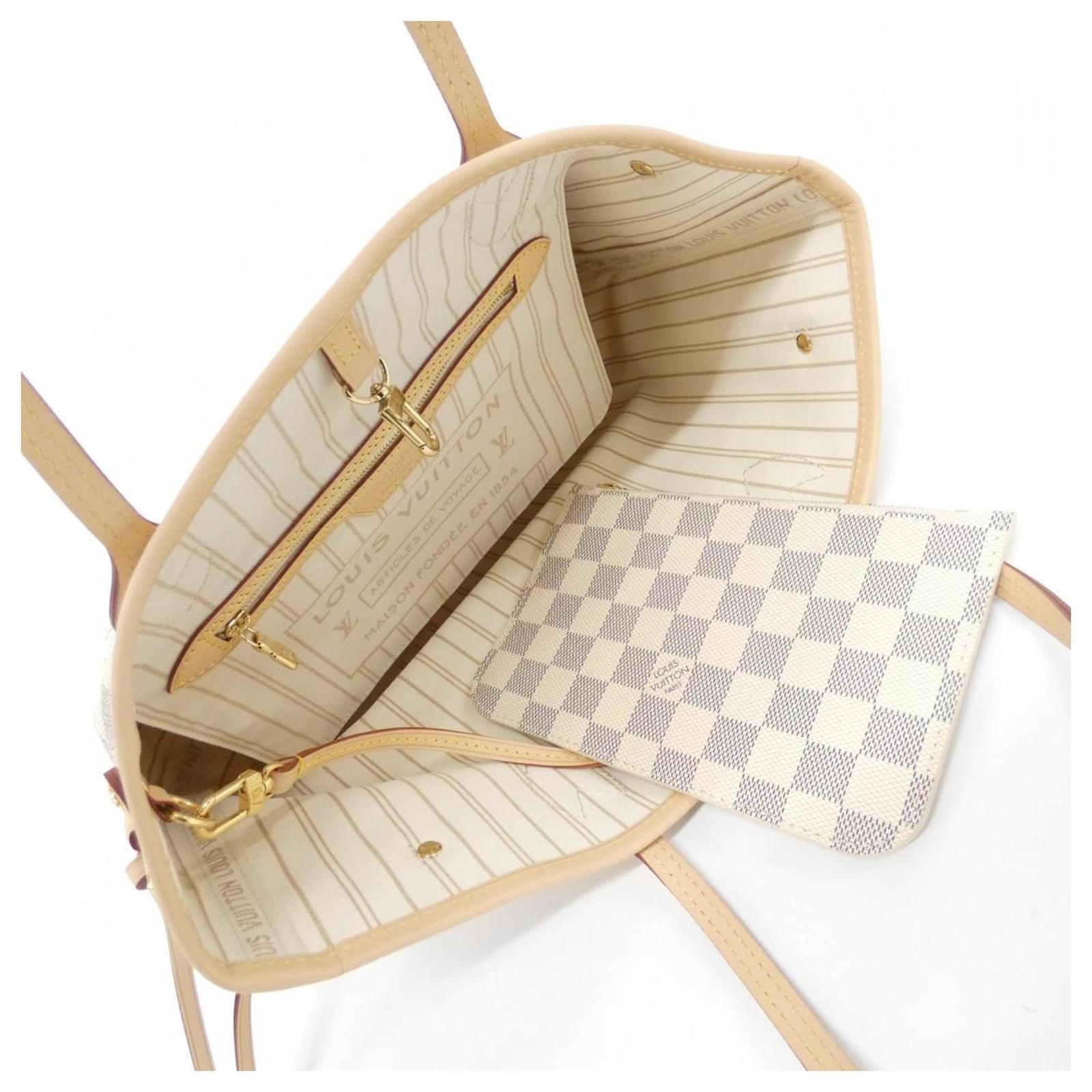The Louis Vuitton Damier Azur Neverfull PM handbag is crafted from coated canvas in a light azur color. This stylish handbag measures 22cm in height, 39cm in width, and 13cm in depth, making it a practical choice for daily use. It is a pre-owned item in very good condition, classified as Rank A, with only slight traces of use, including minor scratches and dirt. The handbag comes with a dust bag and a pouch, and potential buyers are encouraged to review the images for a detailed view of its condition and included accessories. The model number for this item is N40605.