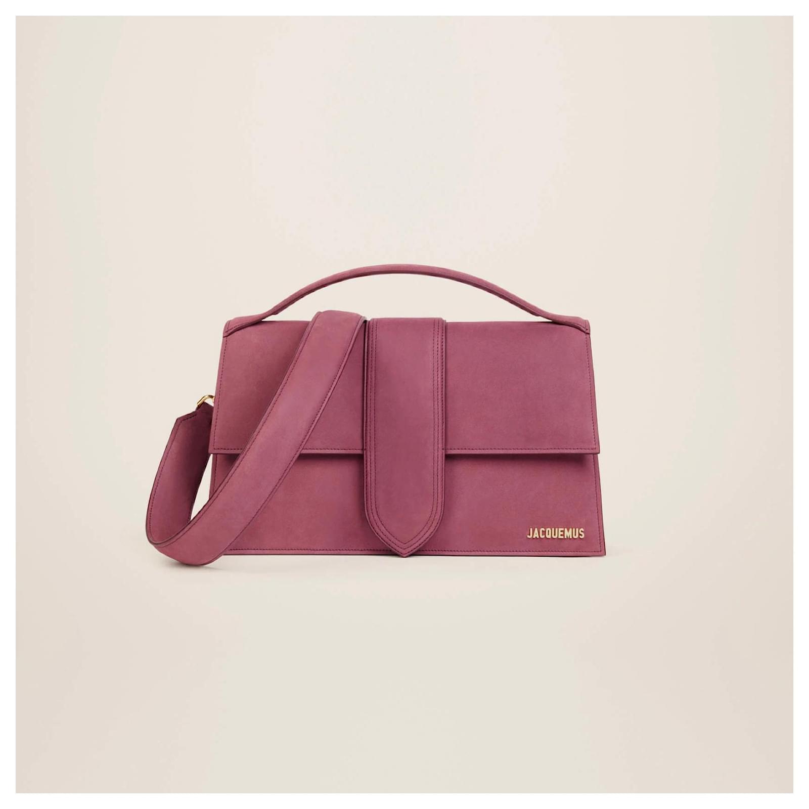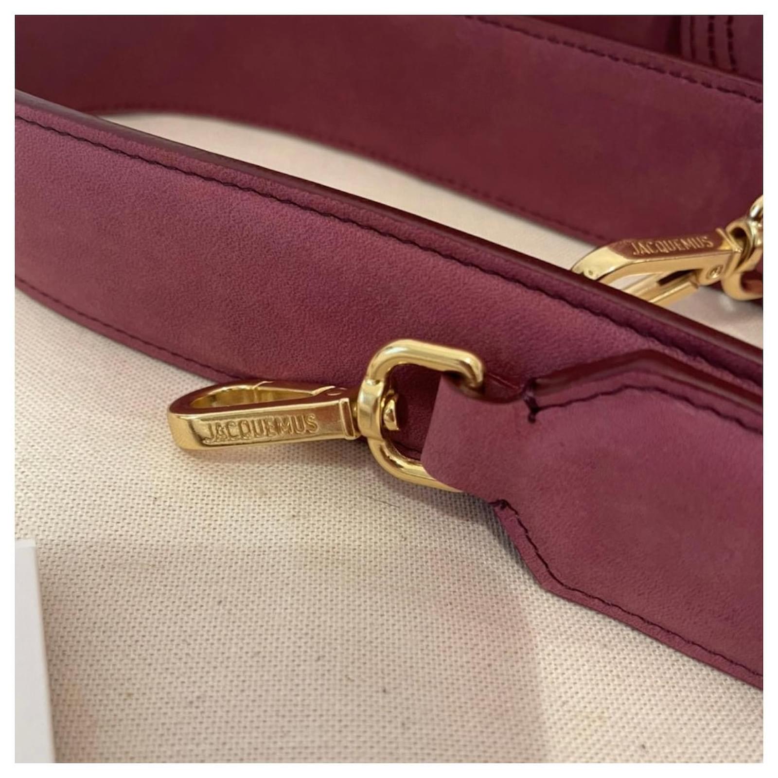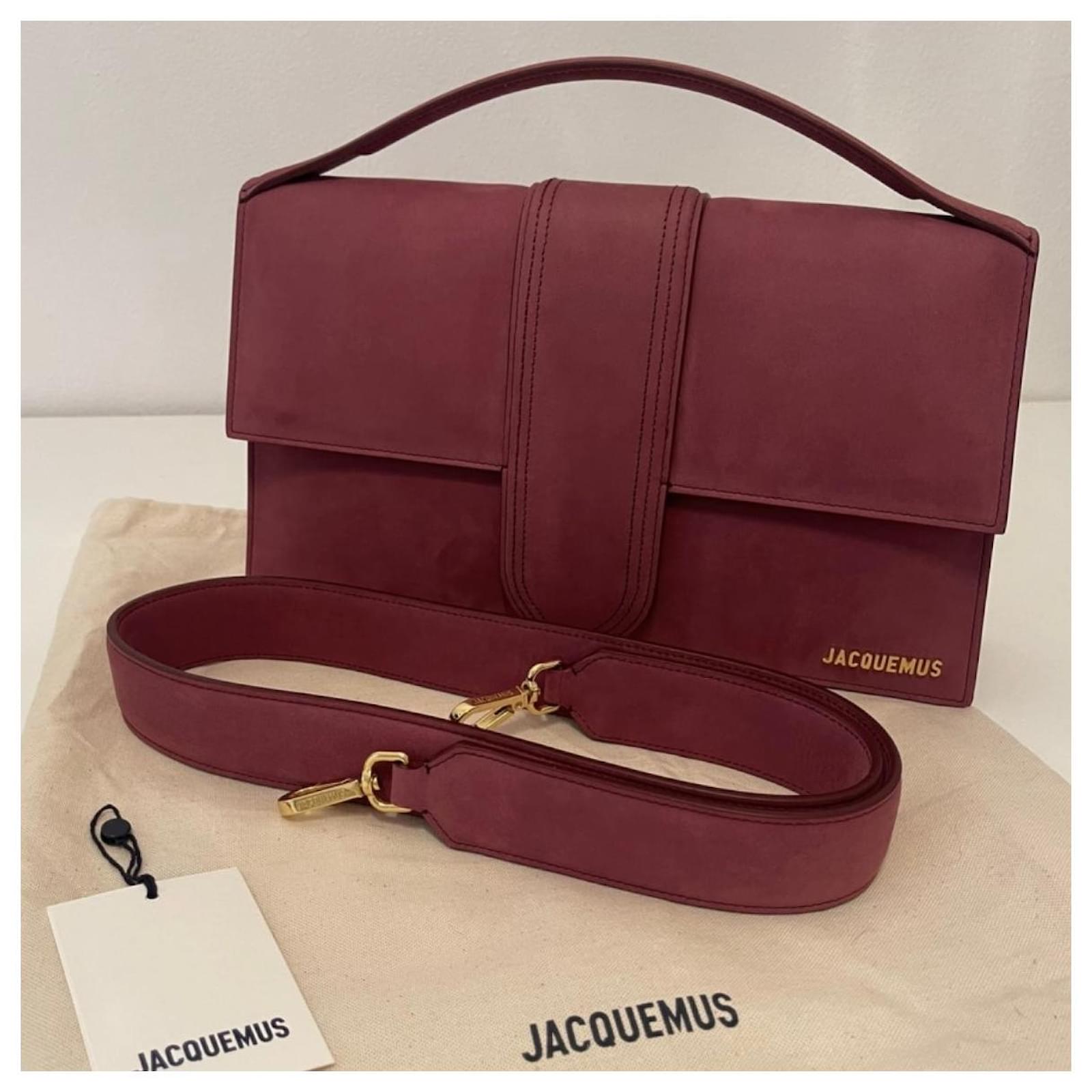 Large flap bag. - Structured bag in burgundy/rosewood suede. - Flap with magnetic tab. - Removable adjustable shoulder strap. - Engraved carabiner. - Rear patch pocket. - Inside pocket. - Gold logo and metalwork. - Fully lined in cotton. - Length: 34 cm. - Height: 20 cm. never worn with dustbag. shop value 990€