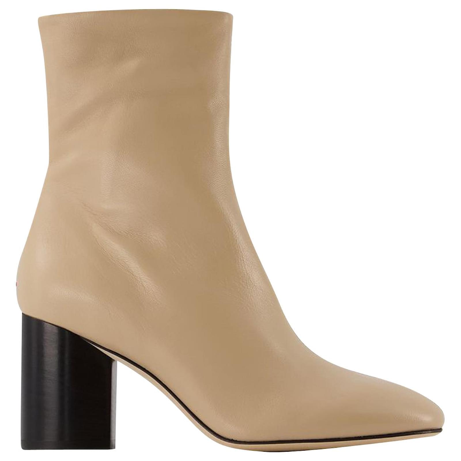These leather ankle boots from Aeyde are the ultimate in elegance. We love their structured look, and will be wearing ours with box-pleat trousers and a ribbed-knit sweater this winter. Heel: 75 cm. Colour : Beige - Latte. Main material: calfskin. Sole: leather. Closure: side zip. Toe: round. Fit: true to size - Sizing European.