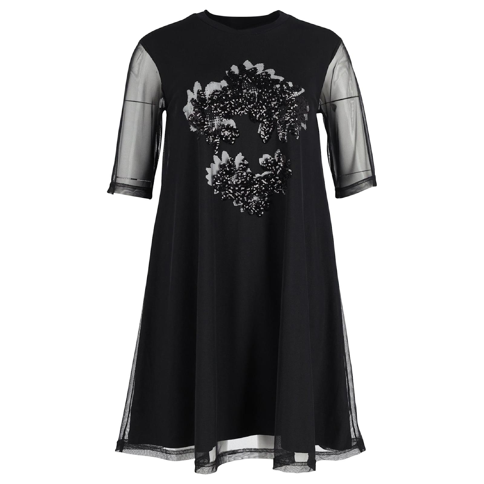 The McQ by Alexander McQueen Jersey & Mesh Dress with Appliqué Detail in Black Polyester is a short-length silk jersey dress with a round neck, short sleeves and an A-line shape. It features a mesh overlay and floral appliqué sequin embellishments.