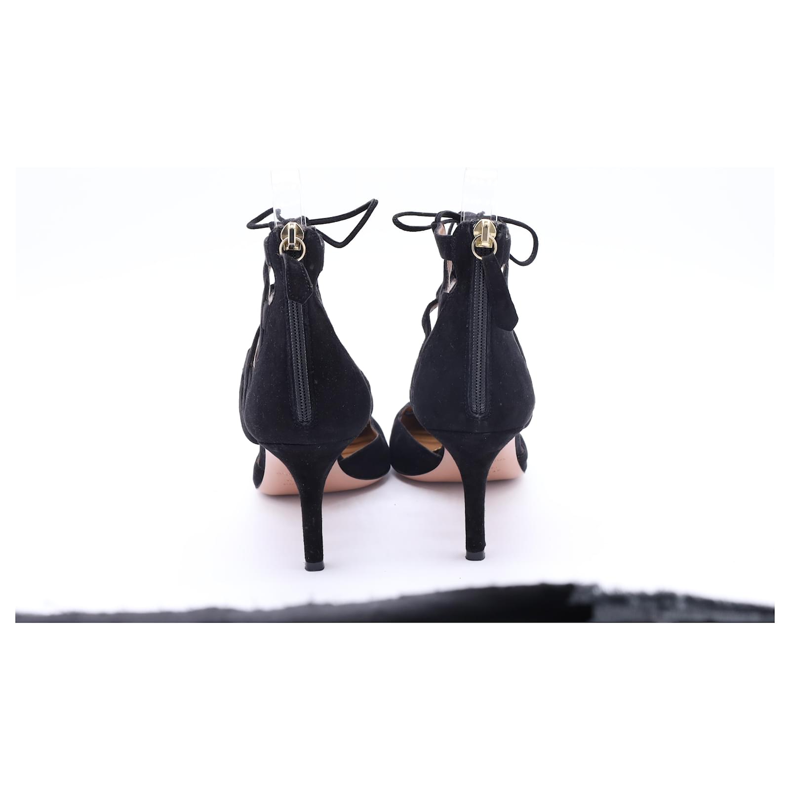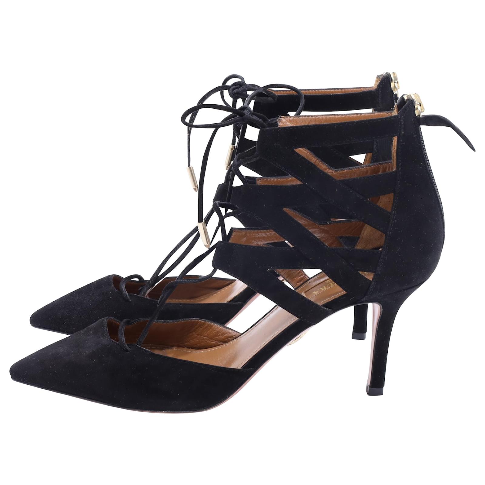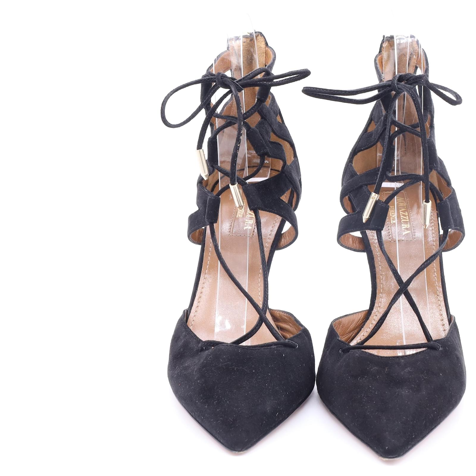 The Aquazzura Belgravia Pumps in rich black suede feature an elegant pointed toe, striking cutout sides, and a distinctive lace-up design that wraps gracefully around the ankle. With multistrap detailing and a sleek stiletto heel, this pair delivers a balance of bold sophistication and refined femininity.