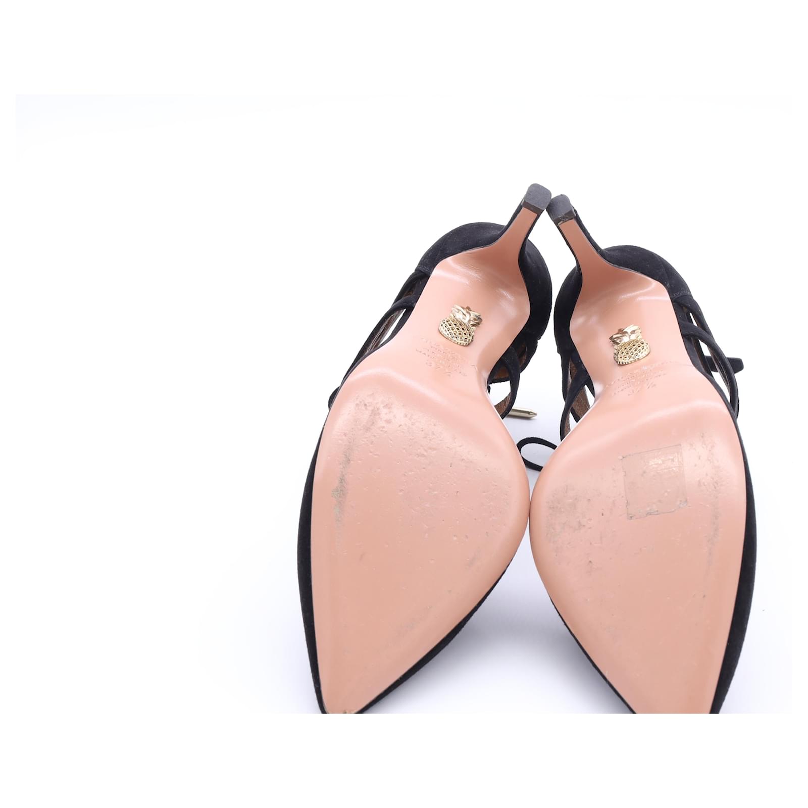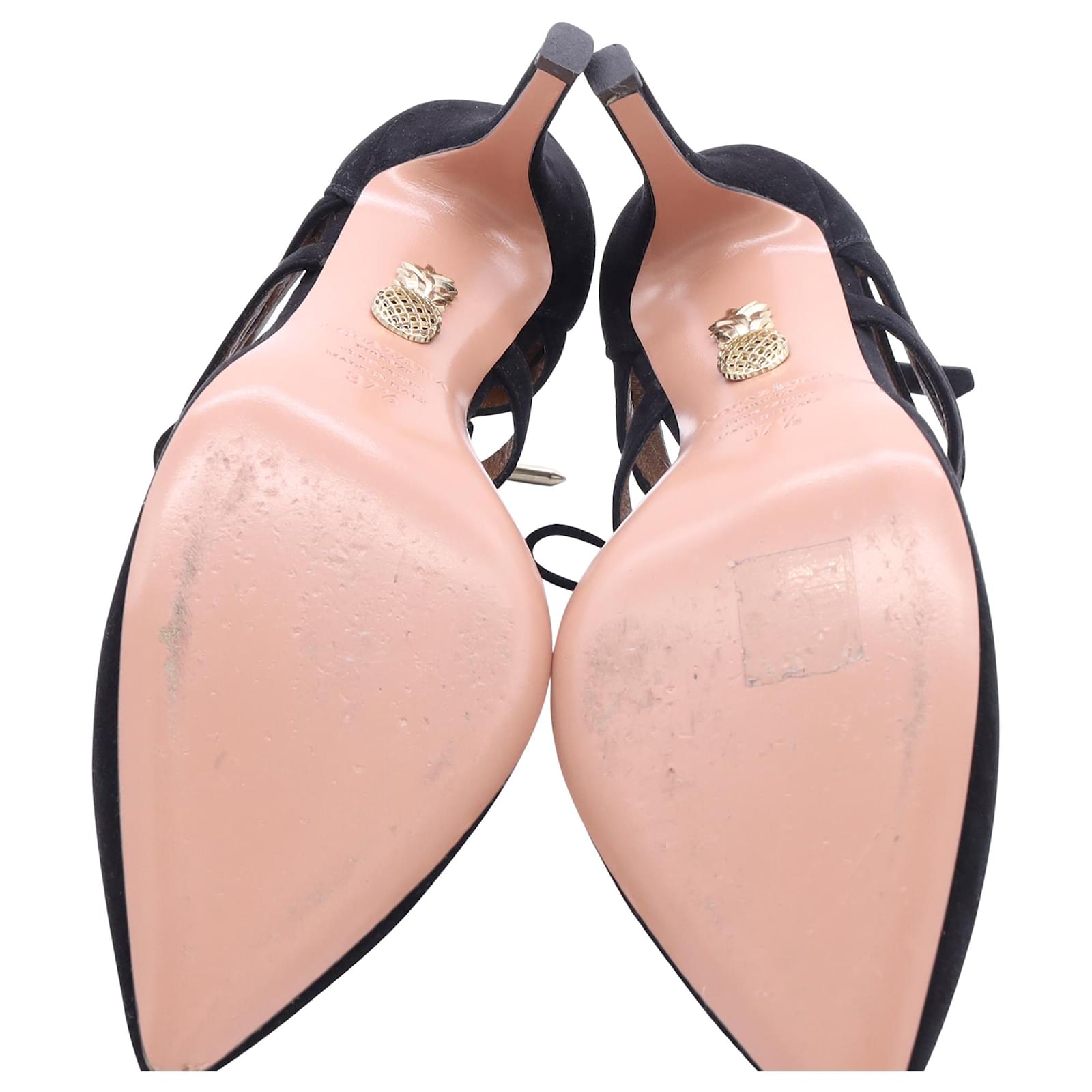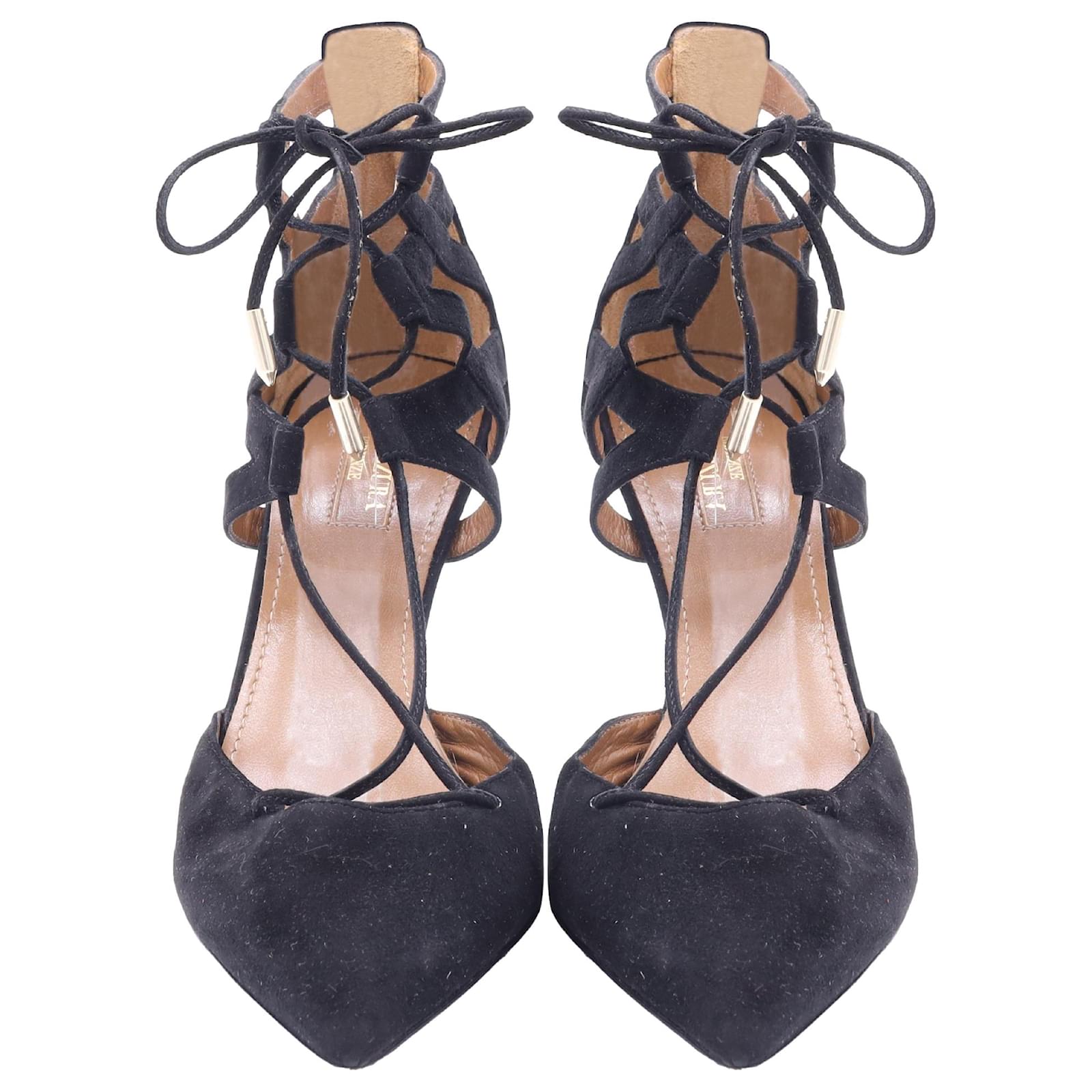 The Aquazzura Belgravia Pumps in rich black suede feature an elegant pointed toe, striking cutout sides, and a distinctive lace-up design that wraps gracefully around the ankle. With multistrap detailing and a sleek stiletto heel, this pair delivers a balance of bold sophistication and refined femininity.