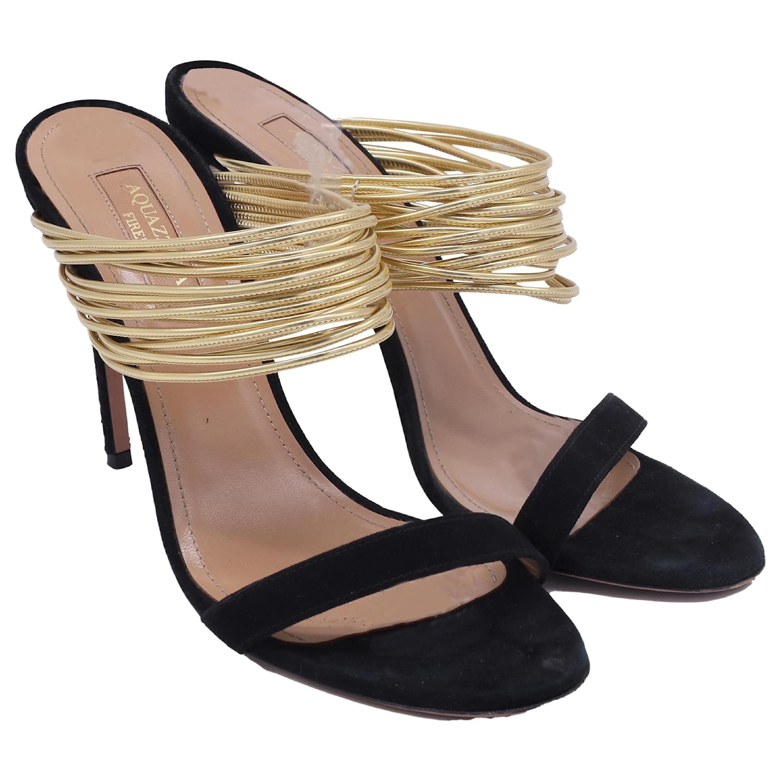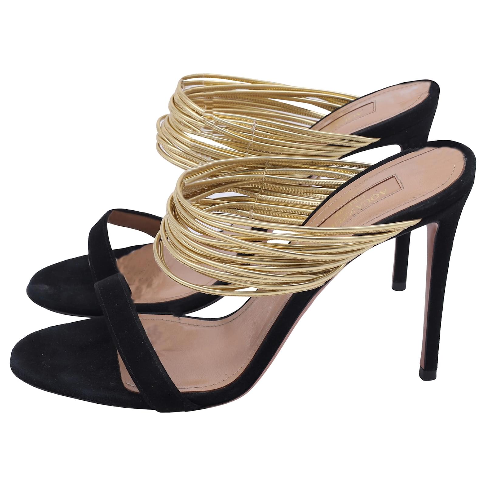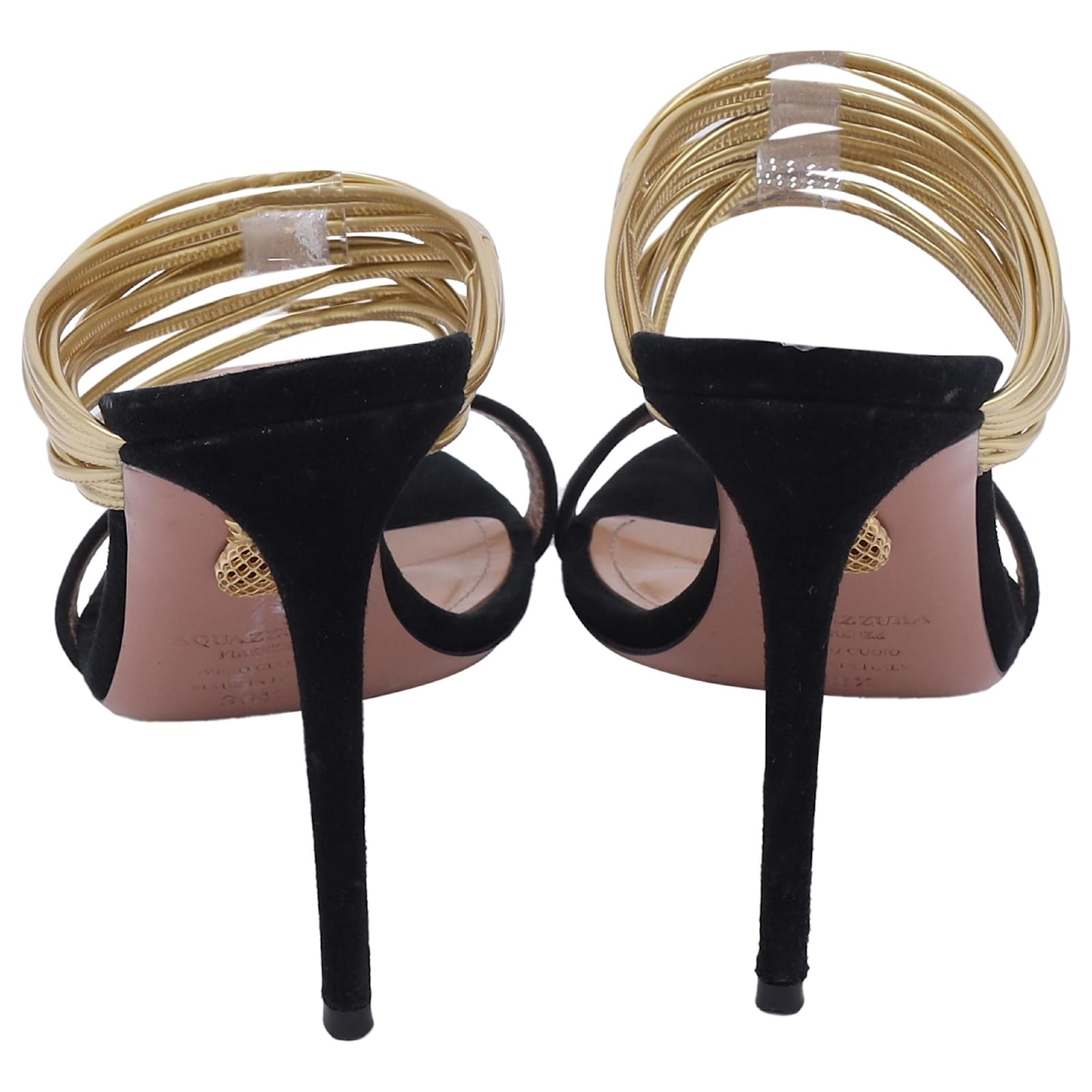 The Aquazzura Rendez Vous Sandals in Black Suede and Leather embody the brand’s signature blend of Italian glamour and modern femininity. Crafted with black suede and glistening metallic gold leather straps, they exude sophistication with every step. From Aquazzura’s 2019 collection, these heels are the ultimate statement of elegance, perfect for evenings that call for understated allure.