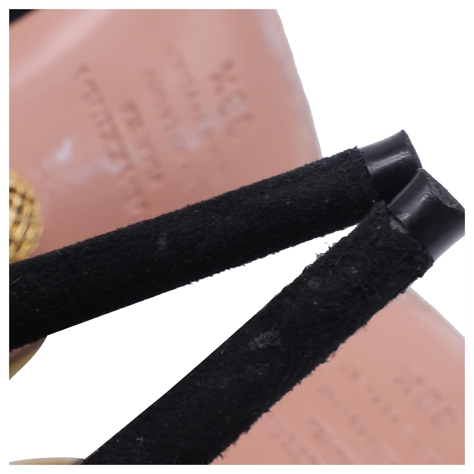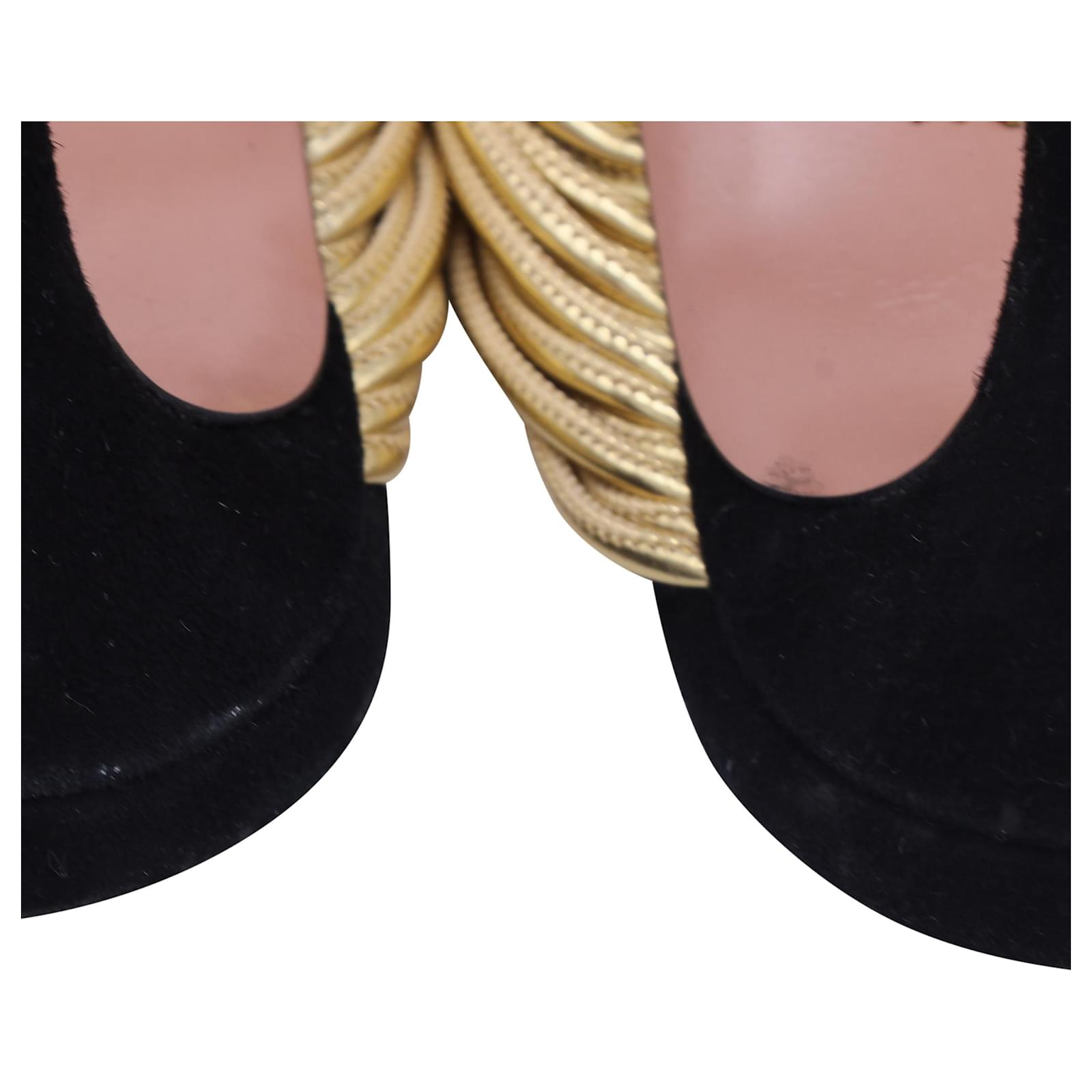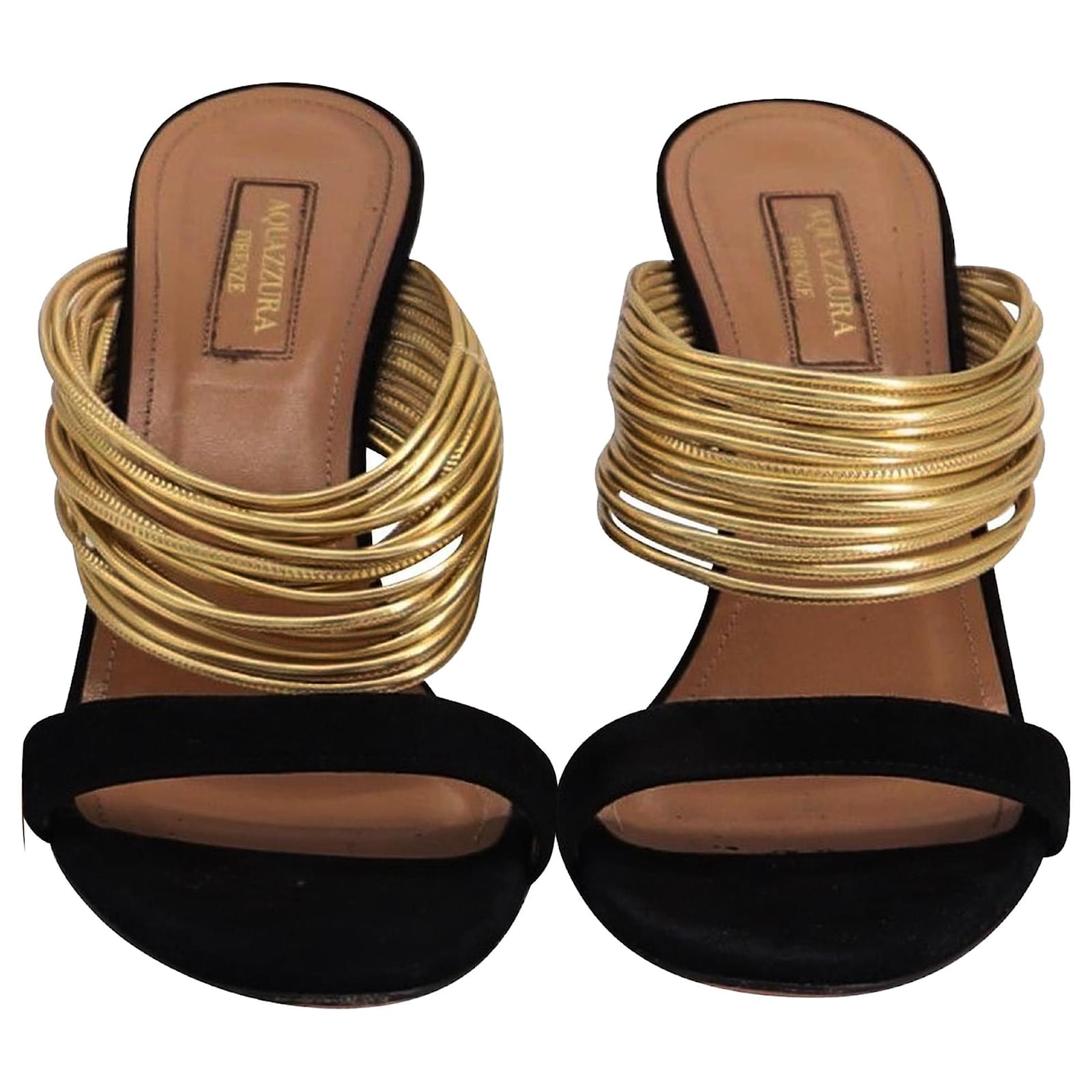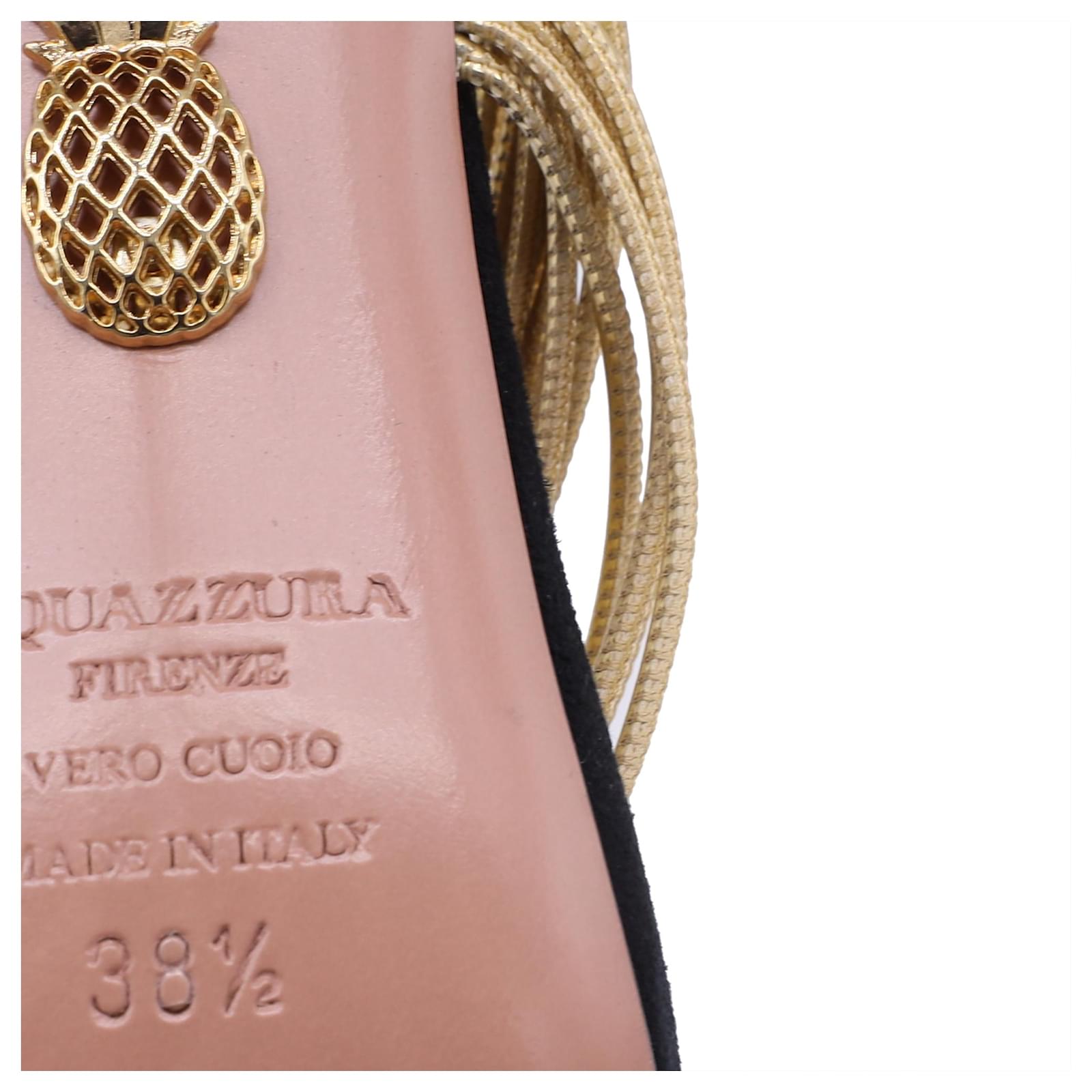 The Aquazzura Rendez Vous Sandals in Black Suede and Leather embody the brand’s signature blend of Italian glamour and modern femininity. Crafted with black suede and glistening metallic gold leather straps, they exude sophistication with every step. From Aquazzura’s 2019 collection, these heels are the ultimate statement of elegance, perfect for evenings that call for understated allure.