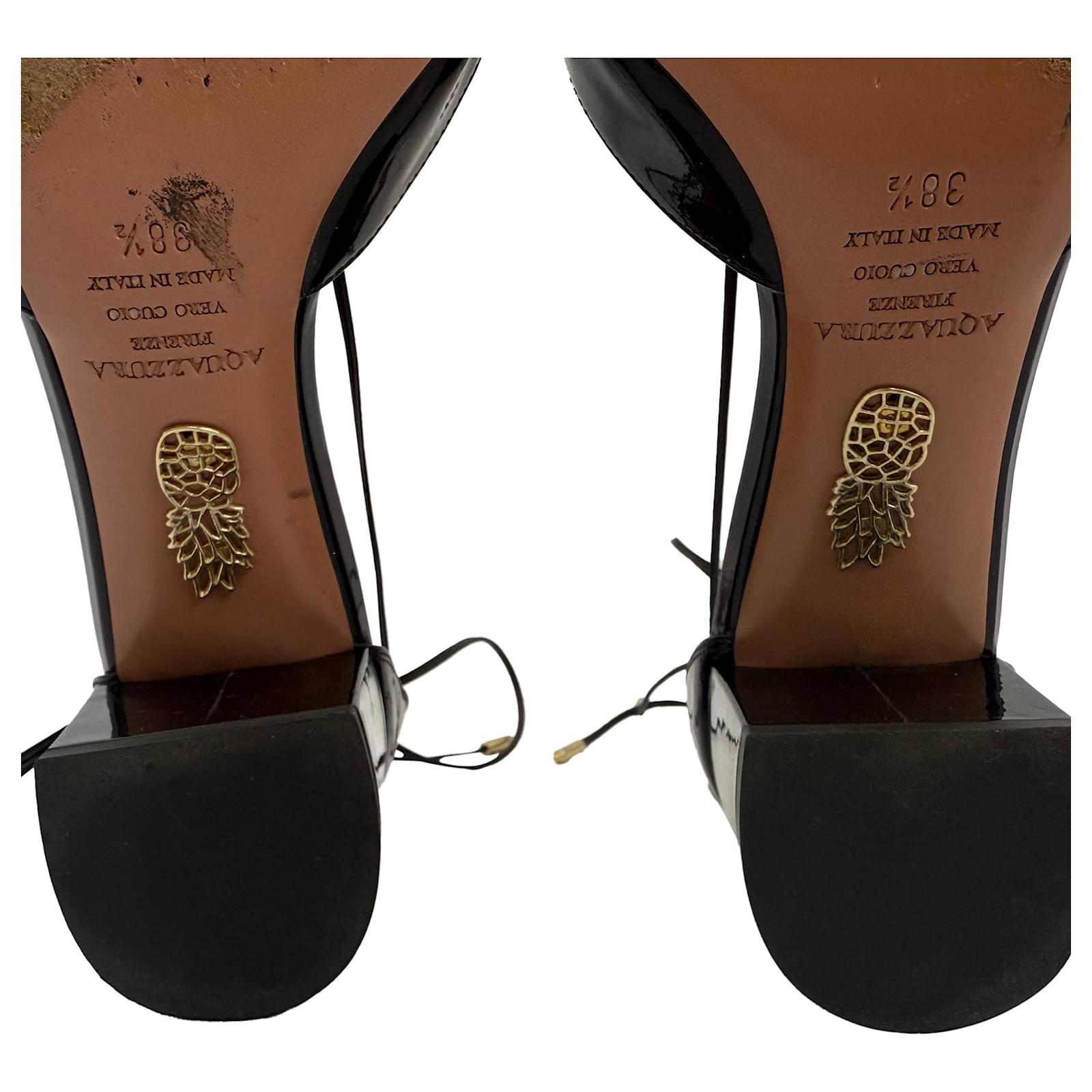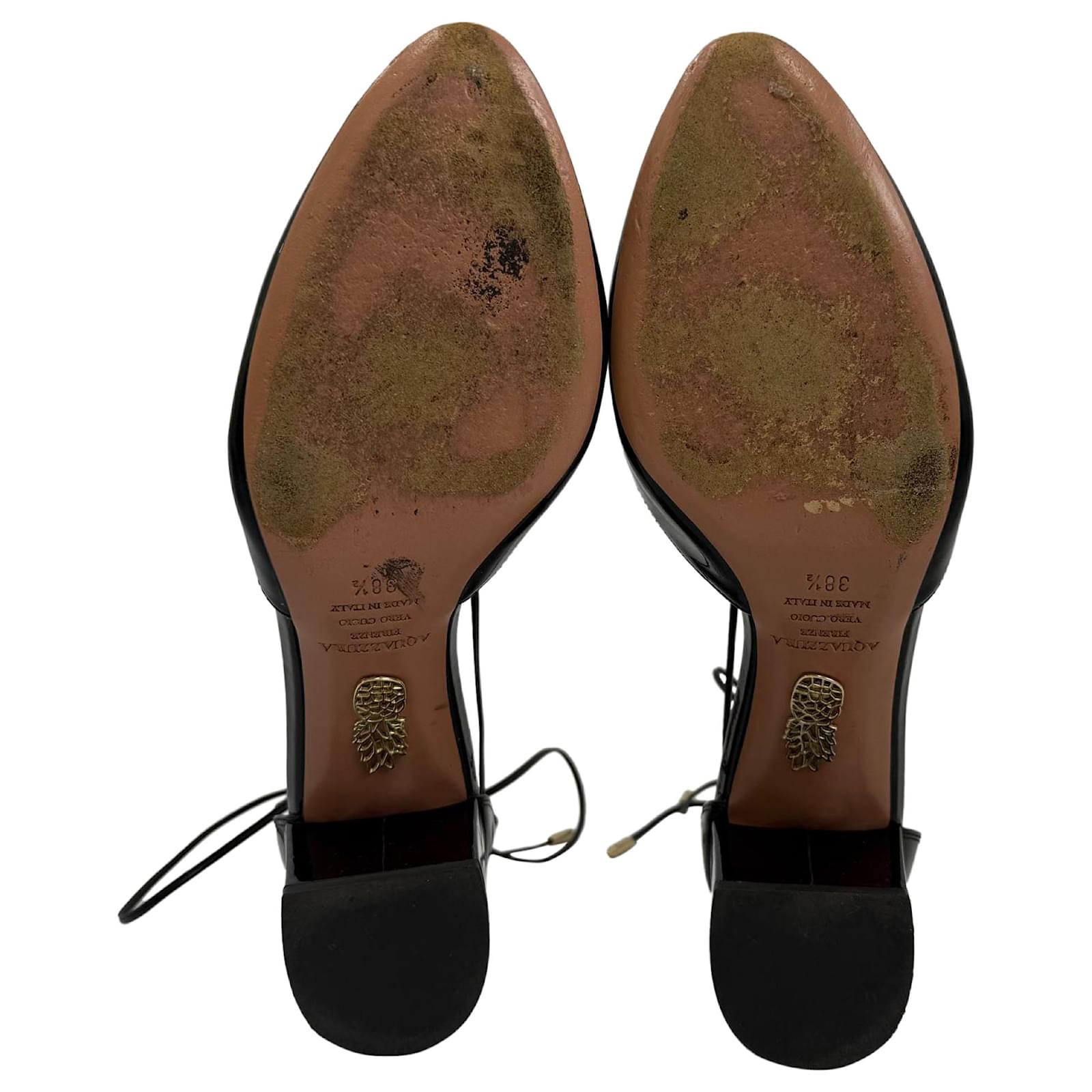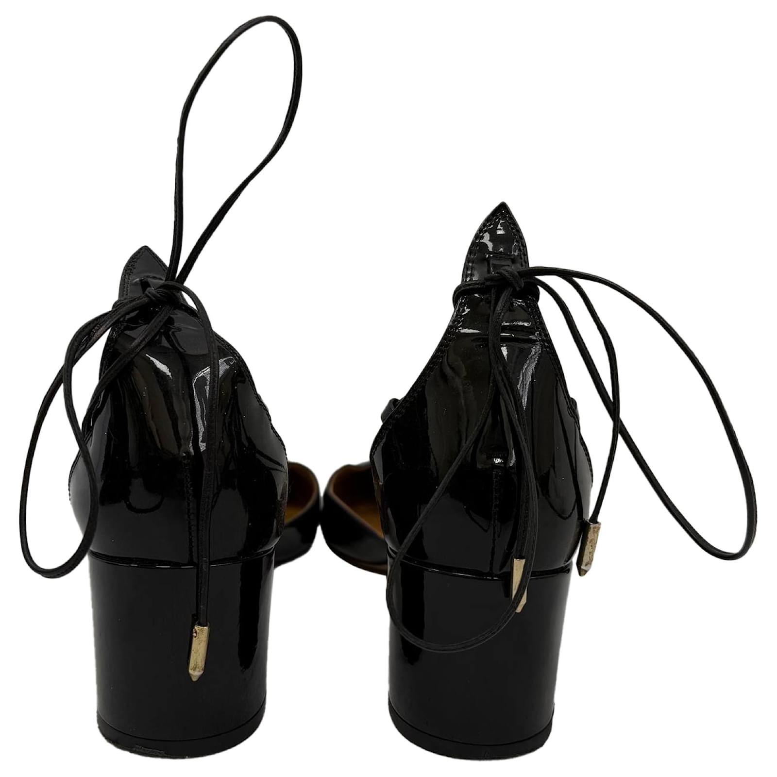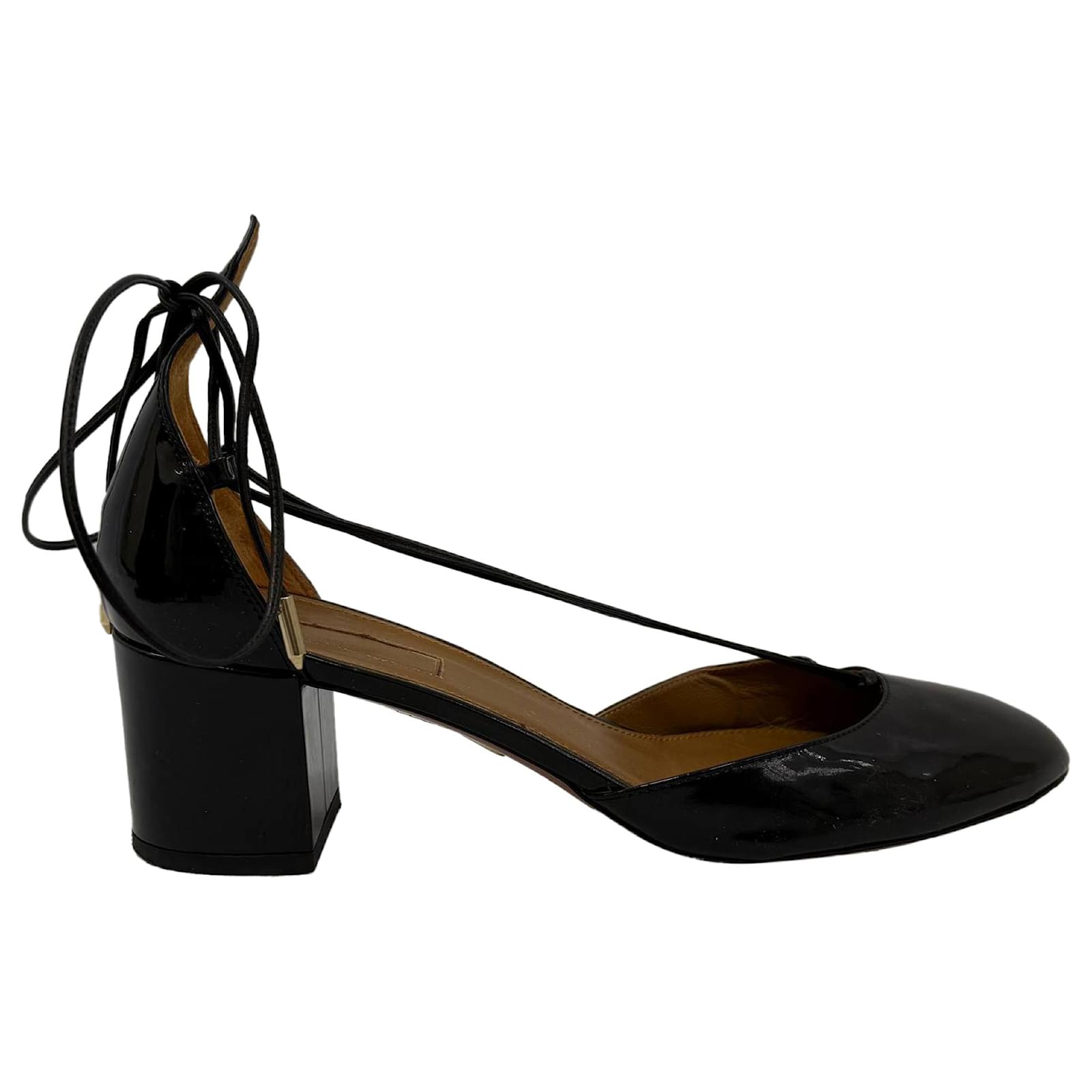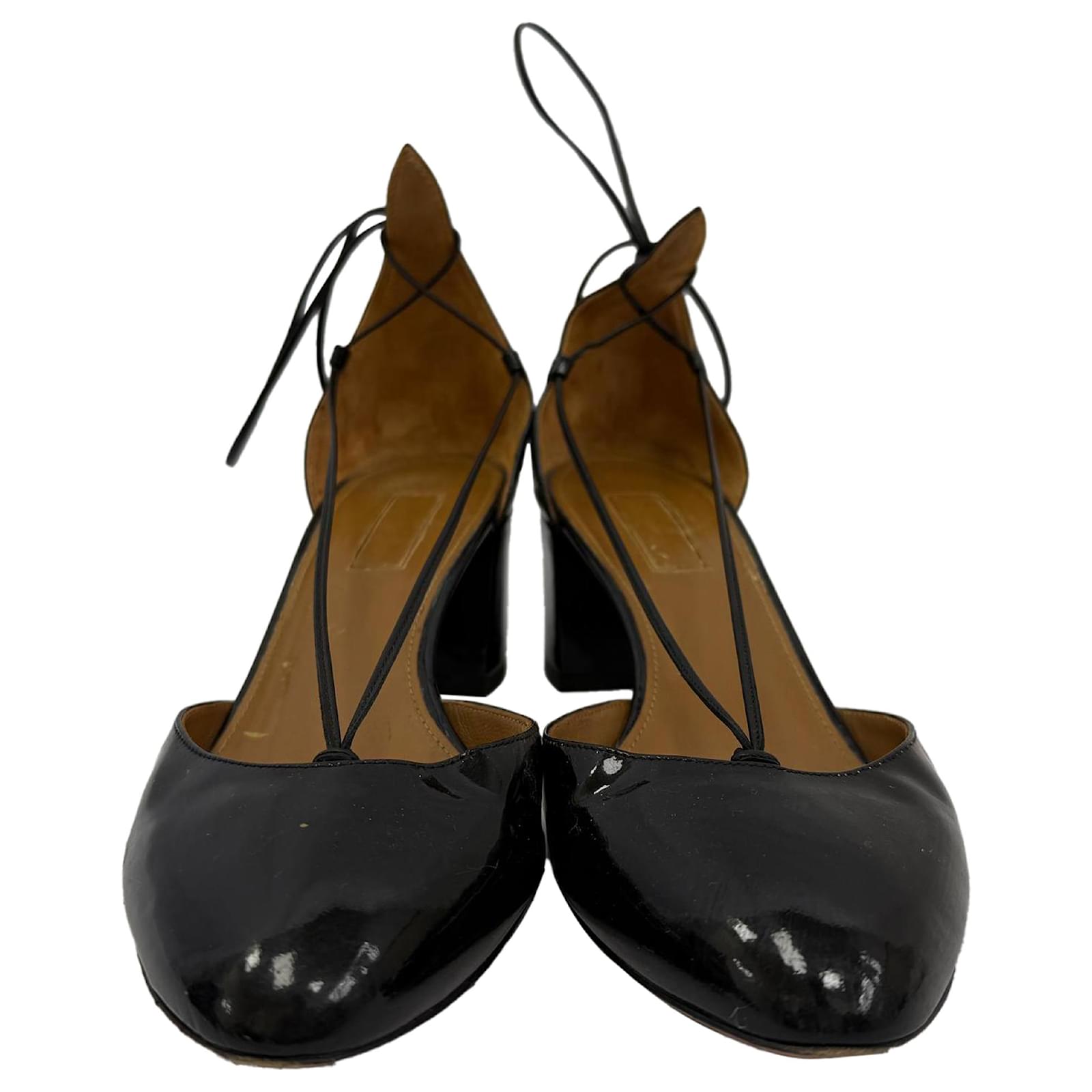 Refined and feminine, the Aquazzura Alexa Mid-Heel Pumps are a polished addition to any wardrobe. Crafted in glossy black patent leather with a graceful d'Orsay silhouette, these Italian-made heels feature a round toe, delicate ankle-tie loops, and a comfortable 2" block heel — perfect for day-to-night wear. With elegant lines and luxurious materials, they strike the perfect balance between classic and contemporary.