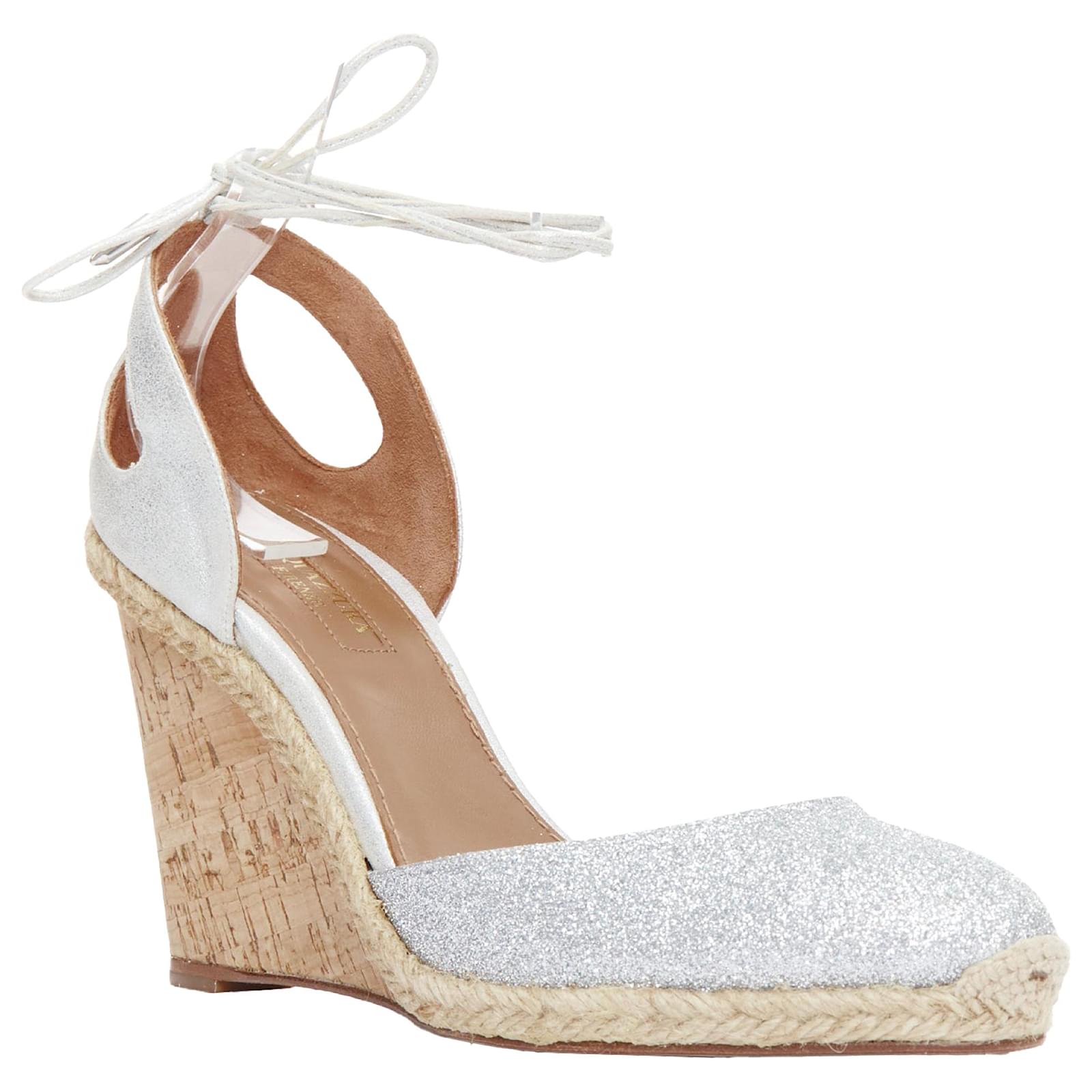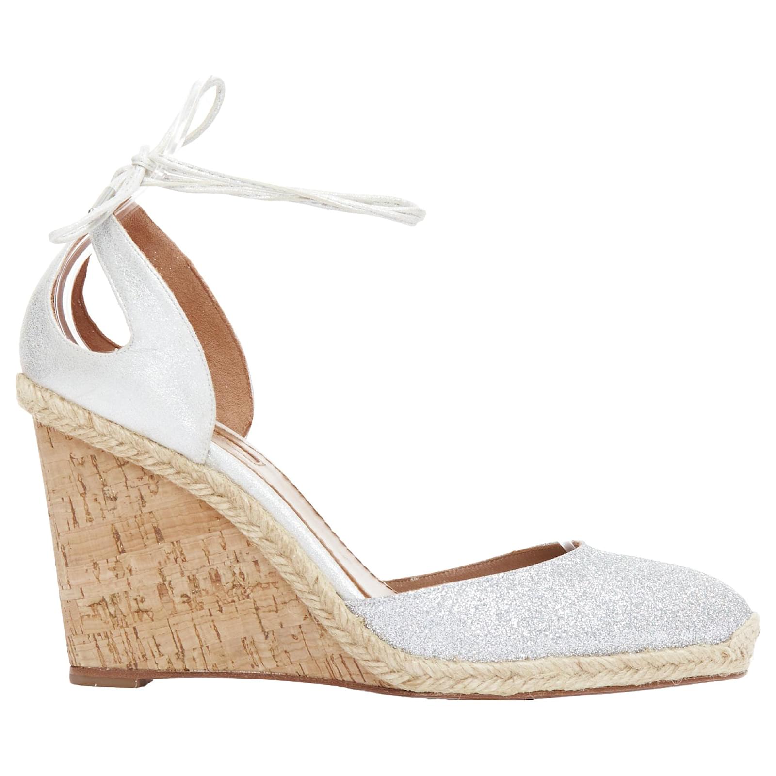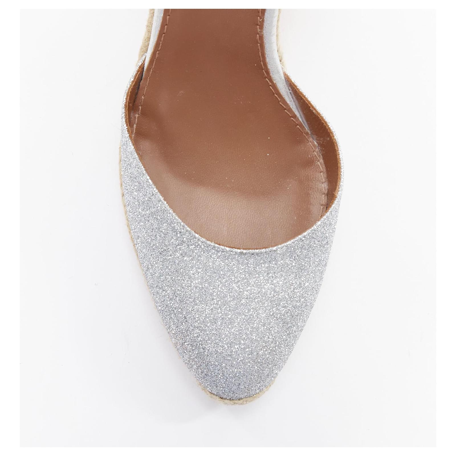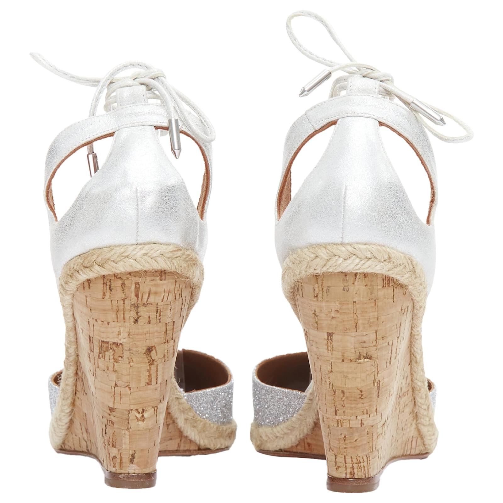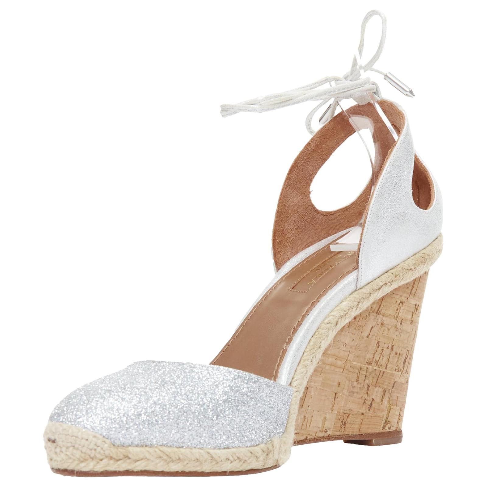 AQUAZZURA Palm Beach metallic glitter cork wedge sandals EU39Reference: JHDN/A00030Brand: AquazzuraModel: Palm BeachMaterial: Leather, CorkColor: Silver, NudePattern: SolidClosure: Ankle TieLining: Brown LeatherExtra Details: Metallic silver glitter and leather Aquazzura Palm Beach wedges with semi pointed toes, cutouts accents at counters, woven jute trim at outsoles, cork wedge heels and tie closures at ankles.Made in: ItalyCONDITION:Condition: Very good, this item was pre-owned and is in very good condition. Please refer to image gallery for thorough condition check. Brown dirt at toes front at right shoe. Slightly dented back straps.SIZINGDesigner size: EU39Size reference: EU39 / US9 / UK6 / JP26.5Measurments: