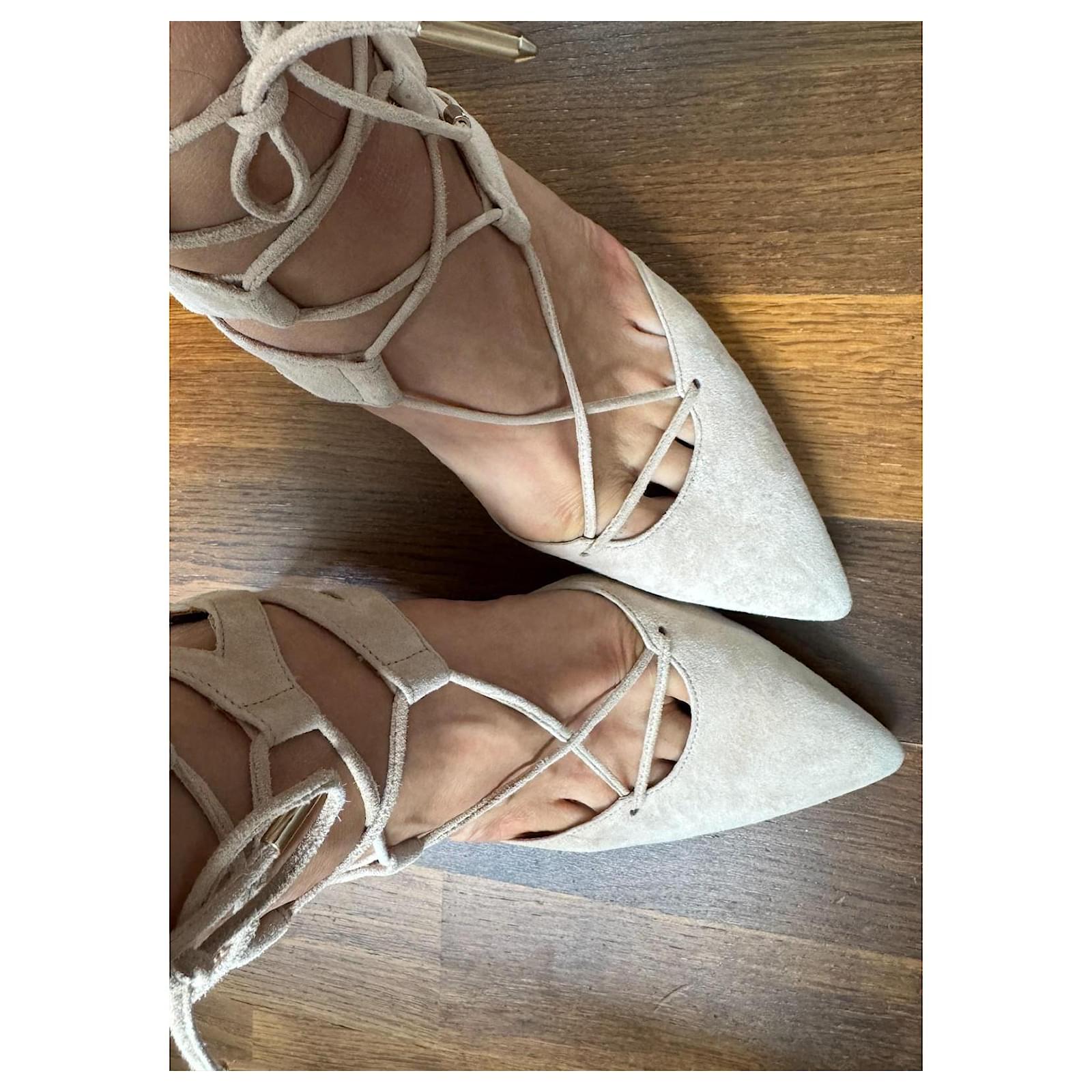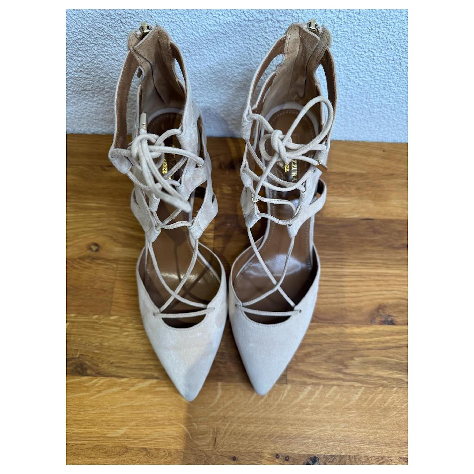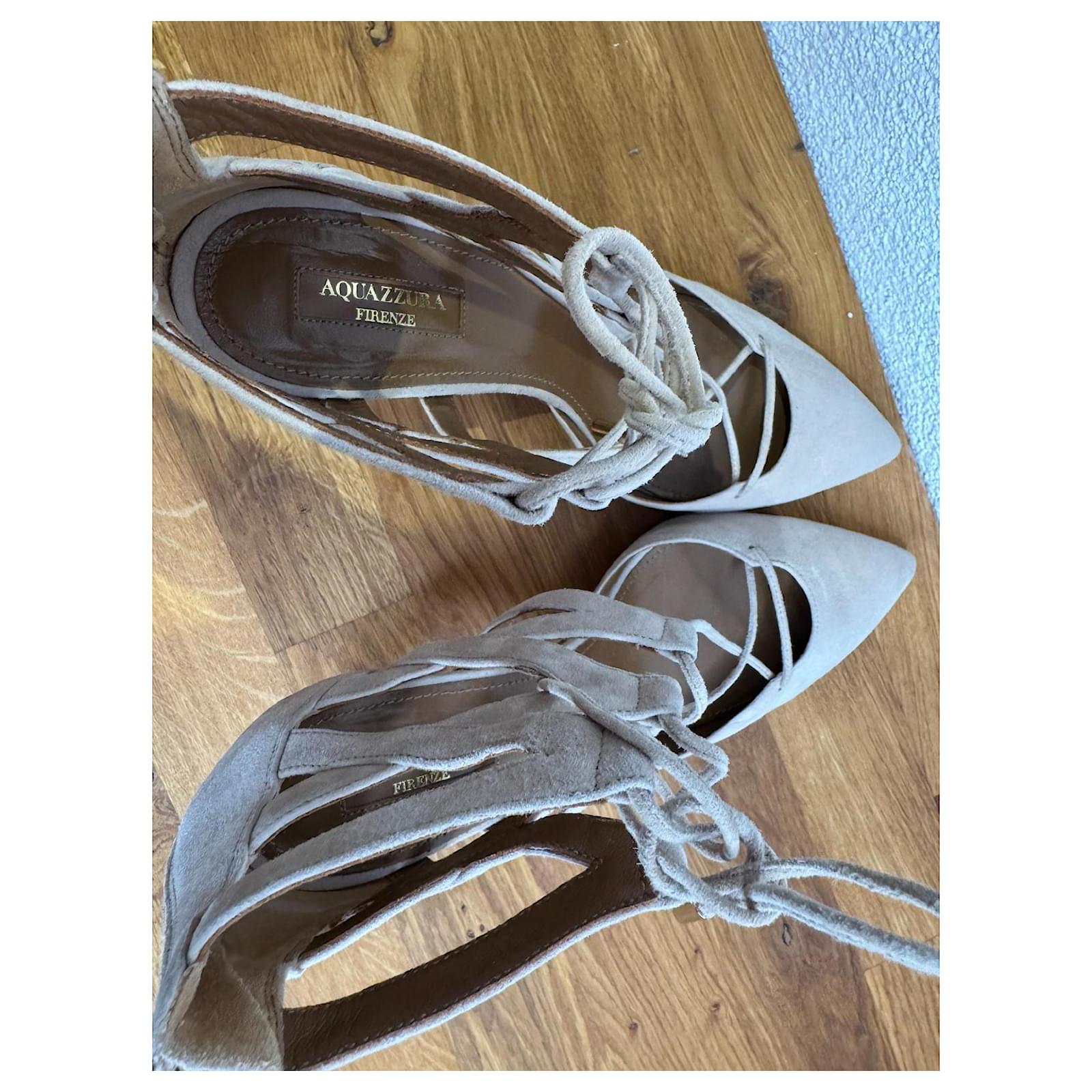 For sale are strappy high heel pumps from the brand Aquazzura in beige. The shoes have been worn but are still in good condition with slight signs of wear.