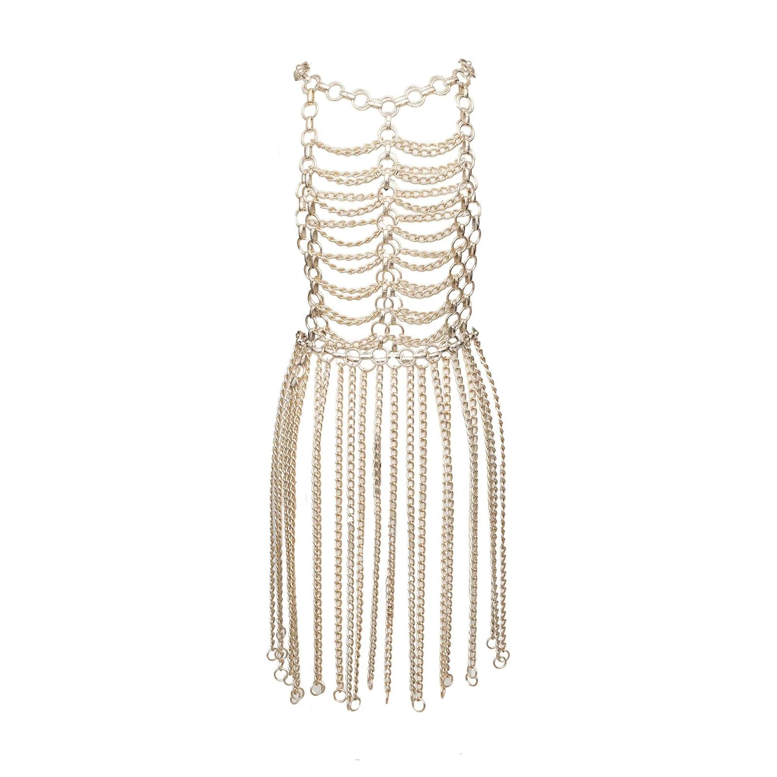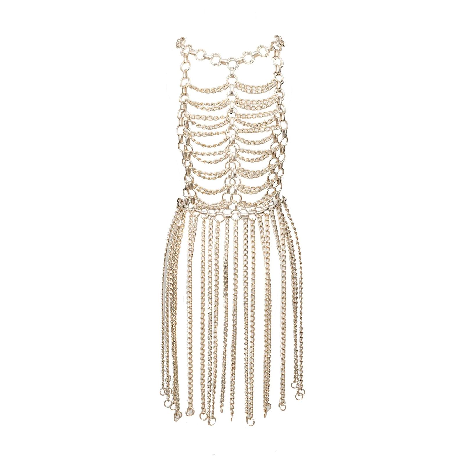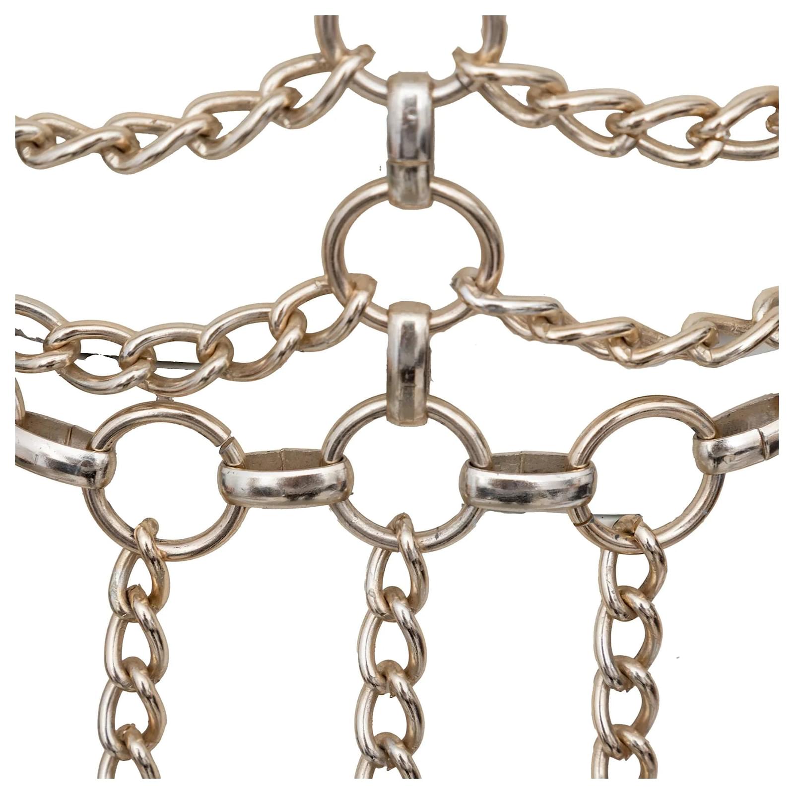 Rare 1960s metal shield dress made of interlinked chain, horizontal over the top and cascading vertically from the waist. A striking collectible piece of body art.Shoulder:26Width:22Waist:32Length:98Metal