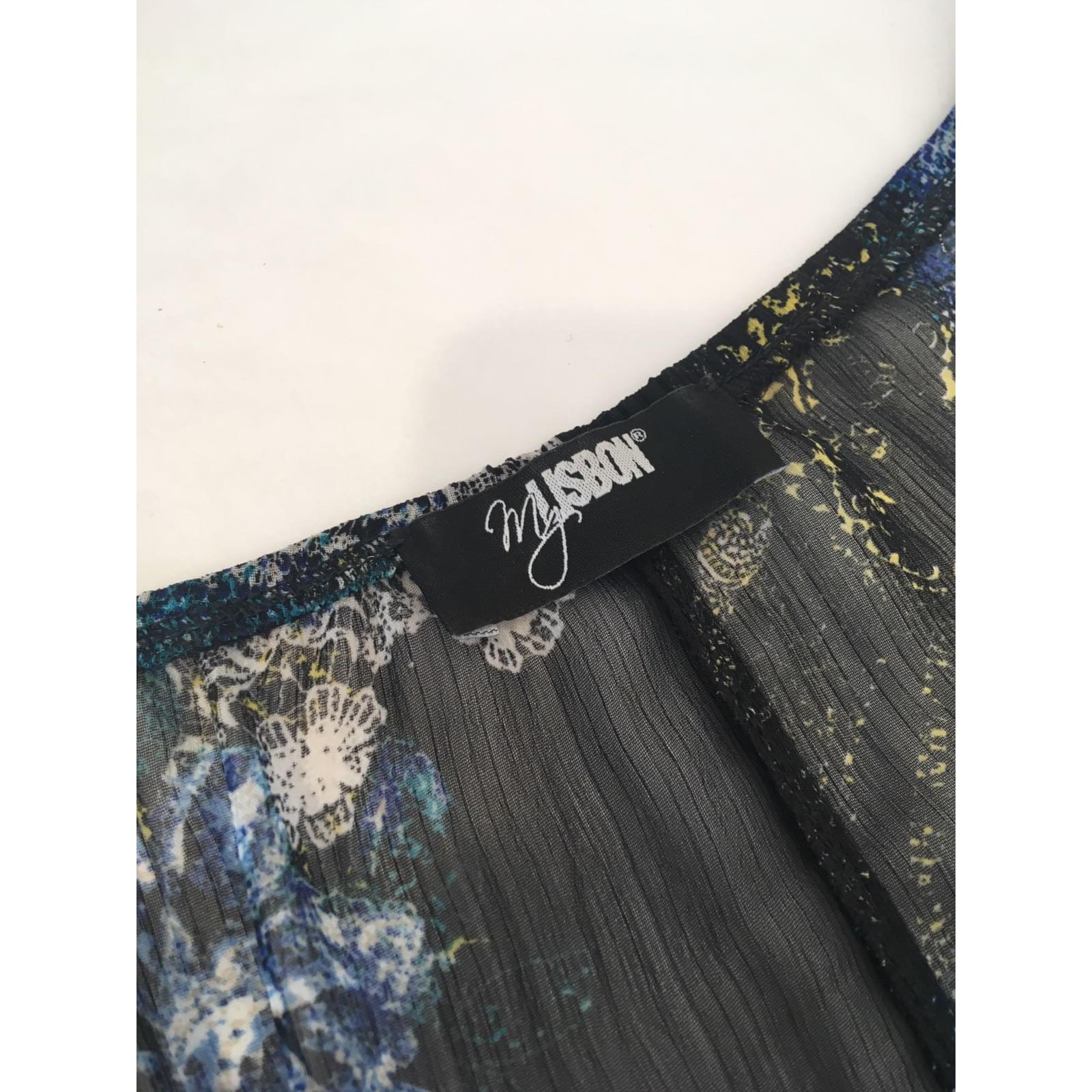 Lightweight patterned polyester long dress. Tightens at the waist with pliers. A few stains. Open slots on the sides at the bottom. Label size missing, fits a 42/44 FR.