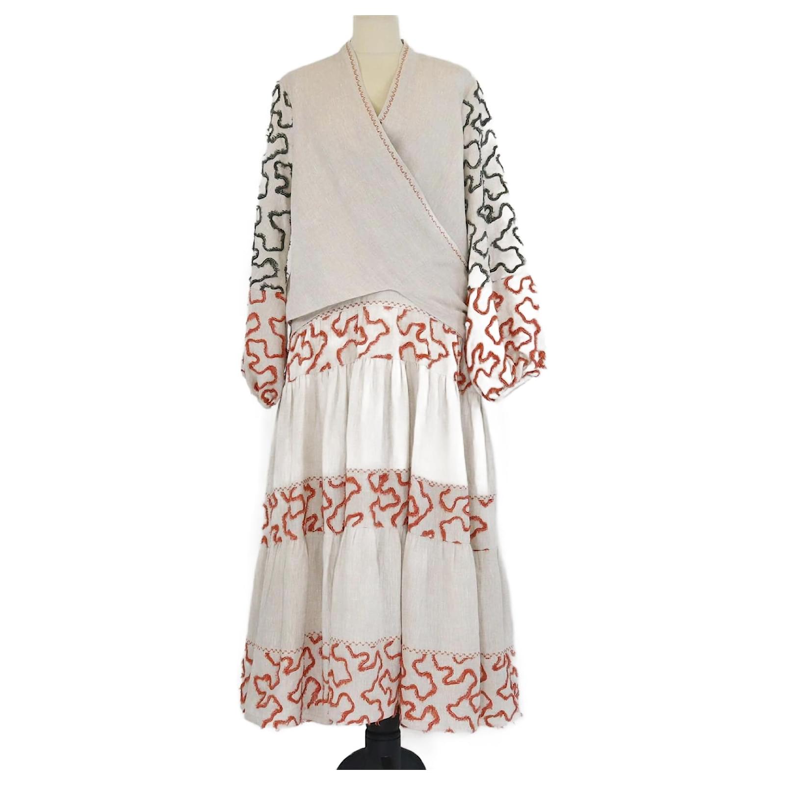 Autre Marque Silvia Tcherassi Beige Coral Olive Embroidery Honey Blouse & Skirt Set Olive green