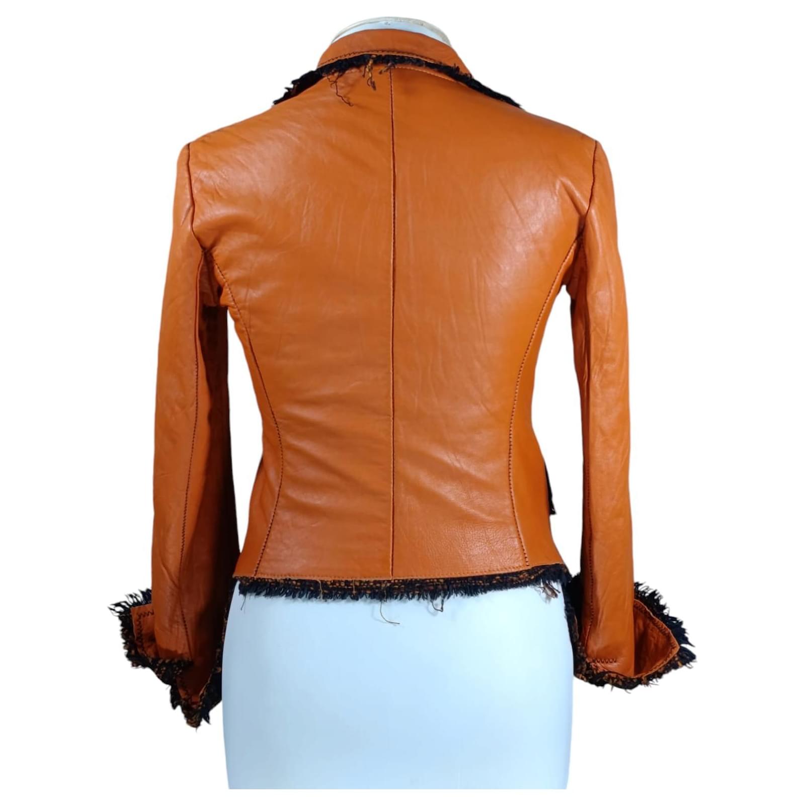 Unsigned leather jacketOrange colorInternational size SVery good conditionMade in ITALYSingle button closureLong sleevesTwo flap pockets