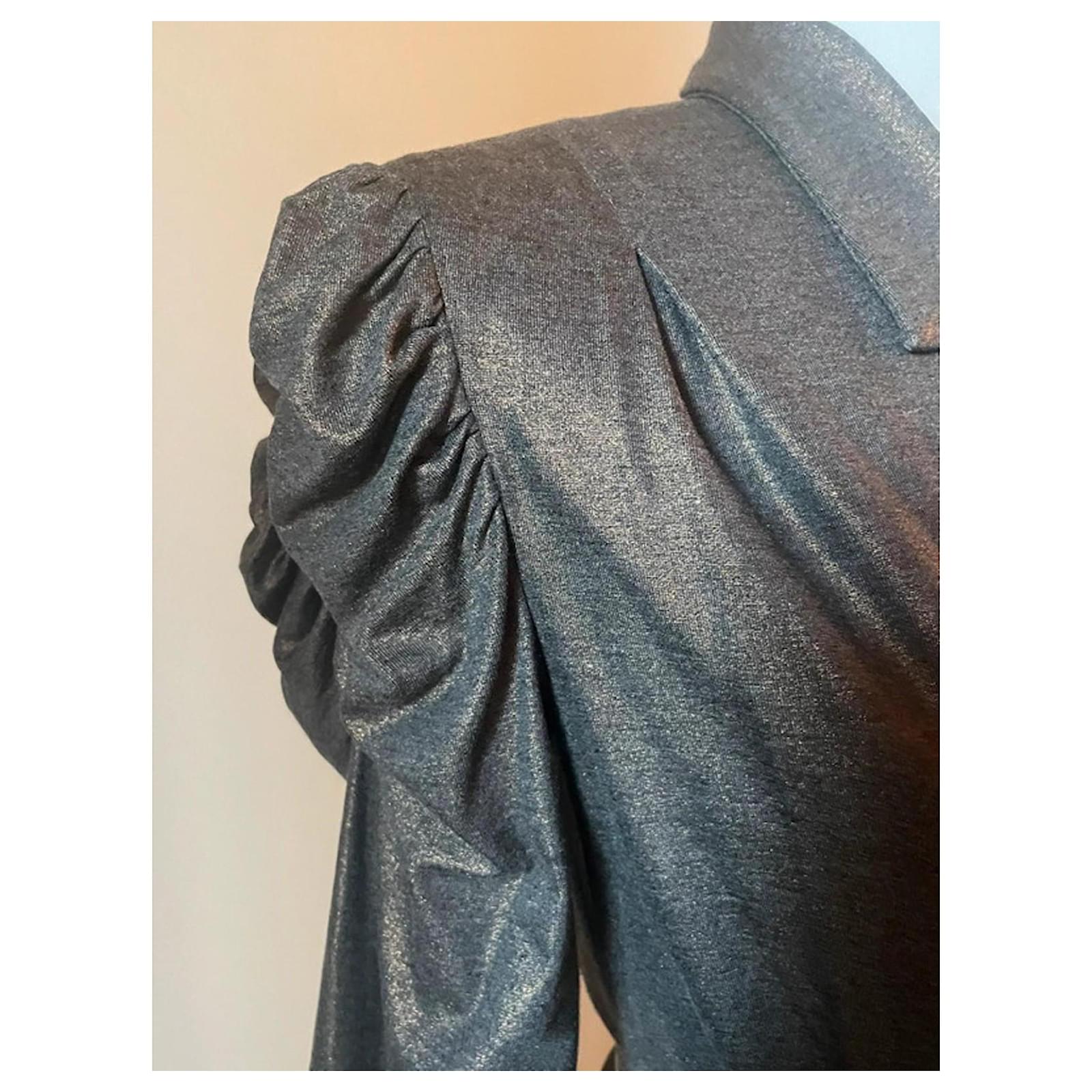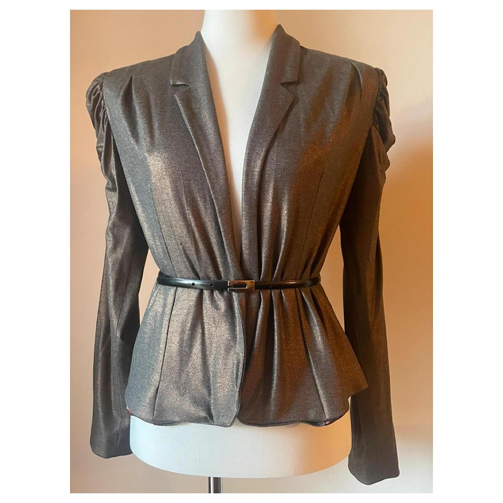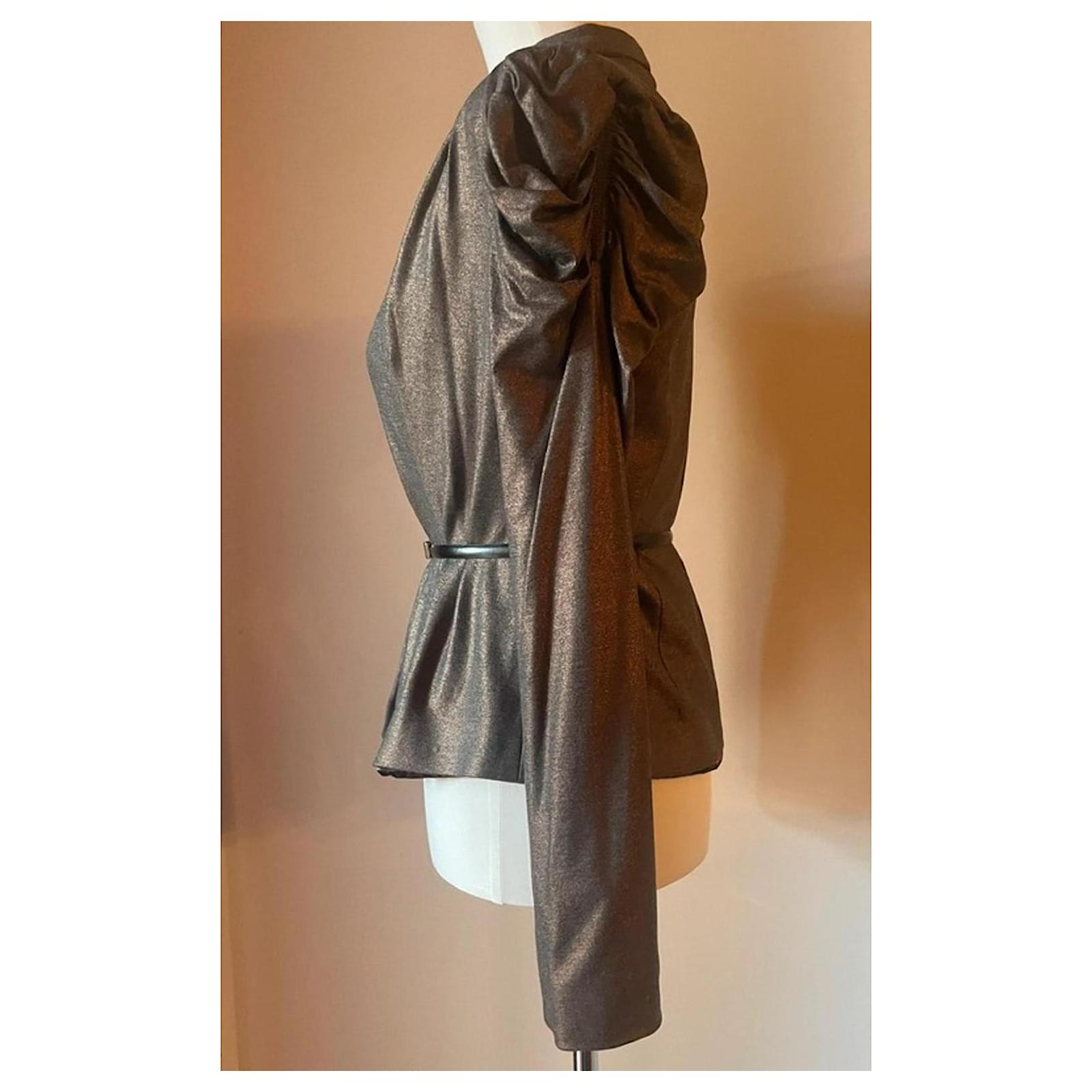 Stunning bronze fabric blazer from the brand ALICE SAN DIEGO, with a lapel collar and a fitted silhouette, featuring a unique gathering at the top of the sleeve that makes it truly eye-catching and very glamorous; it has no buttons and is fastened with a belt (as shown in the photos; the belt is not included). Brand new, never worn, retail price 270 euros. The interior is also very beautiful with a patterned lining. Size S, but since the fabric is very versatile, it also fits an M, practically a 40-42 Italian (36-38 French), length 53 cm, shoulder width 40 cm.