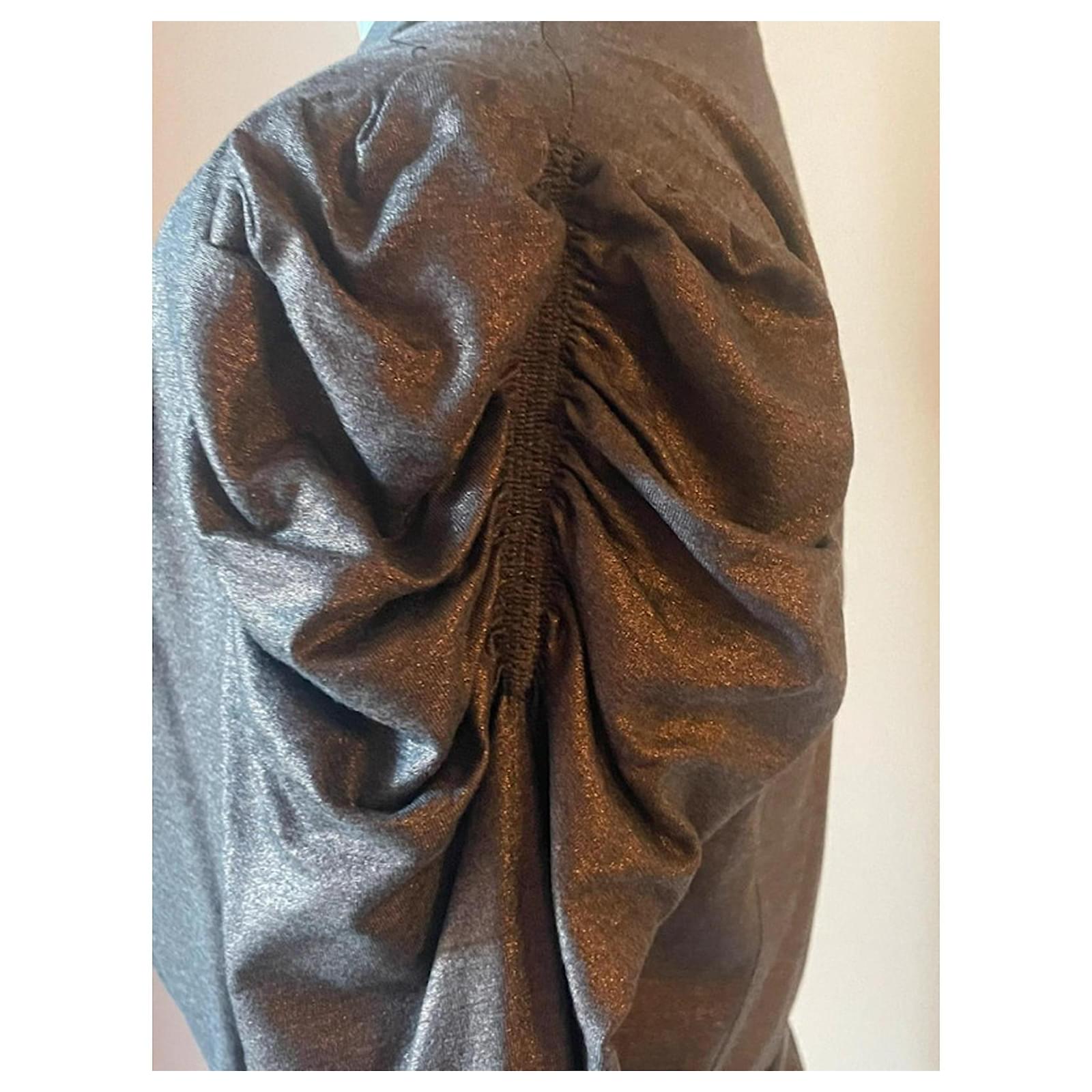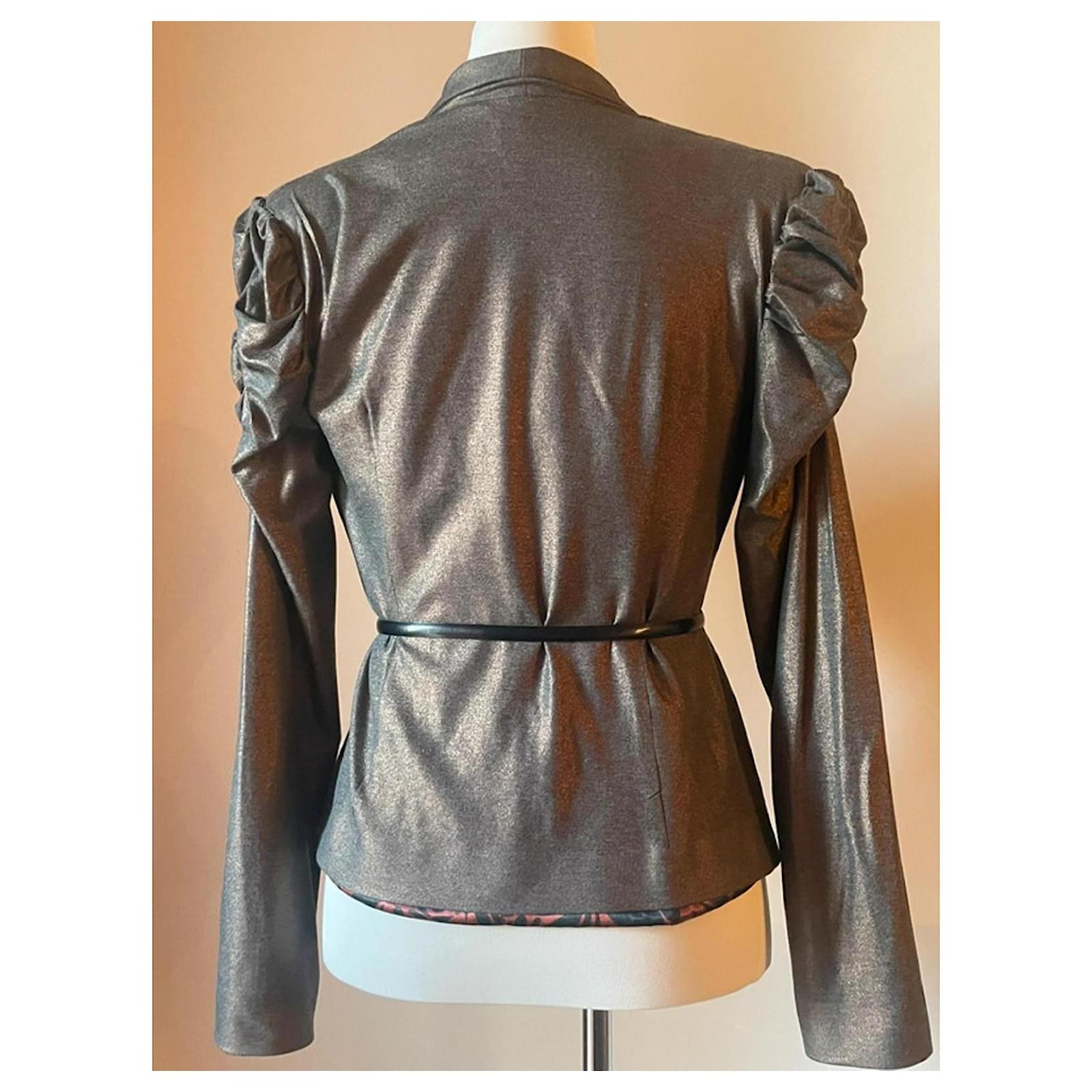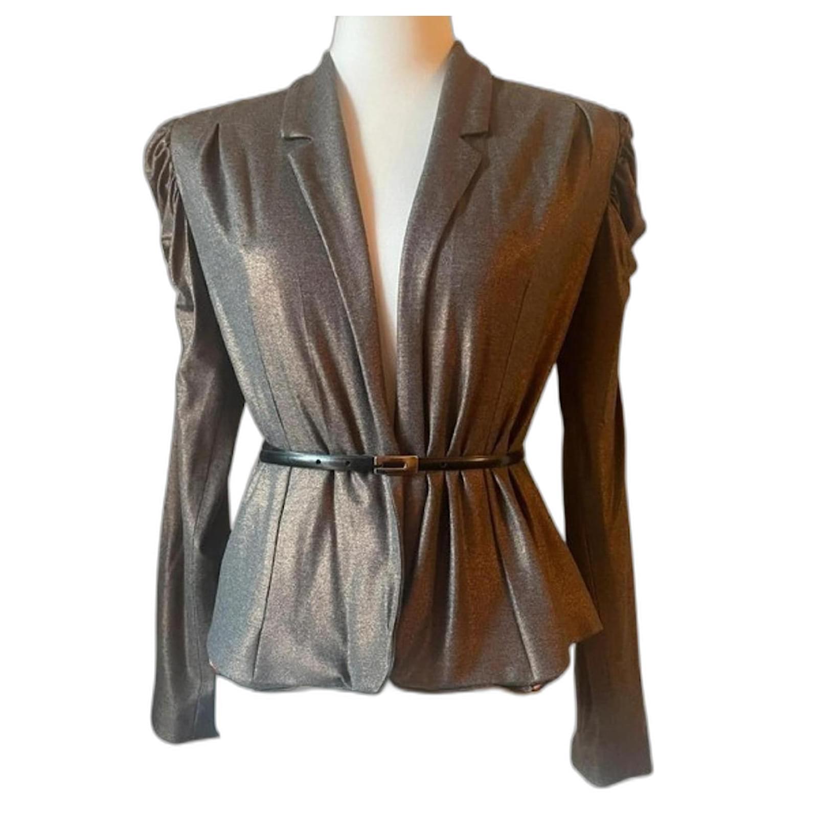 Stunning bronze fabric blazer from the brand ALICE SAN DIEGO, with a lapel collar and a fitted silhouette, featuring a unique gathering at the top of the sleeve that makes it truly eye-catching and very glamorous; it has no buttons and is fastened with a belt (as shown in the photos; the belt is not included). Brand new, never worn, retail price 270 euros. The interior is also very beautiful with a patterned lining. Size S, but since the fabric is very versatile, it also fits an M, practically a 40-42 Italian (36-38 French), length 53 cm, shoulder width 40 cm.