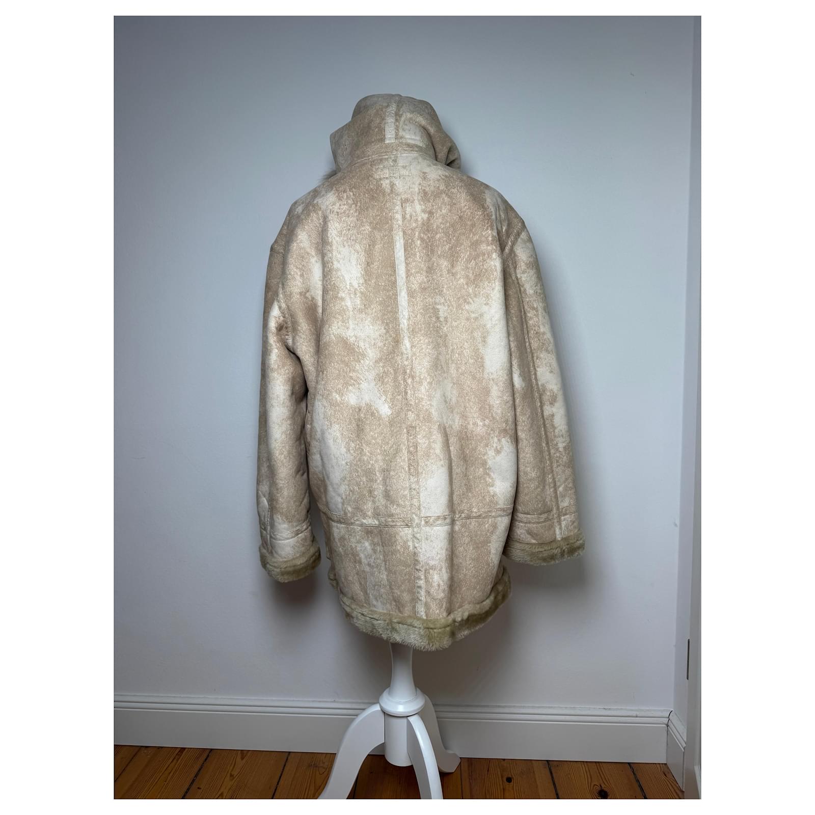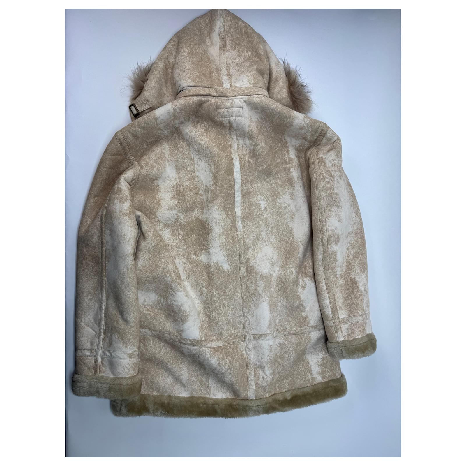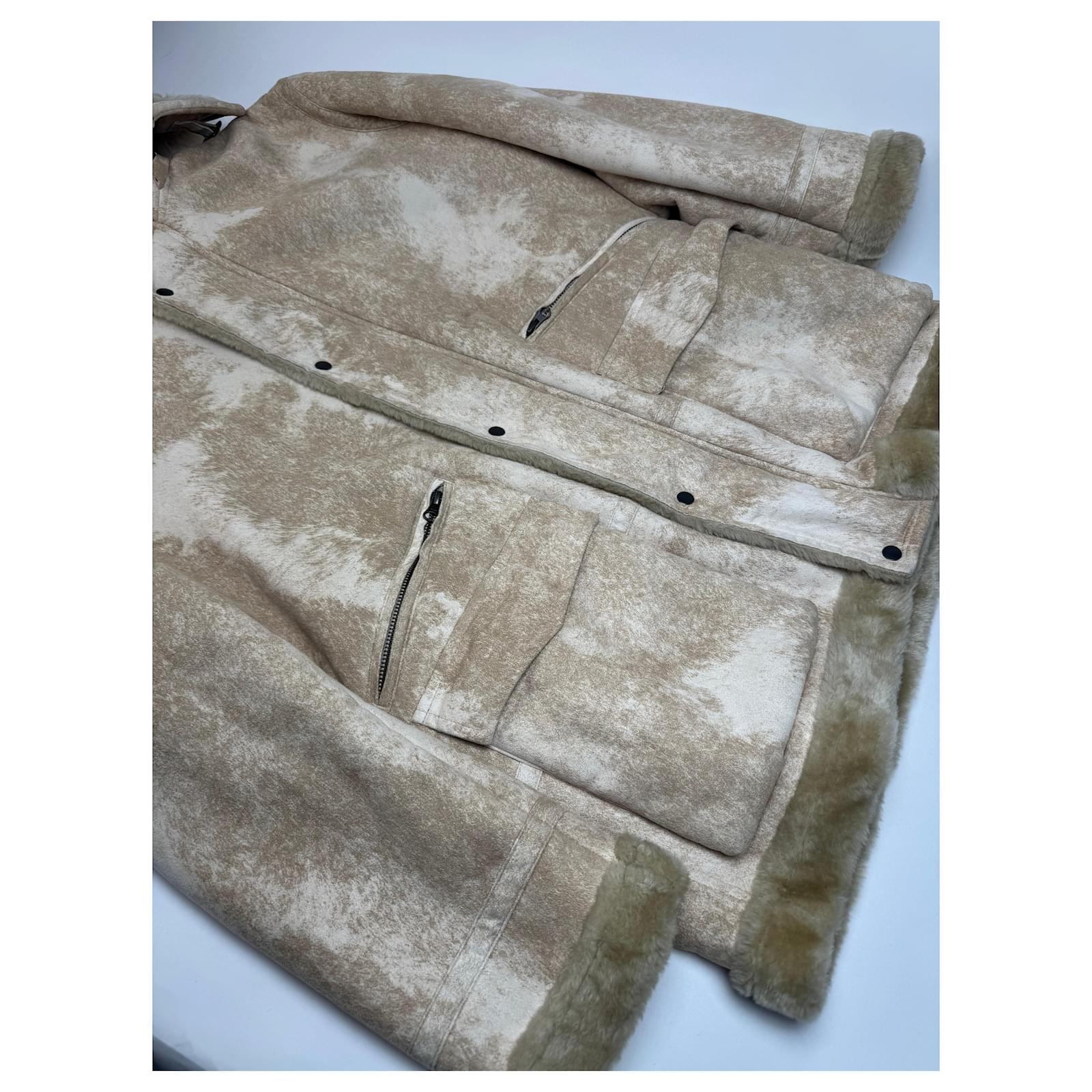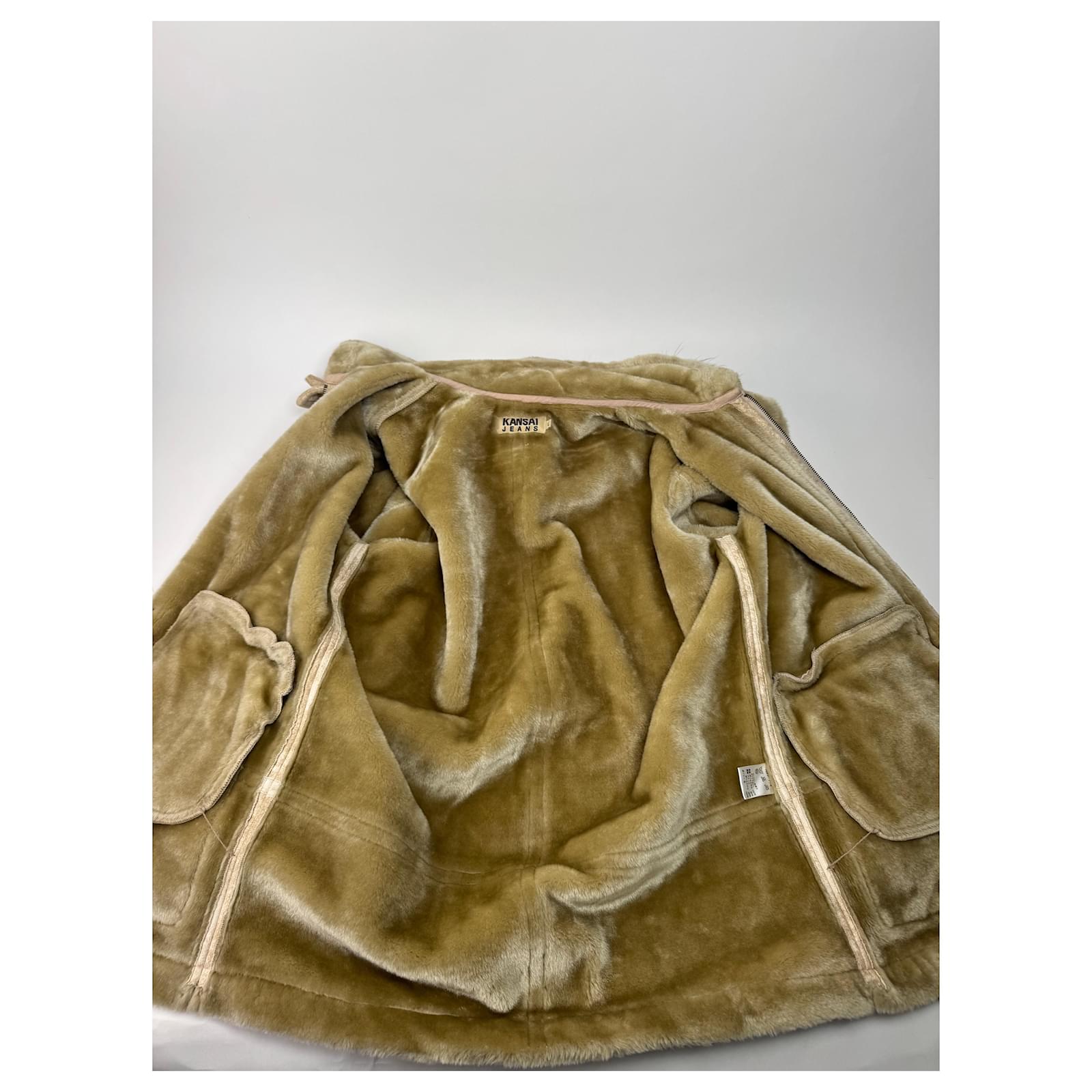 KANSAI YAMAMOTO Vintage Parka. This vintage parka by Kansai Yamamoto is crafted from sand-colored vegan leather with a luxurious faux fur lining offering both warmth and style. The bronze-tone steel hardware adds a sophisticated touch. The unisex fit corresponds to a Men's size M and Women's size L. Despite normal signs of use the parka remains in very good condition.