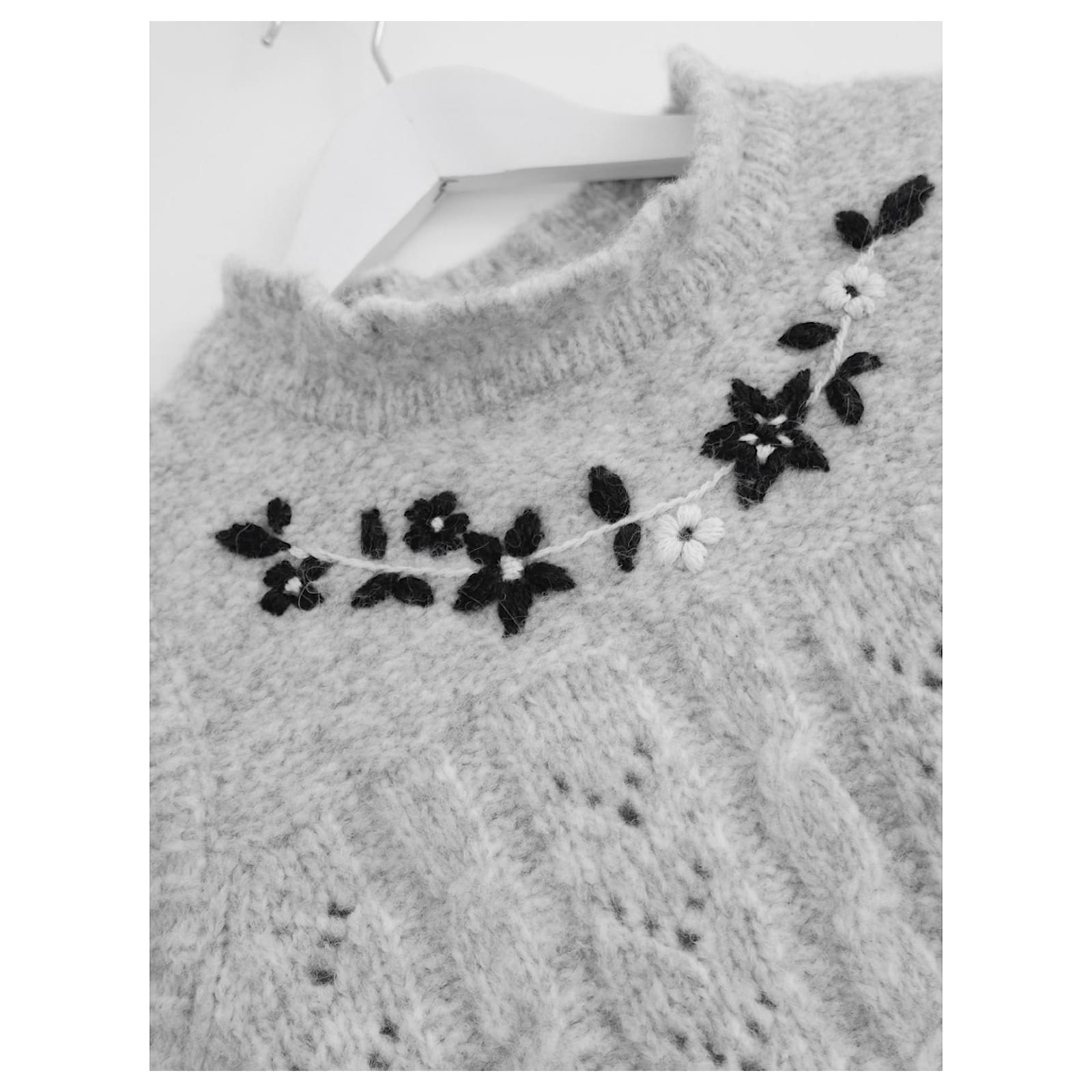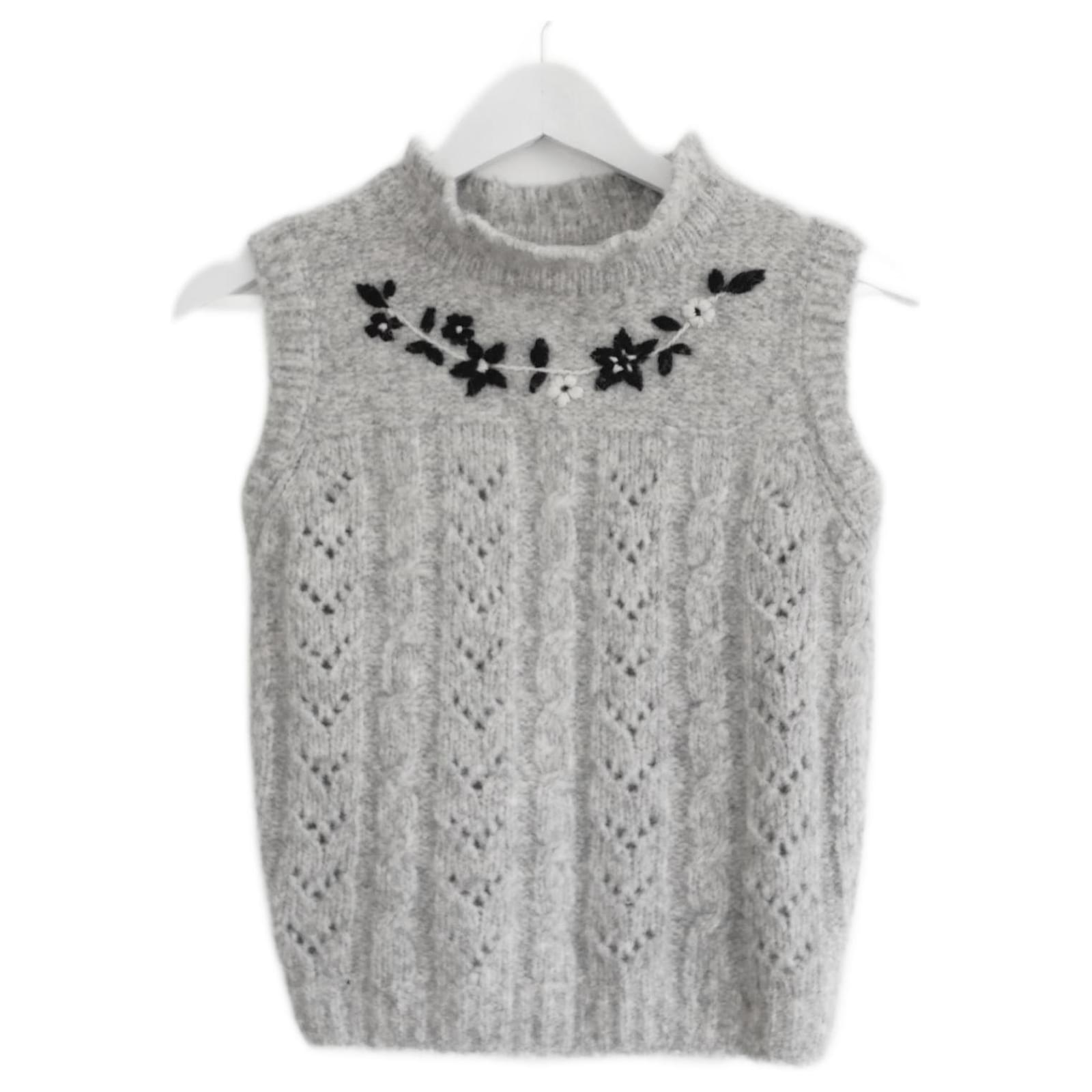 Adorable Batsheva floral embroidered alpaca tank top or sweater vest. Worn once. Knitted in Peru from soft grey cable knit grey alpaca with charming hand embroidered black flower embellishment. No comp/size label but will fit around a S/M. Measures approx - bust 34”, waist 32” and length 20”.