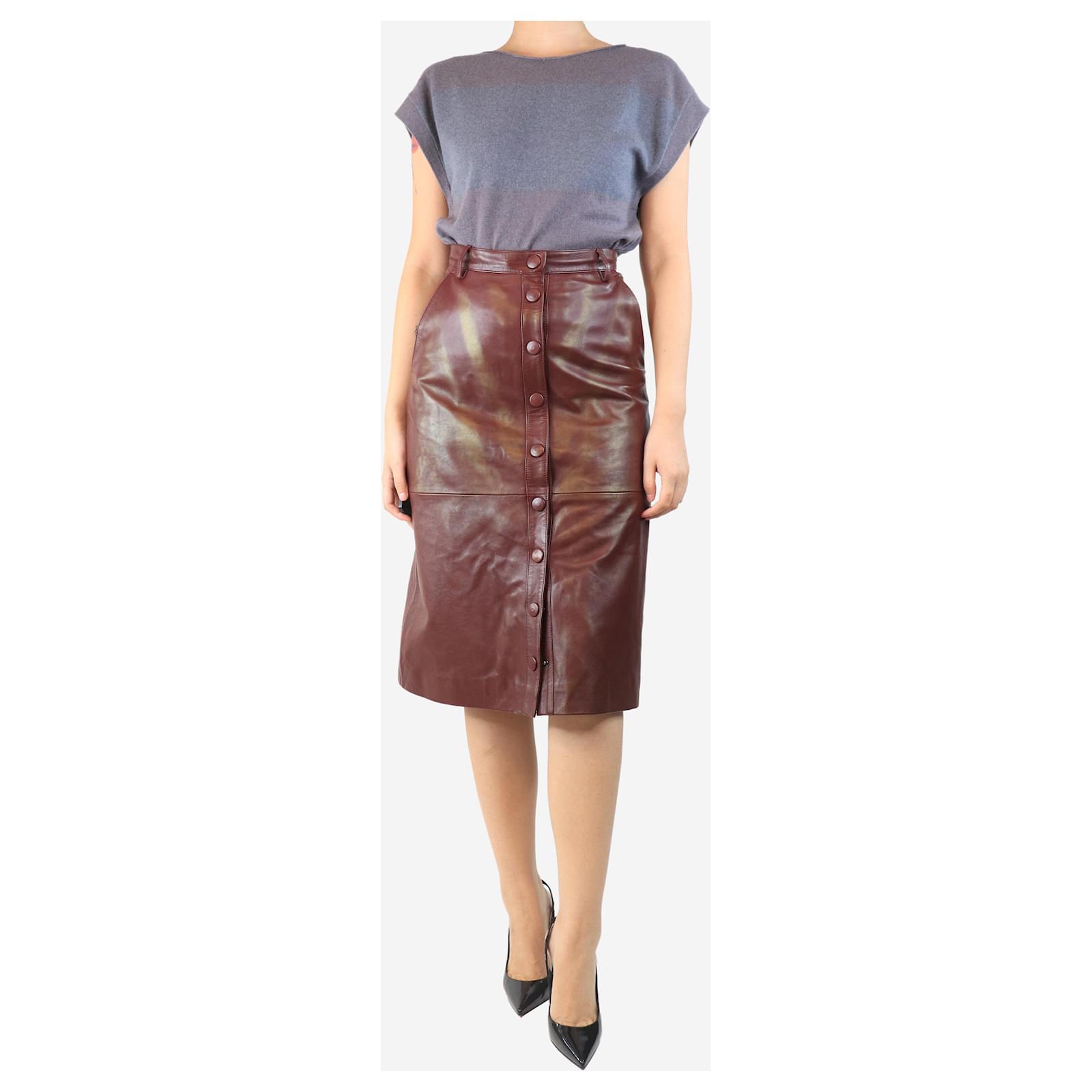 Autre Marque Burgundy leather button-front midi skirt - size UK 10 Dark red