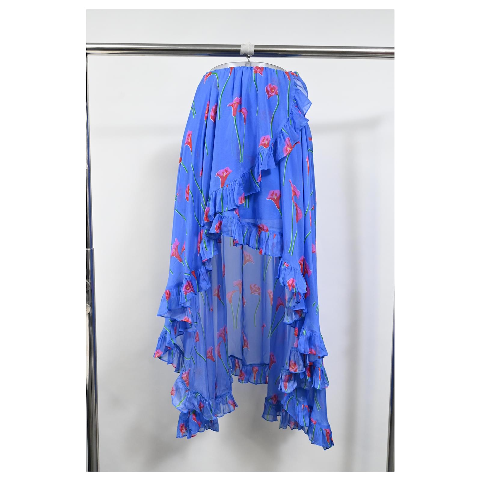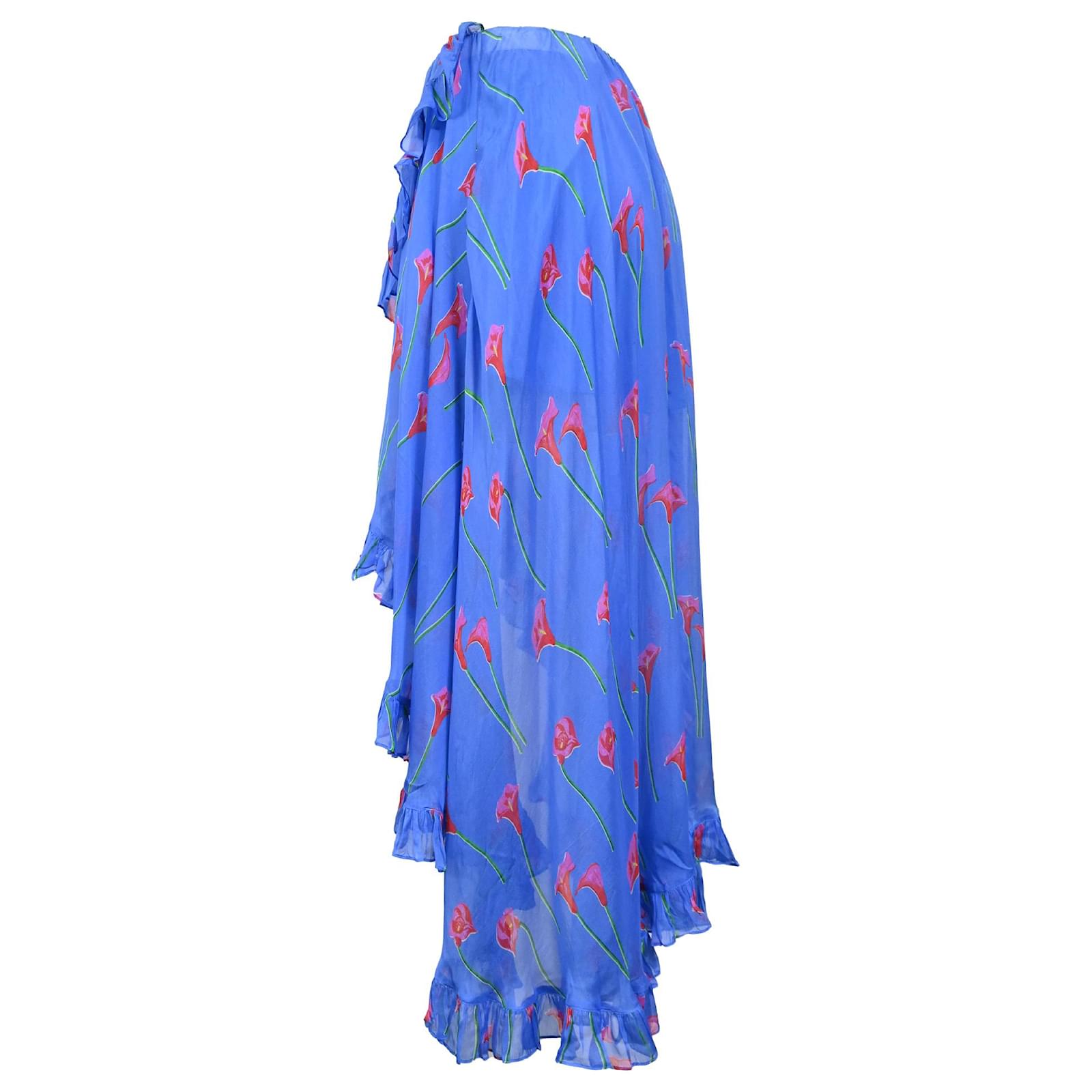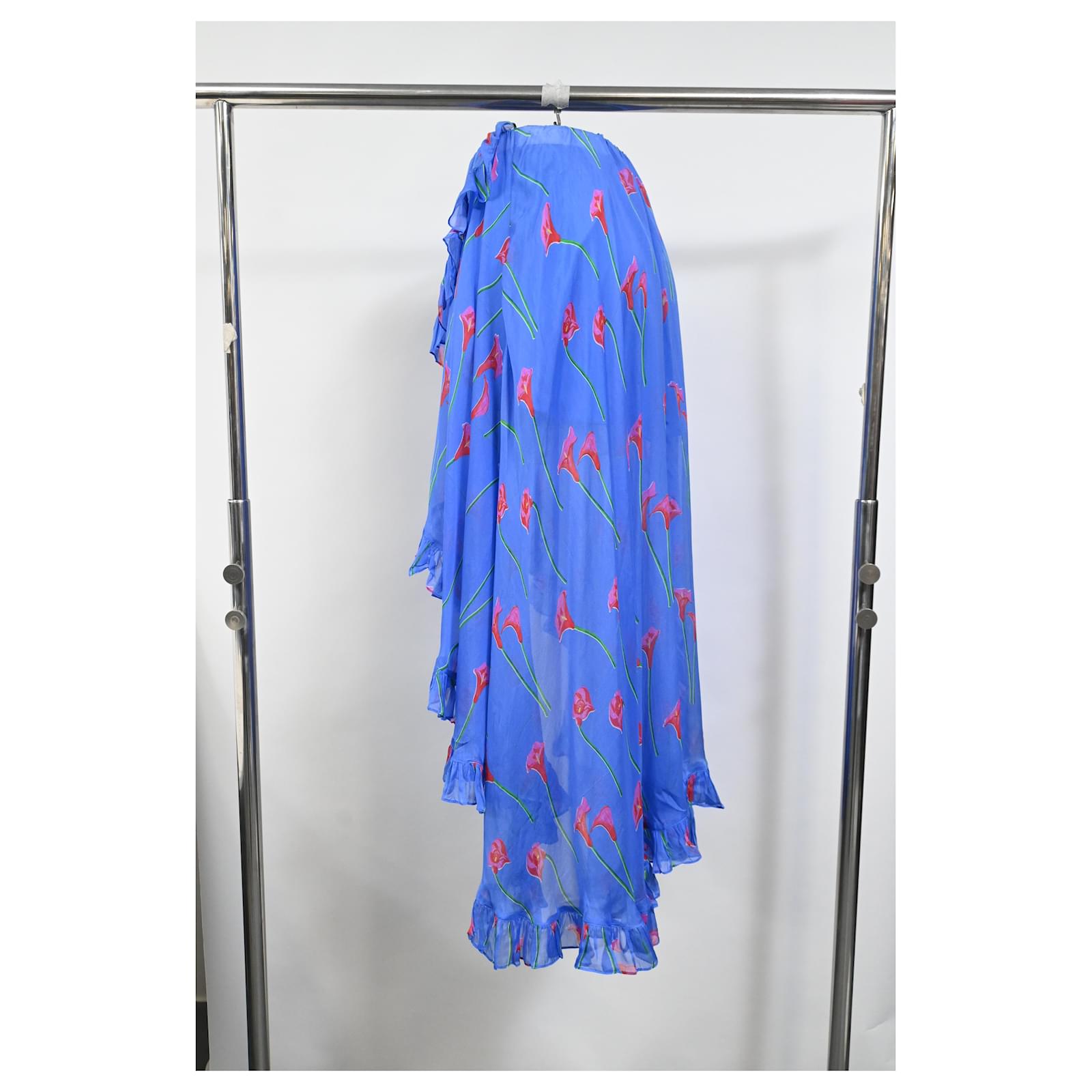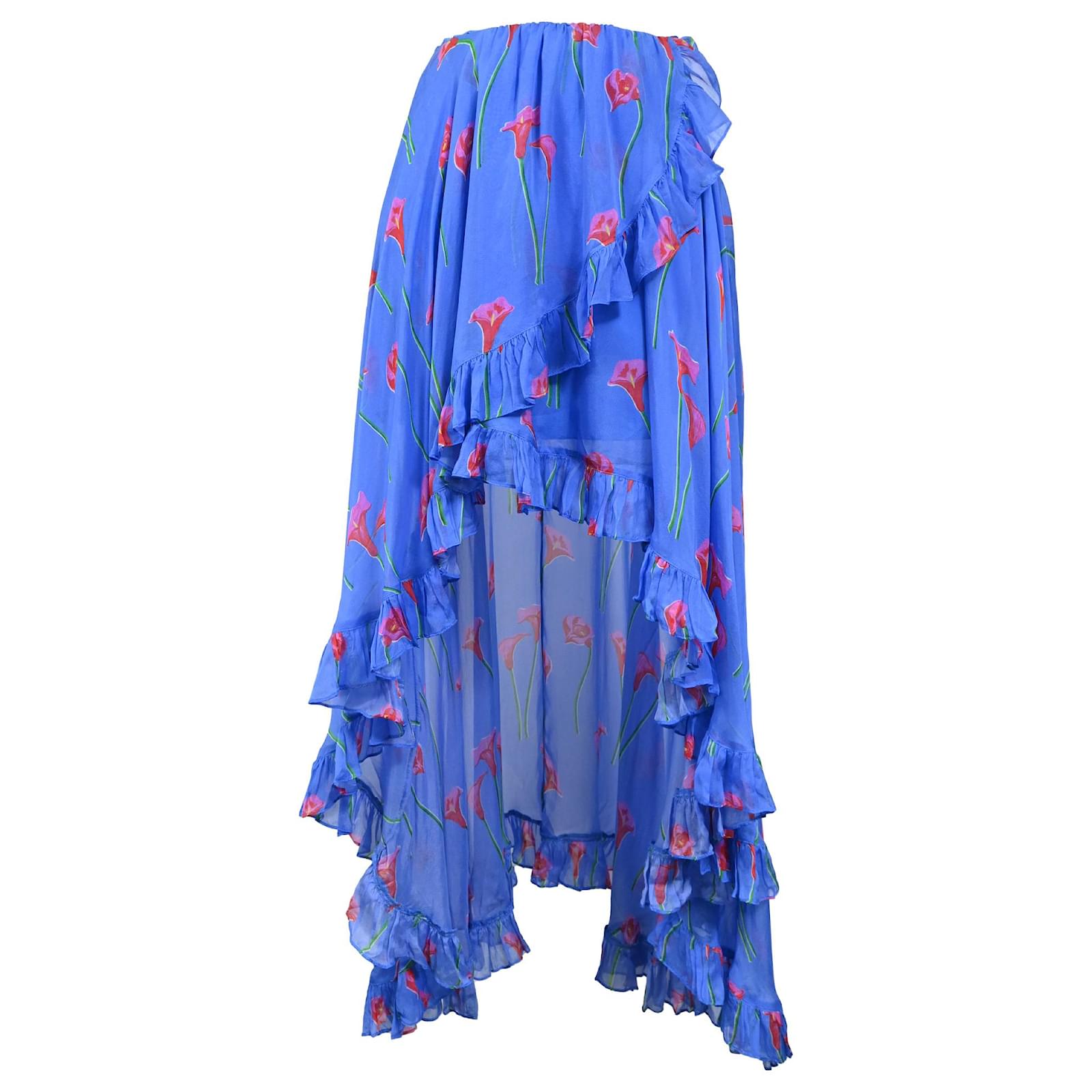 Autre Marque Caroline Constas Printed Ruffled Asymmetric Hem Adelle Midi Skirt in Blue Silk