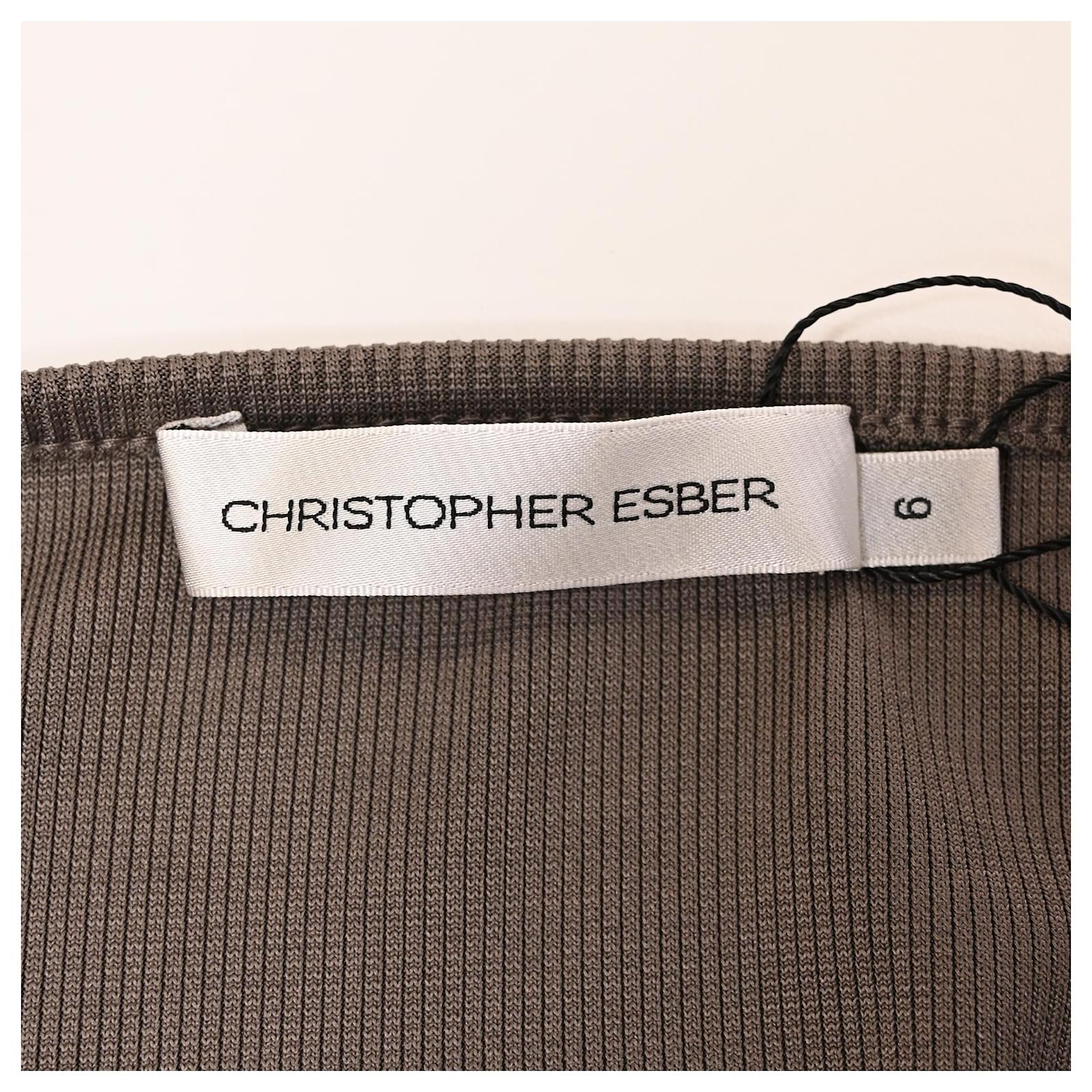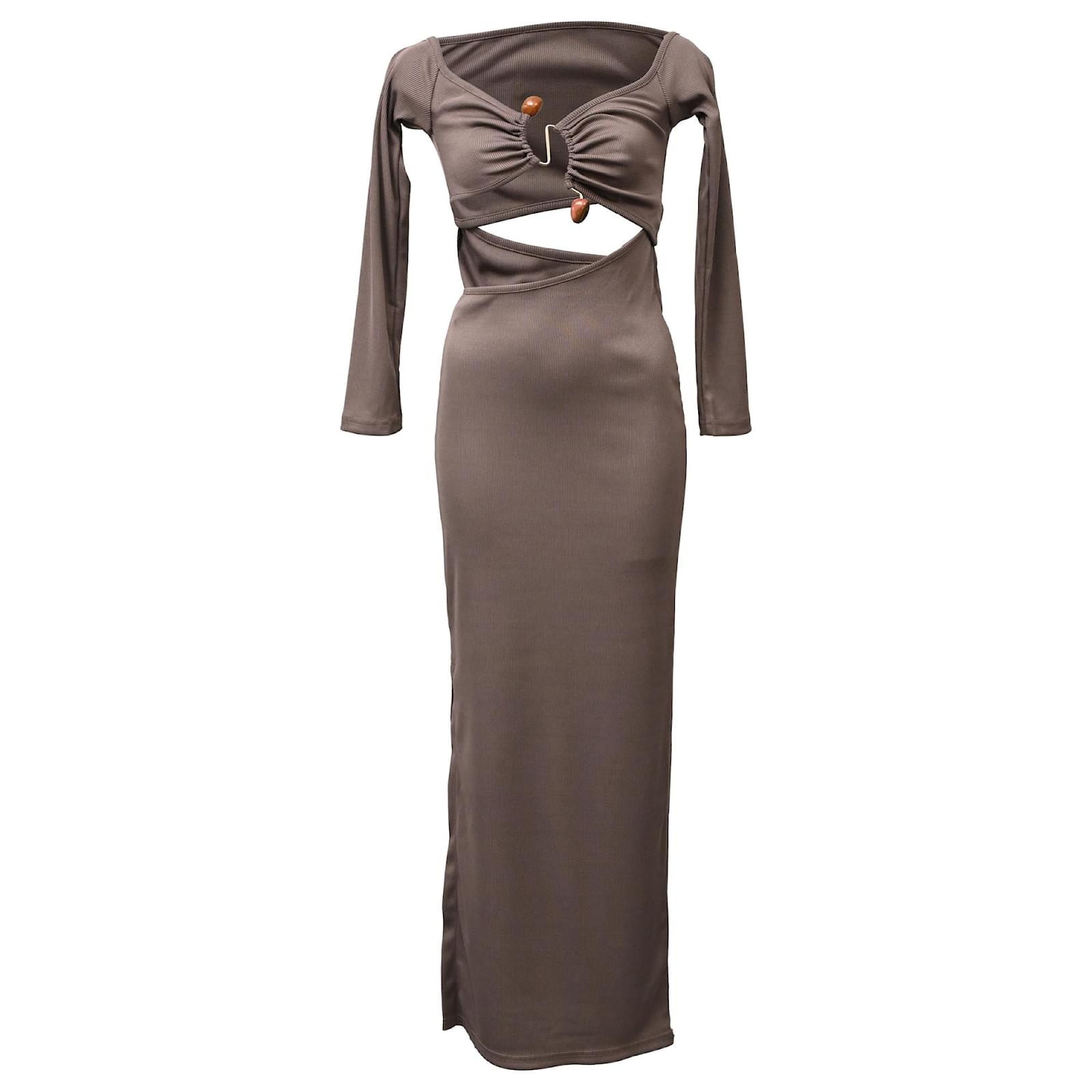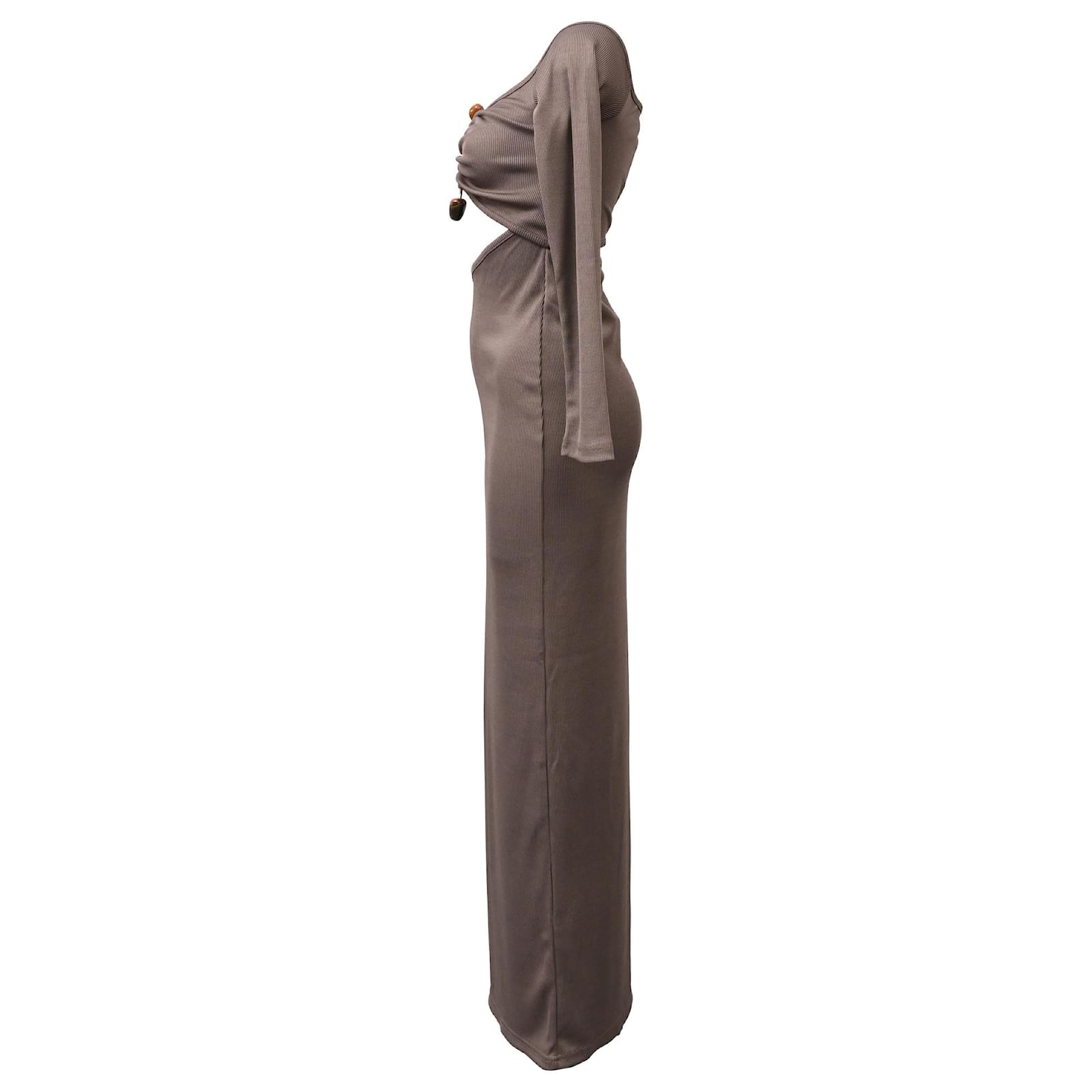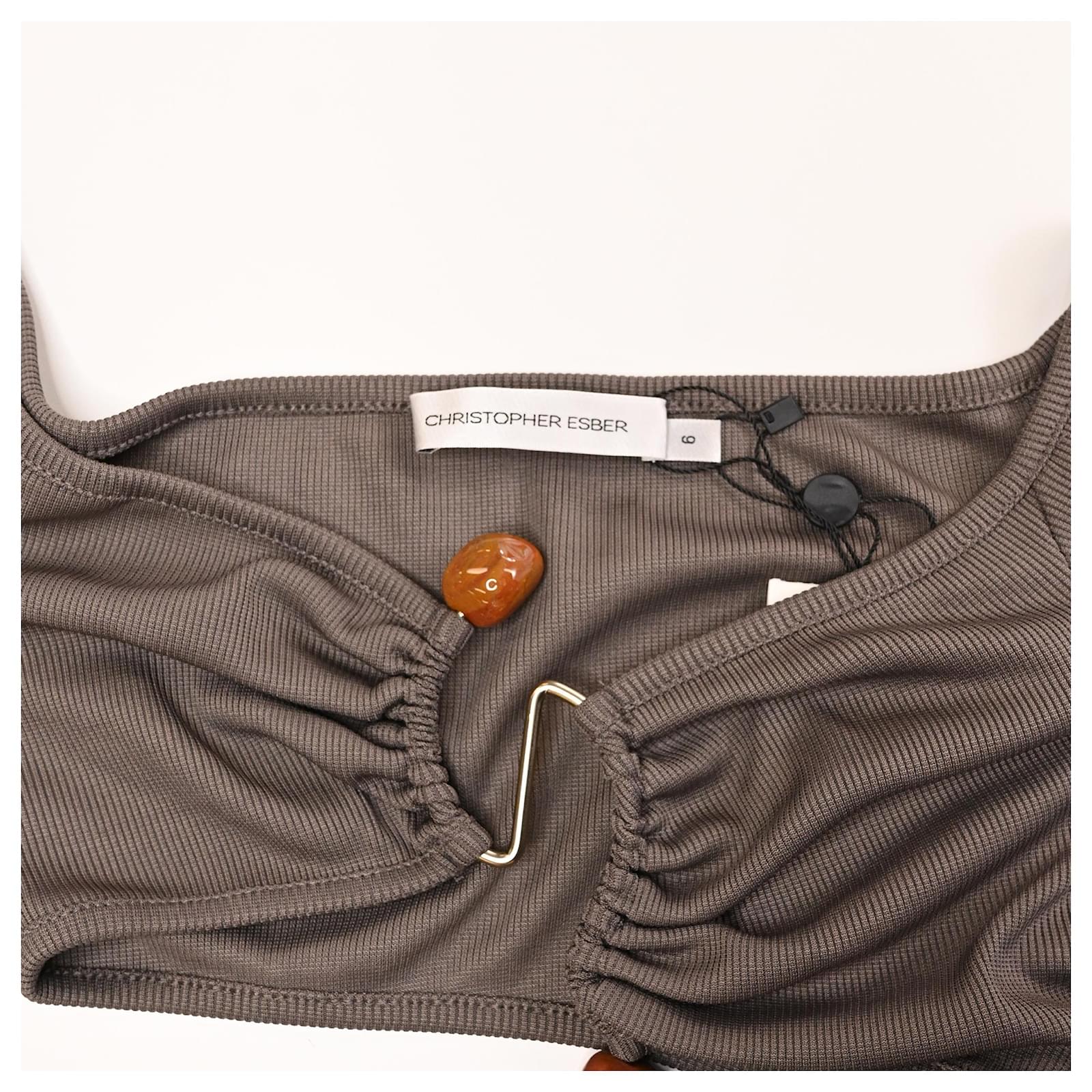 The Christopher Esber Distort Quartz Off-Shoulder Maxi Dress in brown polyester is a statement of refined sensuality, featuring an off-shoulder neckline and a striking quartz embellishment that anchors the draped silhouette. Its fluid fabric and earthy tone create a harmonious blend of natural elegance and modern design. **Style tip:** Elevate the look with nude heels and minimal jewelry to keep the quartz detail in sharp focus.