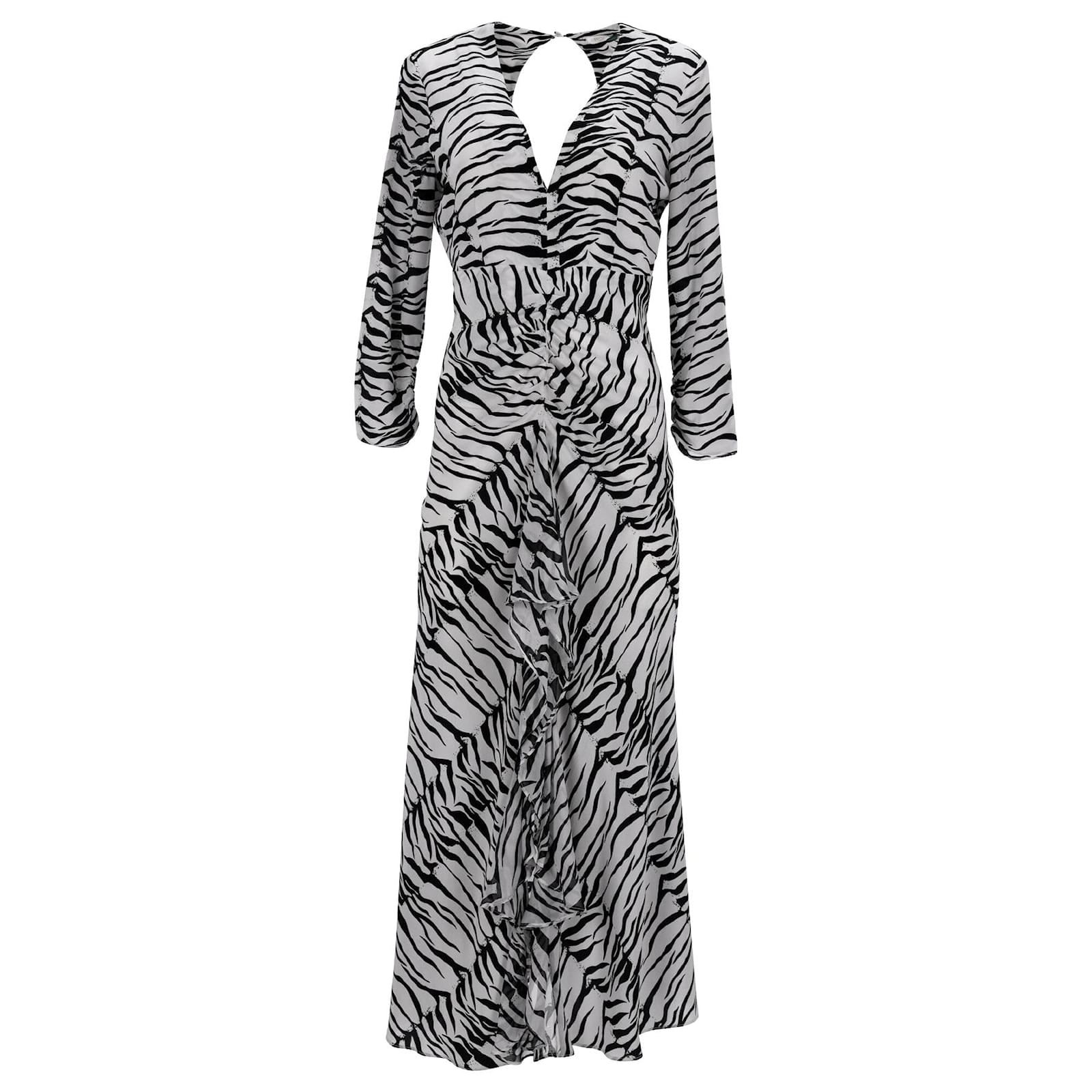 Step into the wild side of fashion with the Rixo Rose Open Back Ruffled Maxi Dress in Animal Print Silk. Embrace your inner vintage vixen as you grace any event in this lightweight silk masterpiece adorned with mesmerizing zebra stripes. The ruching across the stomach ensures a flattering fit, while the front split is elegantly accentuated with a delicate waterfall ruffle. Don't forget to complete the look with a self-adhesive bra to perfectly showcase the alluring open back.