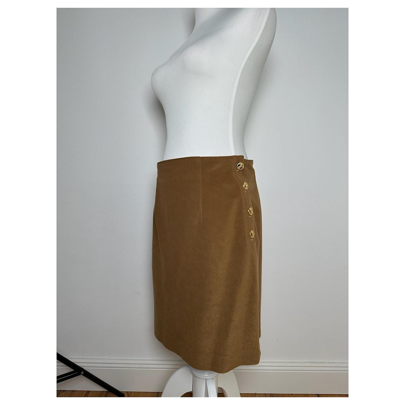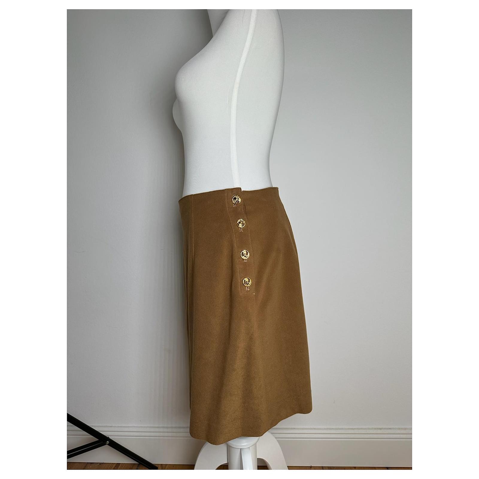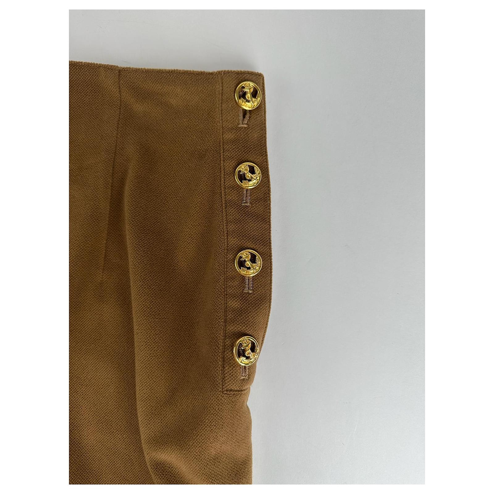 This chic skirt is crafted from soft brown wool and features four gold-tone steel anchor buttons on each side adding a nautical-inspired accent to the classic silhouette.