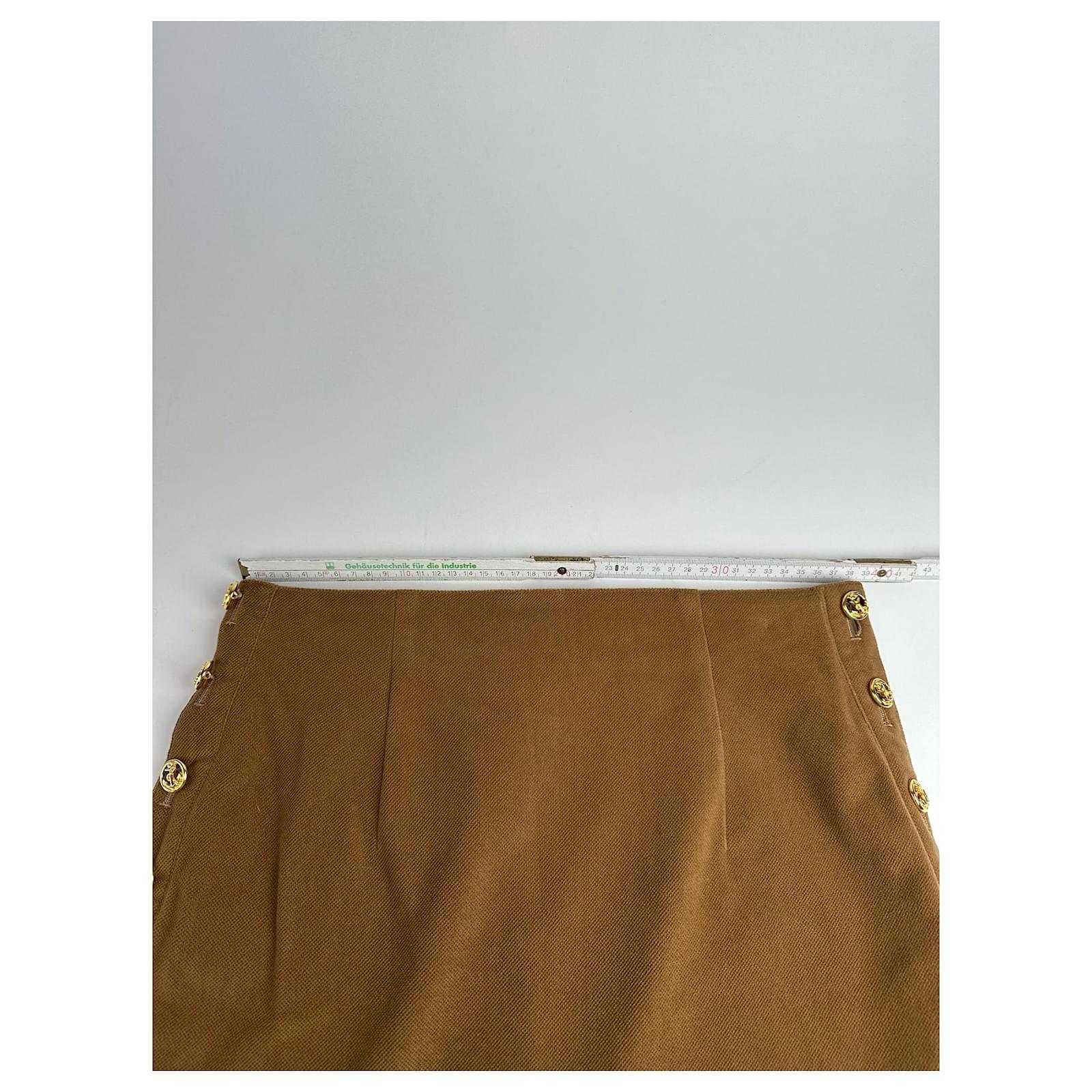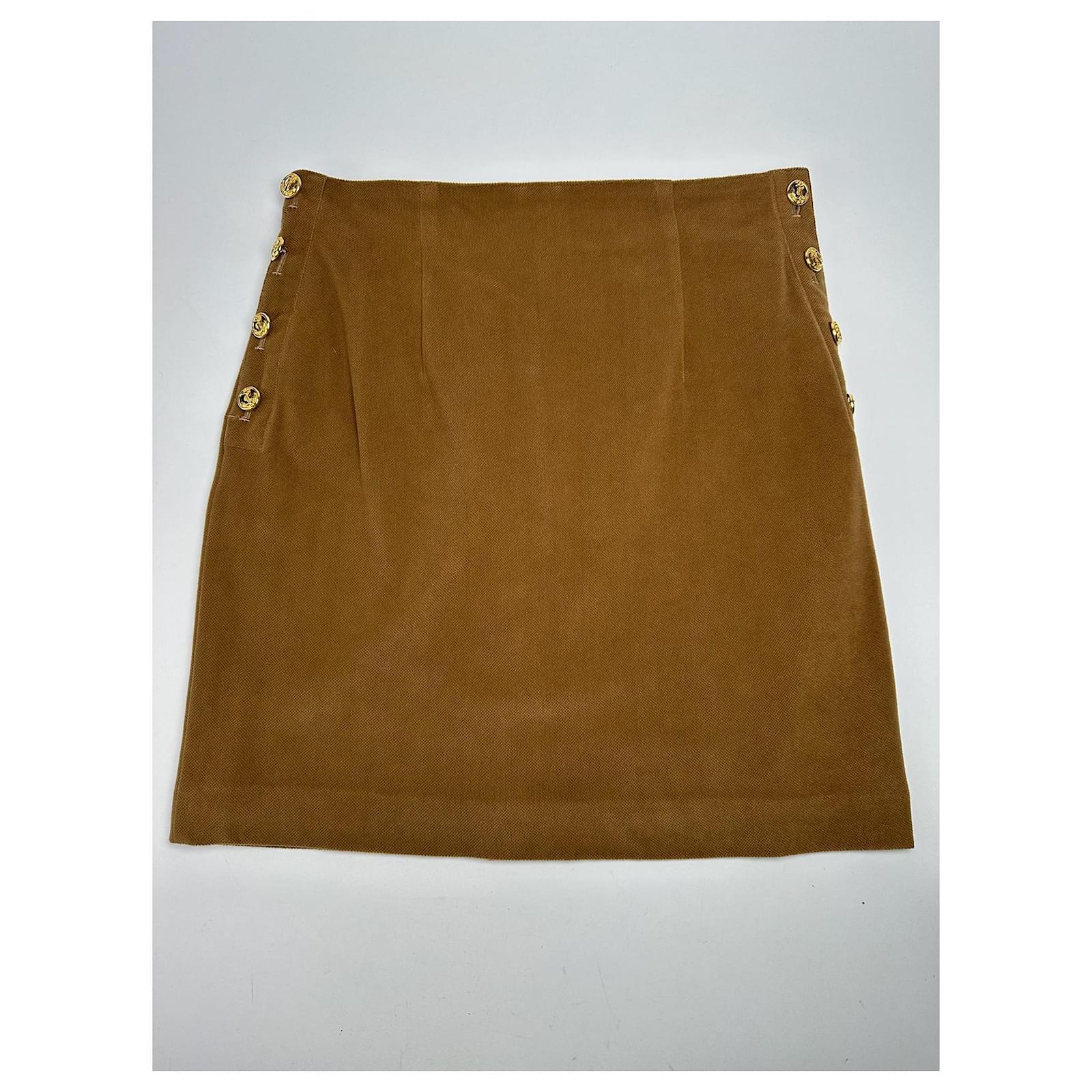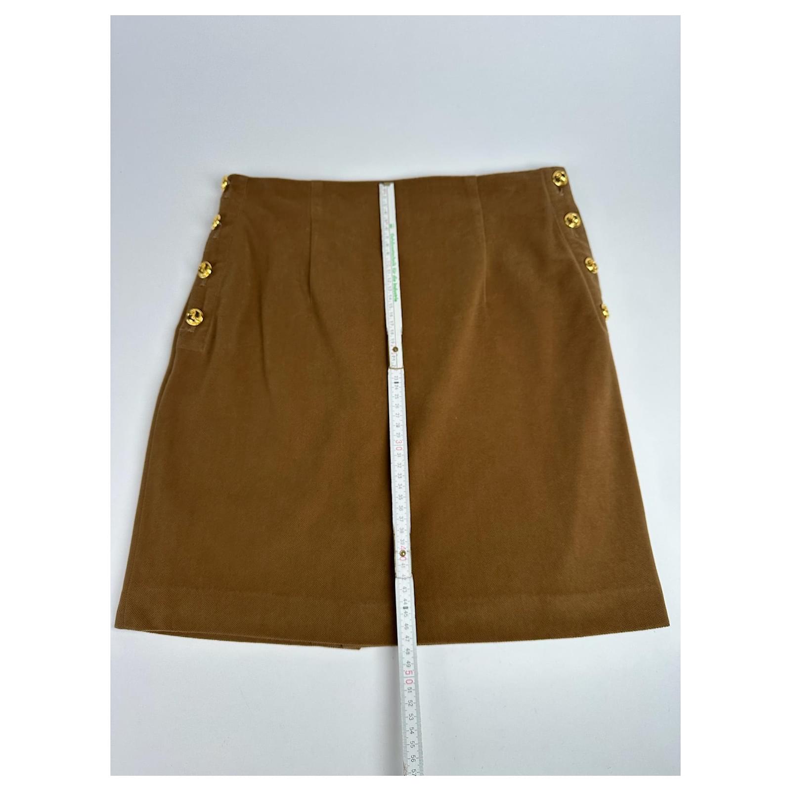 This chic skirt is crafted from soft brown wool and features four gold-tone steel anchor buttons on each side adding a nautical-inspired accent to the classic silhouette.