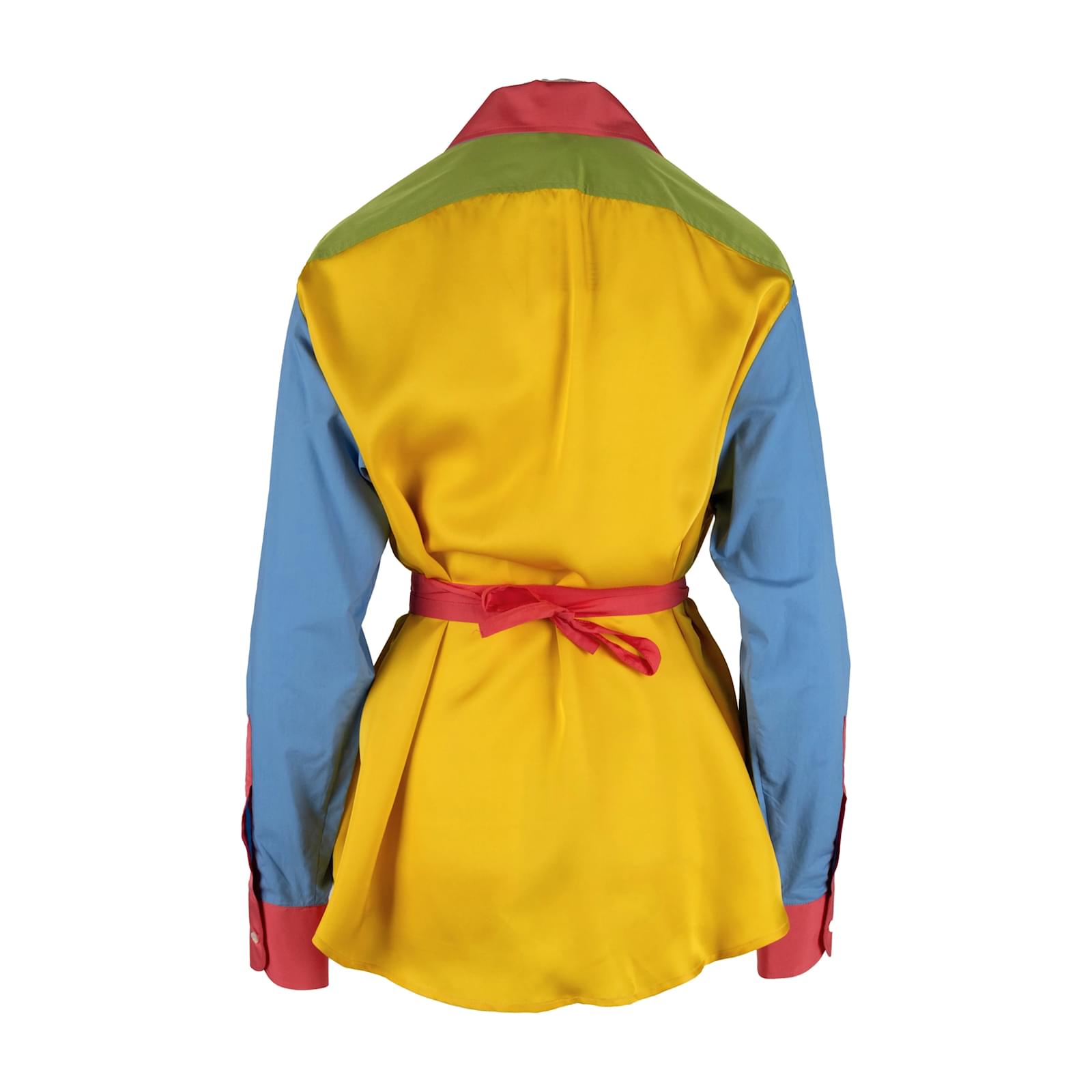 Double button shirt: adjustable waist with fabric strap, classic or crisscross. Made of yellow satin silk, with light blue cotton poplin sleeves and front patch pocket in striped cotton poplin. Collar, yoke, cuffs and strap in acid green and fuchsia polyester fabric. Natural mother-of-pearl buttons.