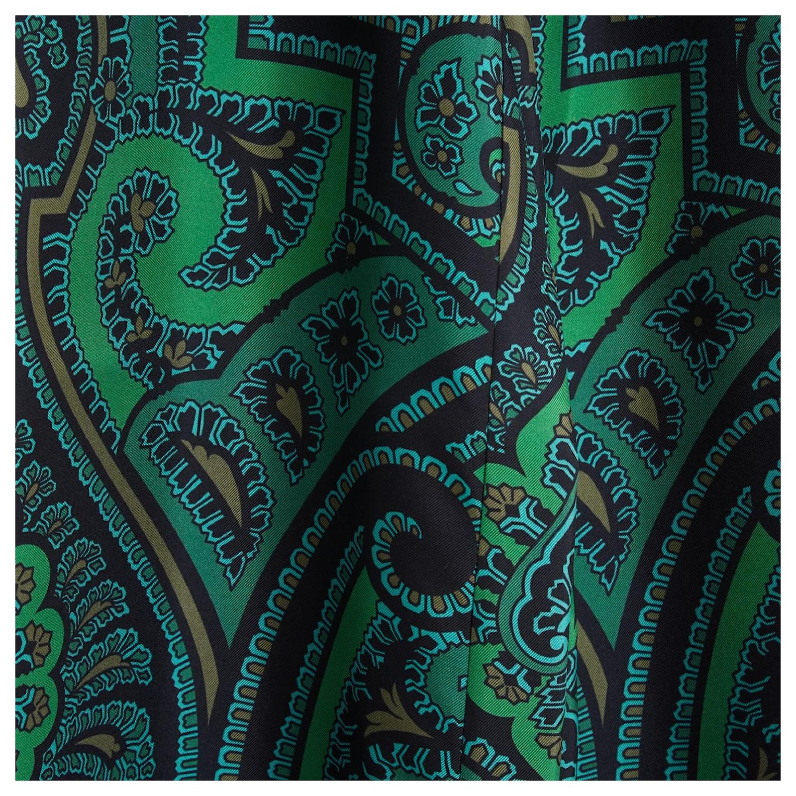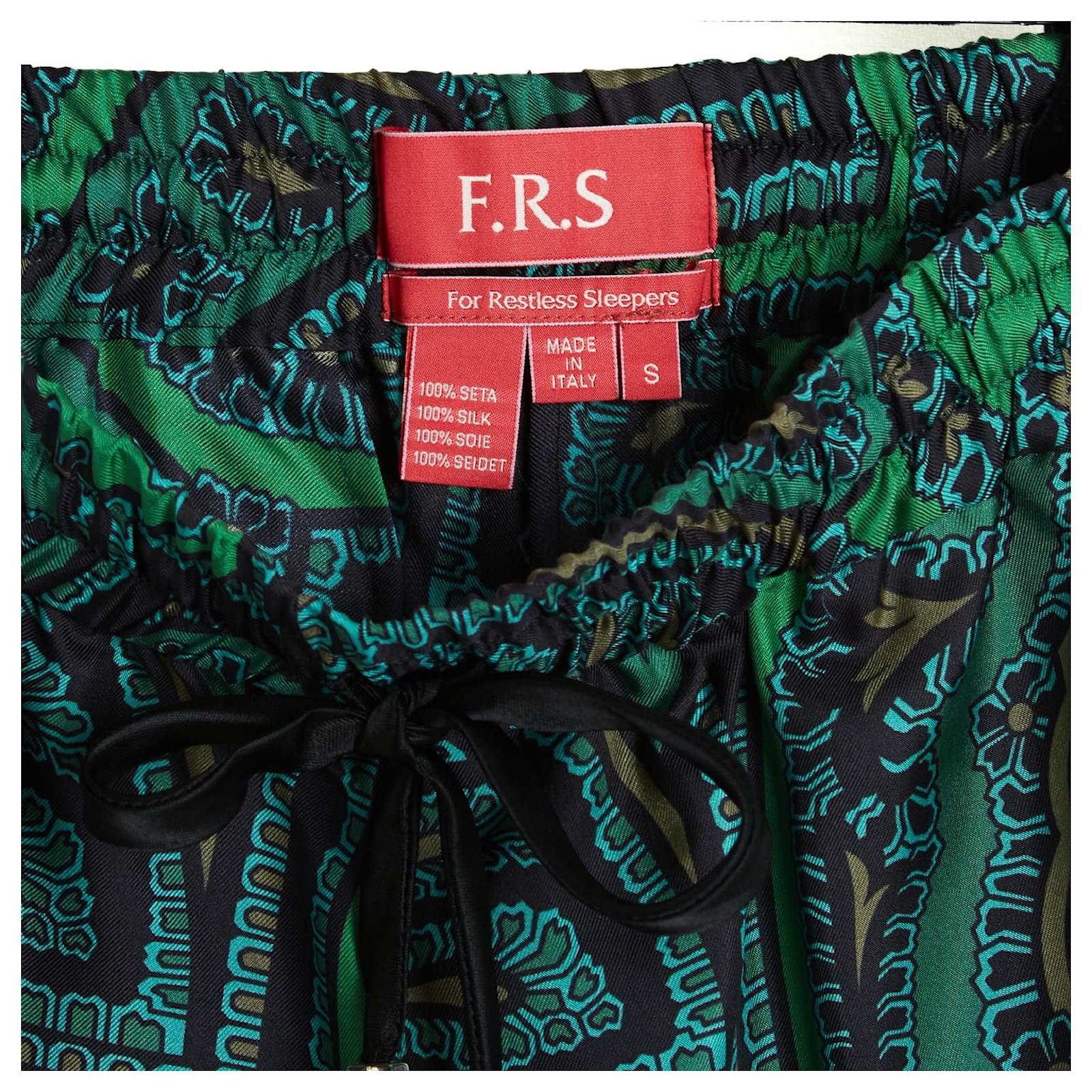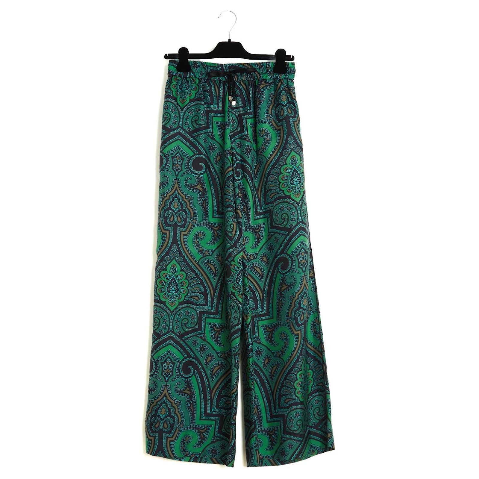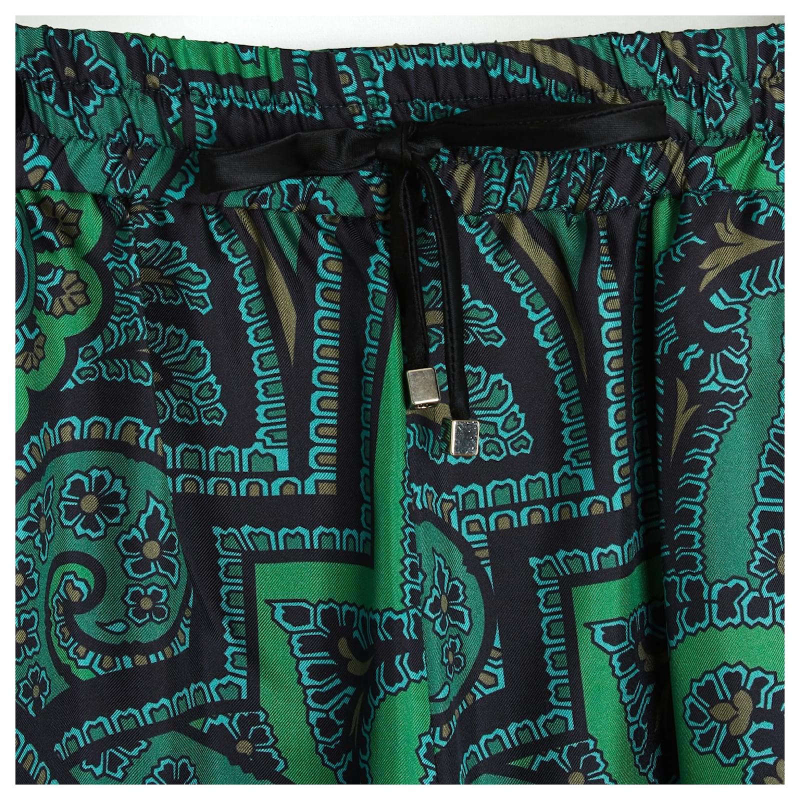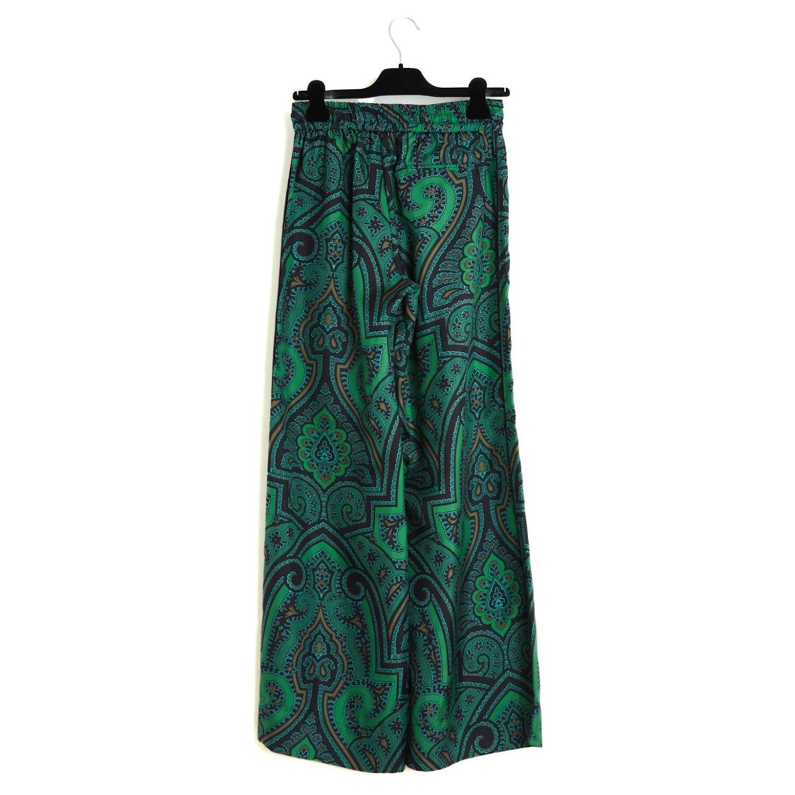 F.R.S For Restless Sleepers large flared palazzo style pants in silk twill with boteh or fair isle pattern in shades of green and black, high elastic waistband lined with a drawstring, 2 side slit pockets, unlined. Size S or 36FR: waist (unstretched elastic) 34 cm, rise 29 cm, inseam 81 cm, total length 109 cm, bottom leg width 38 cm. The pants are in excellent condition, super comfortable and super chic.