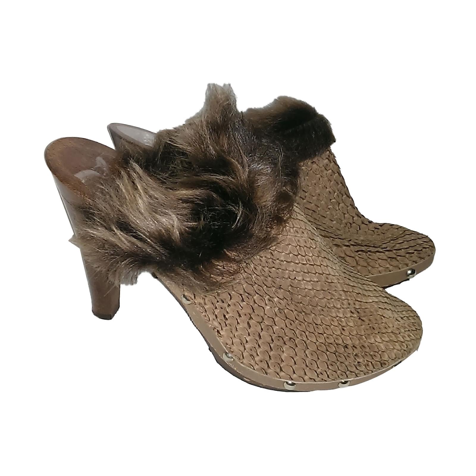 Pretty clogs in exotic leather and filled entirely with real fur, wooden sole. Nails golden color. Heel about 11 cm