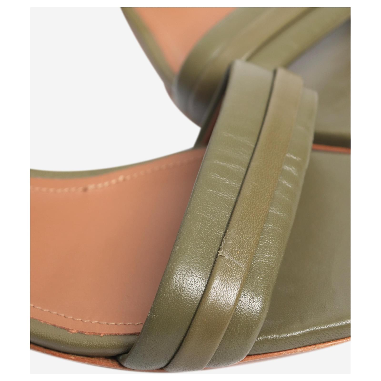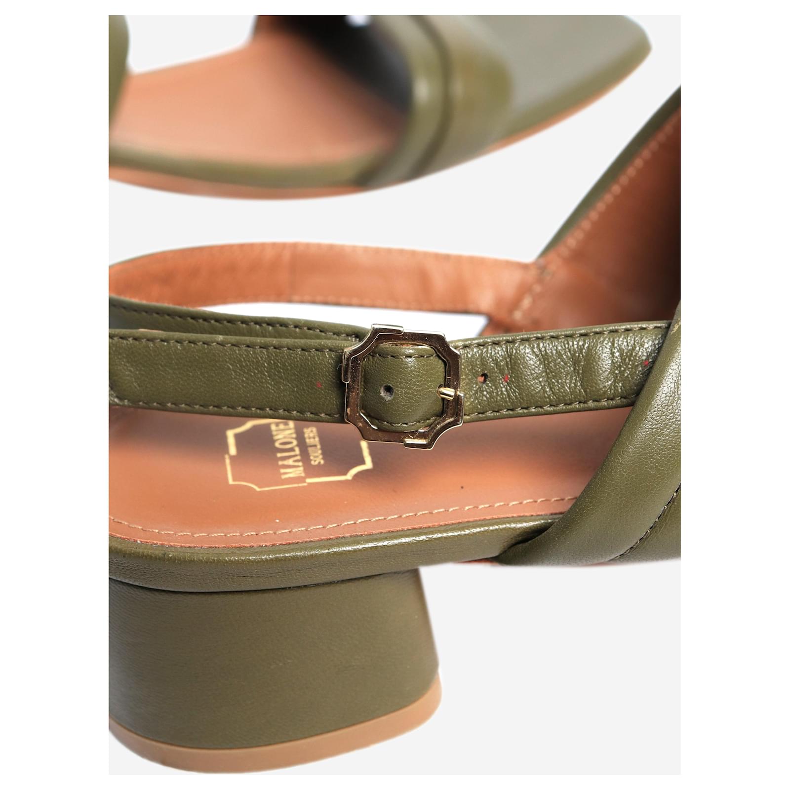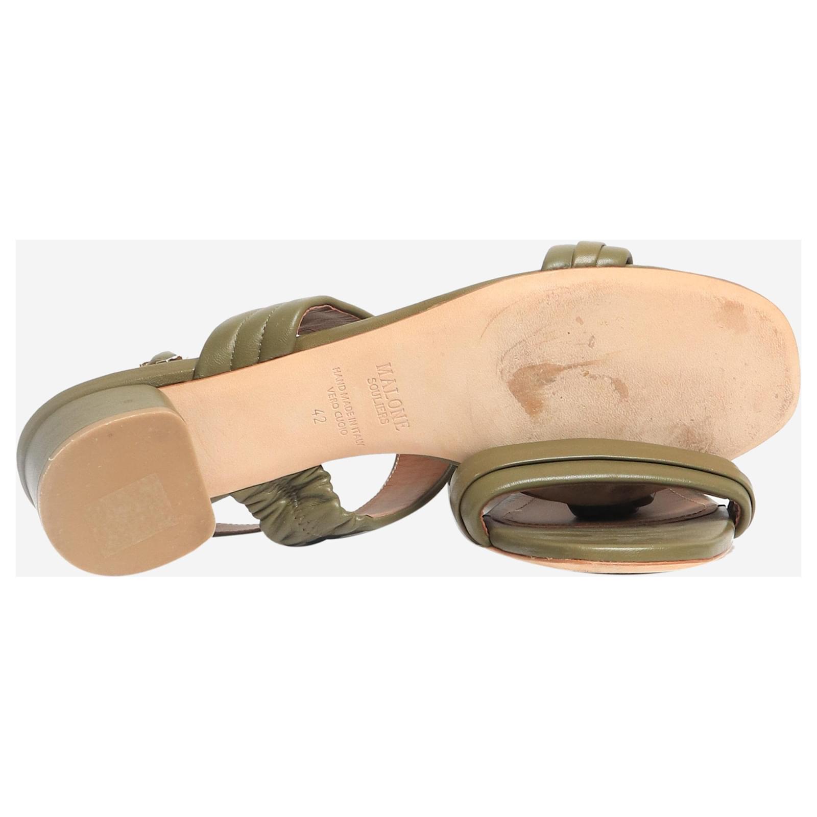 Malone Souliers khaki leather sandal heels. Condition: This item is in very good pre-owned condition, showing no significant signs of wear. Size: EU 42 (UK 9) Material: Leather Heel height: 3.5 cm
