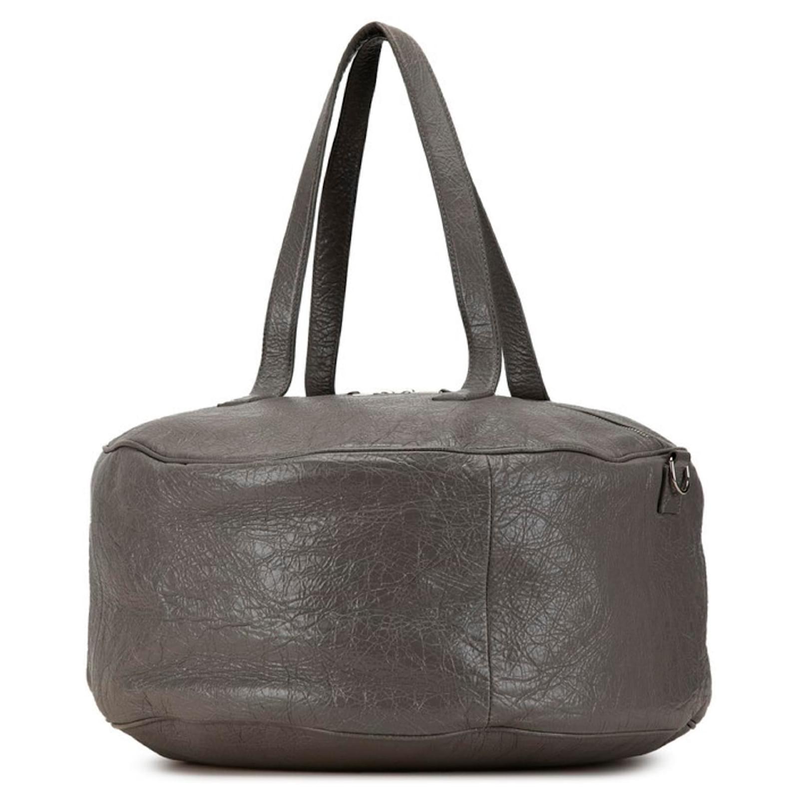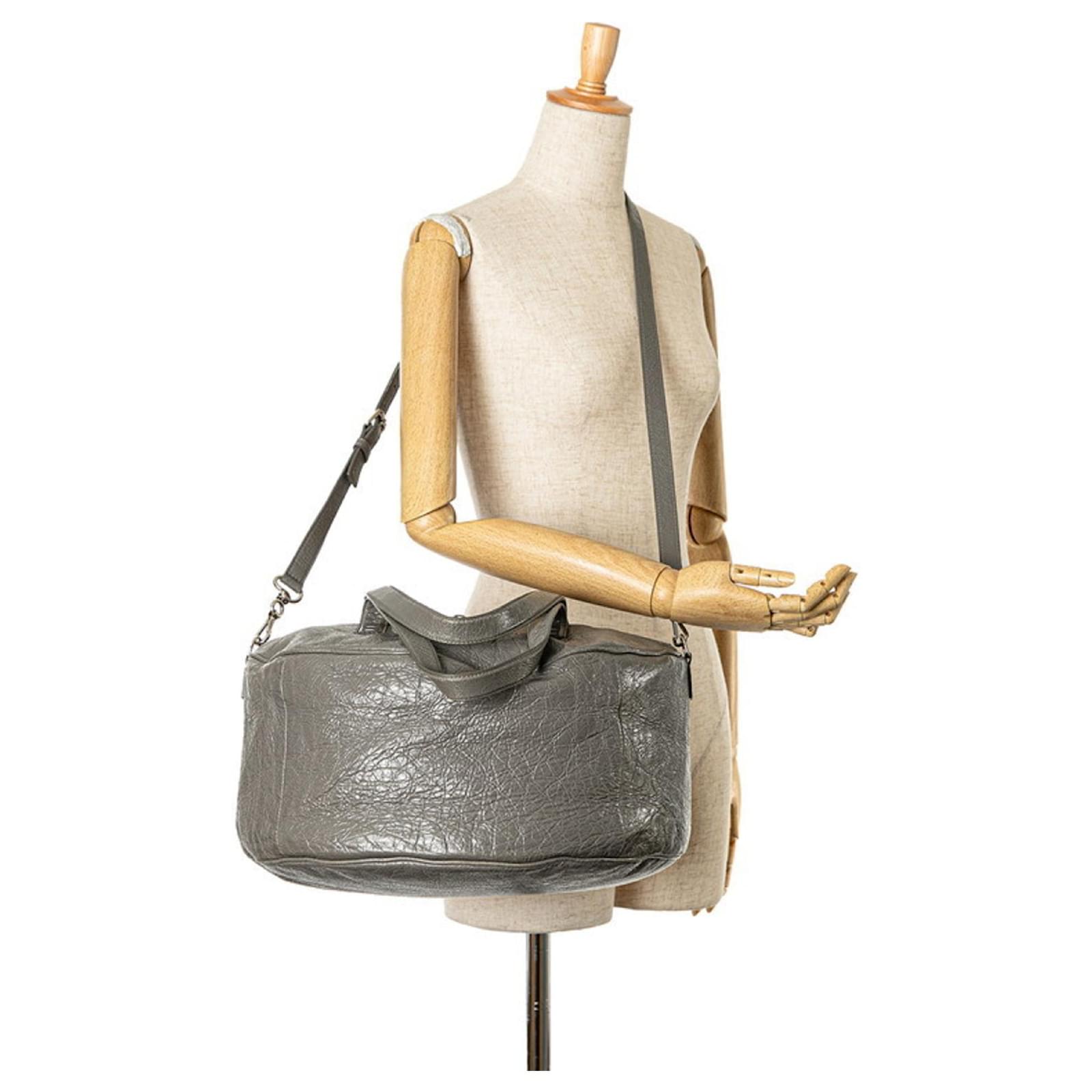 The Balenciaga Air Hobo Boston Bag is a stylish shoulder bag crafted from gray leather. With dimensions of 17cm in height, 37cm in width, and 37cm in depth, it offers ample space for daily essentials. This used bag is in good condition, showing slight traces of usage, including minor scratches and dirt, as well as slight peeling on the strap and a small crack on the handle. It comes with a shoulder strap for versatile carrying options. Potential buyers are encouraged to review the provided images for a detailed view of the item's condition and included accessories.