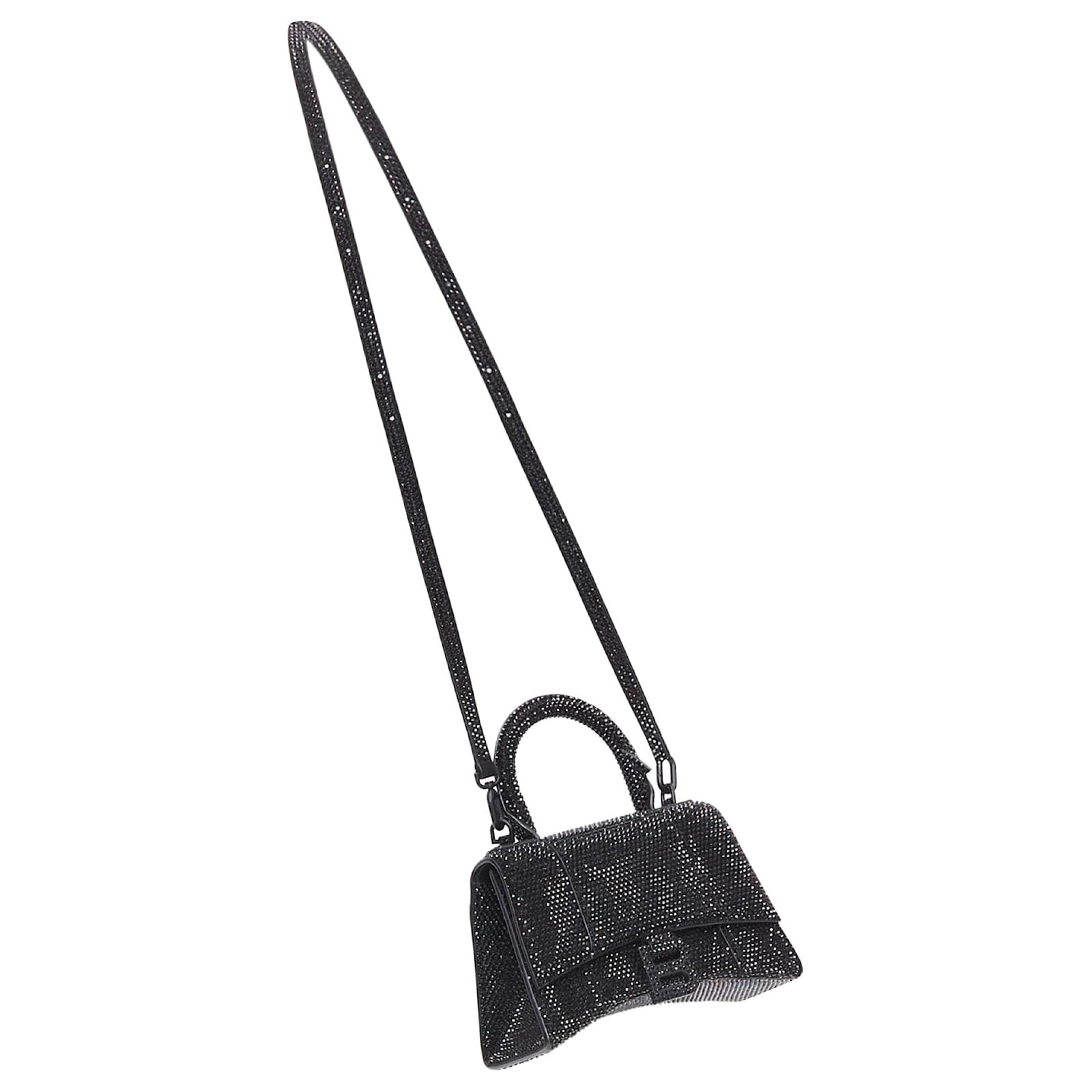 BALENCIAGA Demna Hourglass XS black strass crystal leather crossbody bagReference: LNKO/A02467Brand: BalenciagaDesigner: DemnaModel: Hourglass XSAs seen on: Kim KardashianMaterial: LeatherColor: BlackPattern: SolidClosure: MagnetLining: Black LeatherExtra Details: Calfskin leather and rhinestone crystals. Curvilinear base. Single top handle. Adjustable and removable crossbody strap. Studded magnetic closure. B logo hardware with crystals encrusted. 1 back pocket. Nappa lambskin lining.CONDITION:Condition: Excellent, this item was pre-owned and is in excellent condition. Micro overflowing glue at front. Scuffed inside flap by crystals. Micro scuff marks inside.Comes with: Style code present (Generic) One dust bag. MEASUREMENTS: Width (width across base): 19.5cm / 7.6"Height (base to opening): 12cm / 4.7"Depth (side depth): 11.5cm / 4.5"Handle drop: 8.5cm / 3.3"Strap drop: 56cm / 21.8"Measurments: width: 115 mm length: 195 mm height: 120 mm strap length: 560 mm handle drop: 85 mm