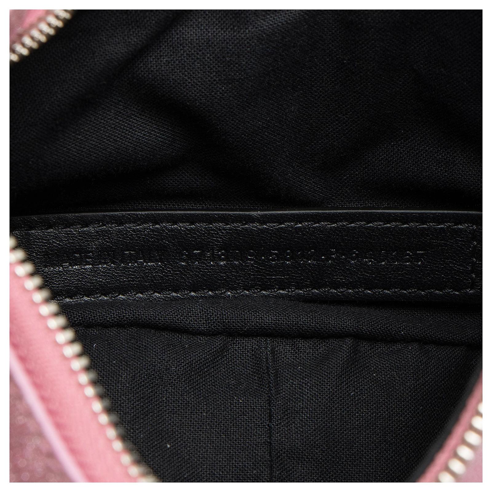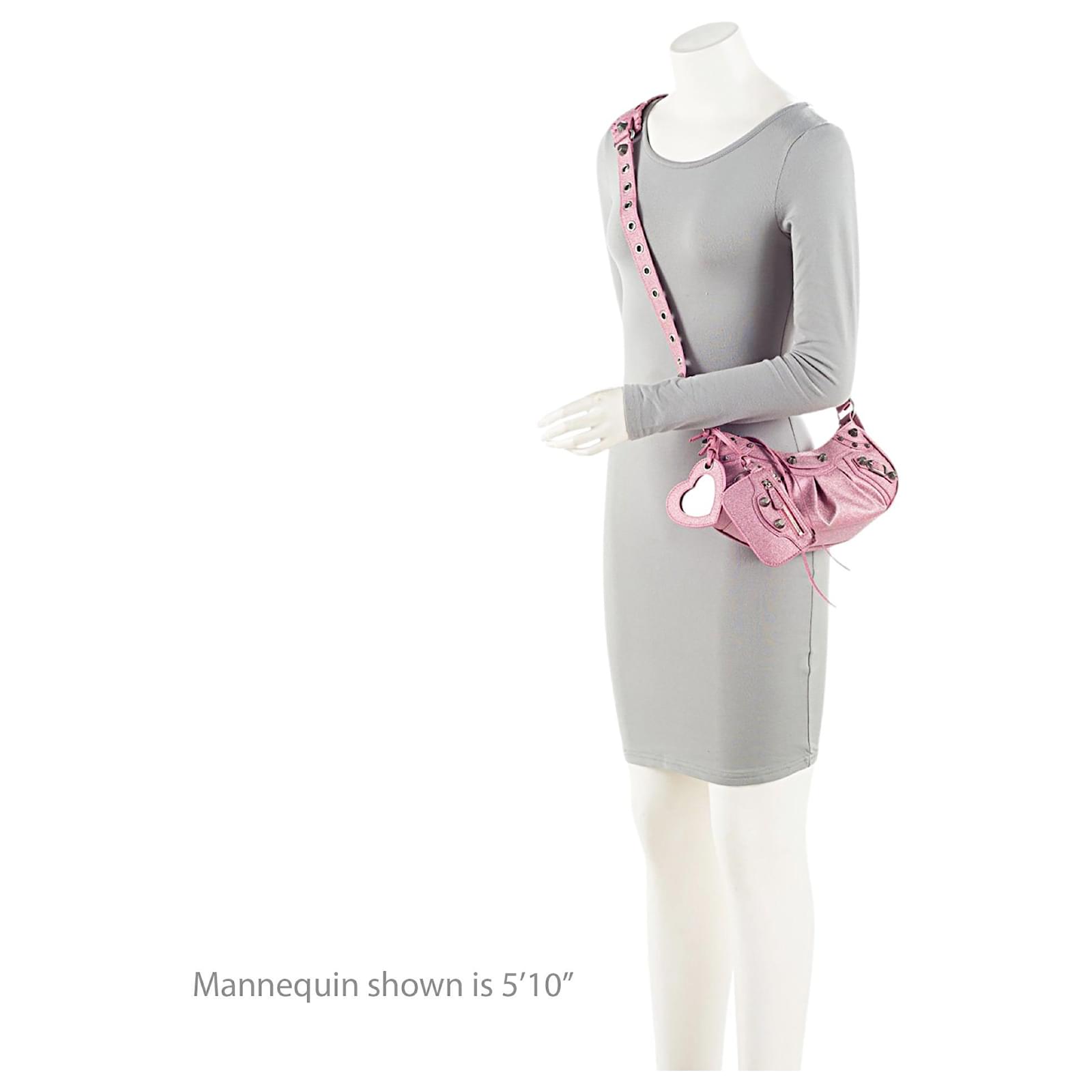 Founded in San Sebastian, Spain in 1918, the House of Balenciaga relocated to Paris in 1937 during the Spanish Civil war. Almost immediately Cristóbal was hailed as "the couturier of couturiers." Past designer Nicolas Ghesquiere, had revitalized the company with a youthful aesthetic, introducing the famous motorcycle inspired handbags. Successor to Alexander Wang, current Creative Director Demna Gvasalia upholds the brand’s rejuvenating aesthetic with high-fashion streetwear and graphic-driven styles.Condition Notes: Peeling to shoulder strap base casing. Light surface scratches to hardware.Width (at base): 9.5"Height: 5"Depth: 2.25"Shoulder Strap Drop: 21", AdjustableCirca: 2023Type of Material: Glitter TextileColor: PinkLining: Black Fine TextilePockets: NoneHardware: Silver ToneClosure: ZipperOrigin: ItalyIncludes: Coin Pouch, Detachable Mirror, Dust Bag Measurments: width: 241 mm height: 127 mm strap length: 533.4 mm handle drop: 533.4 mm