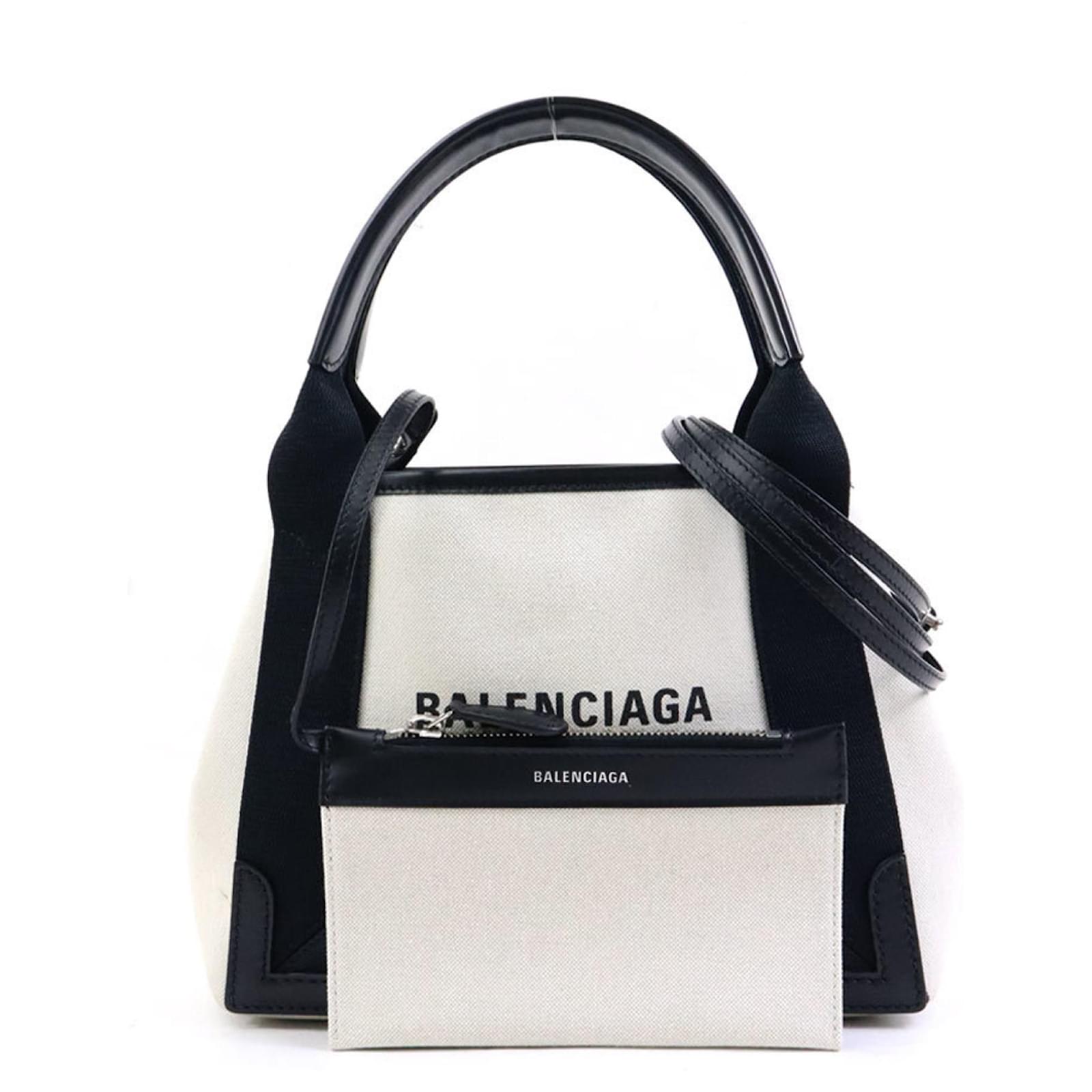 The Balenciaga Handbag Navy Cabas XS is a stylish accessory crafted from a combination of canvas and leather, featuring a black and ivory color scheme. With dimensions of 19cm x 24cm x 7.5cm, this handbag is designed for practicality and elegance.