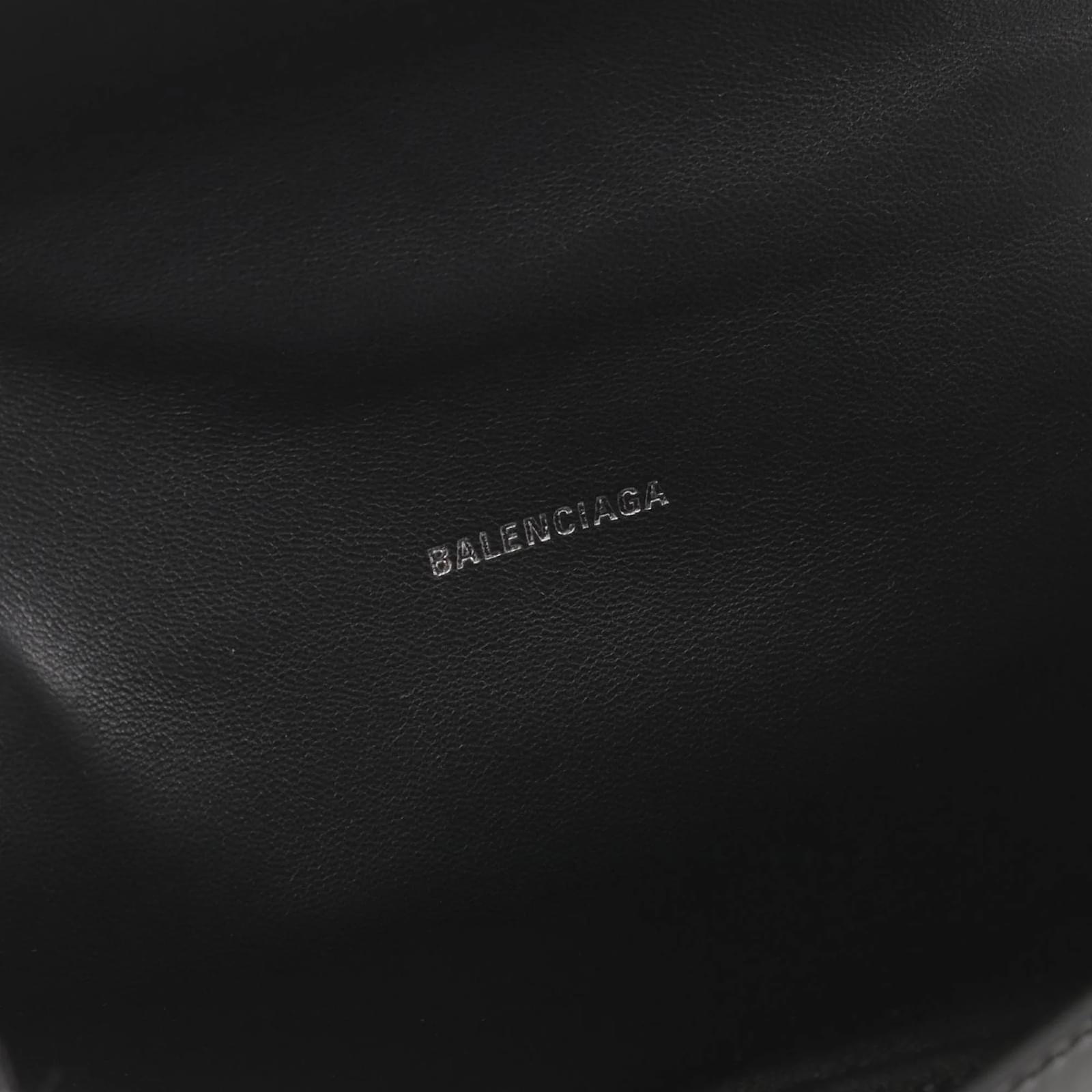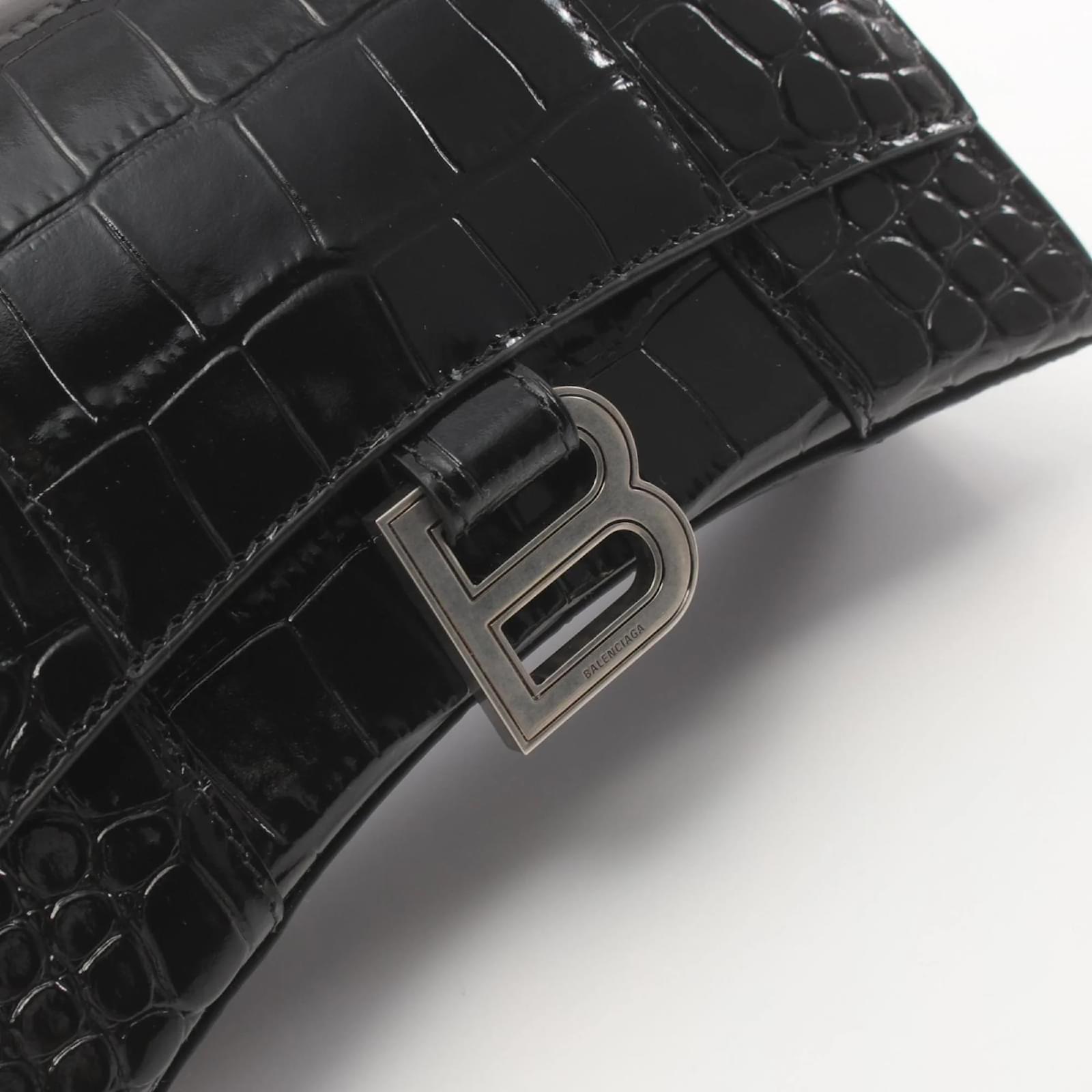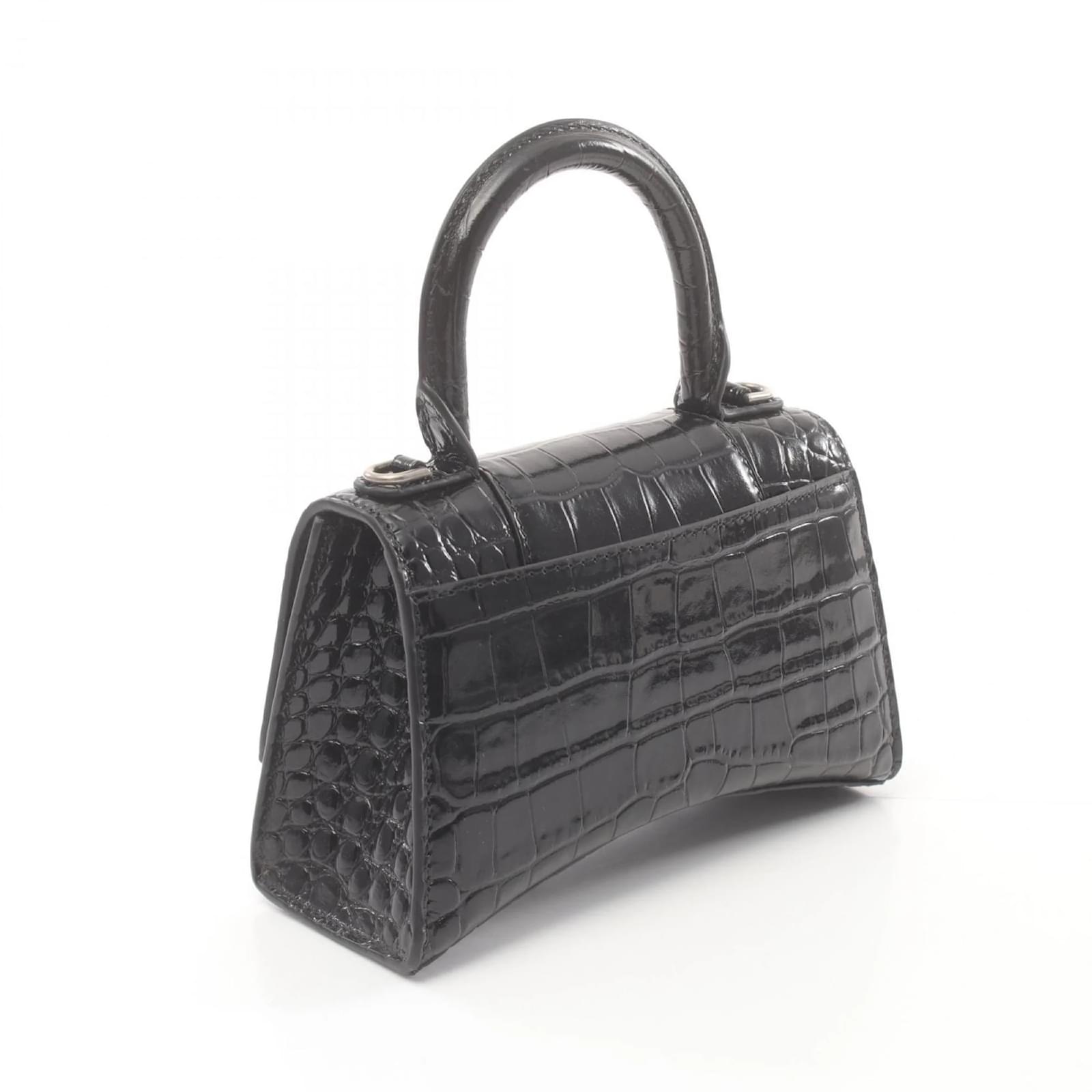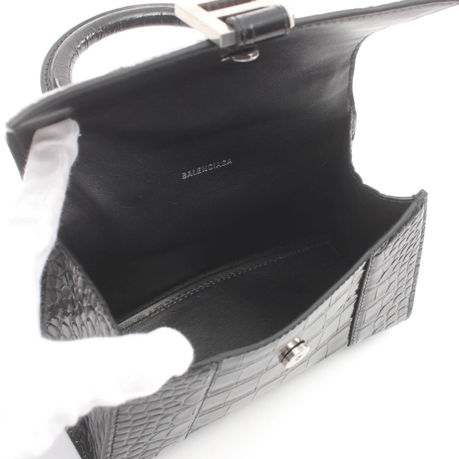 The Balenciaga Hourglass XS Handbag is a stylish accessory crafted from black leather. With dimensions of 12cm x 19cm x 7cm, it is designed for practicality while maintaining a chic appearance. This handbag is in opened but never used condition, classified as Rank N, and shows insignificant traces of use, scratches, or dirt. It comes with a dust bag and a shoulder strap, ensuring you have everything needed for your new purchase. Before buying, please refer to the images for the exact condition and included accessories.